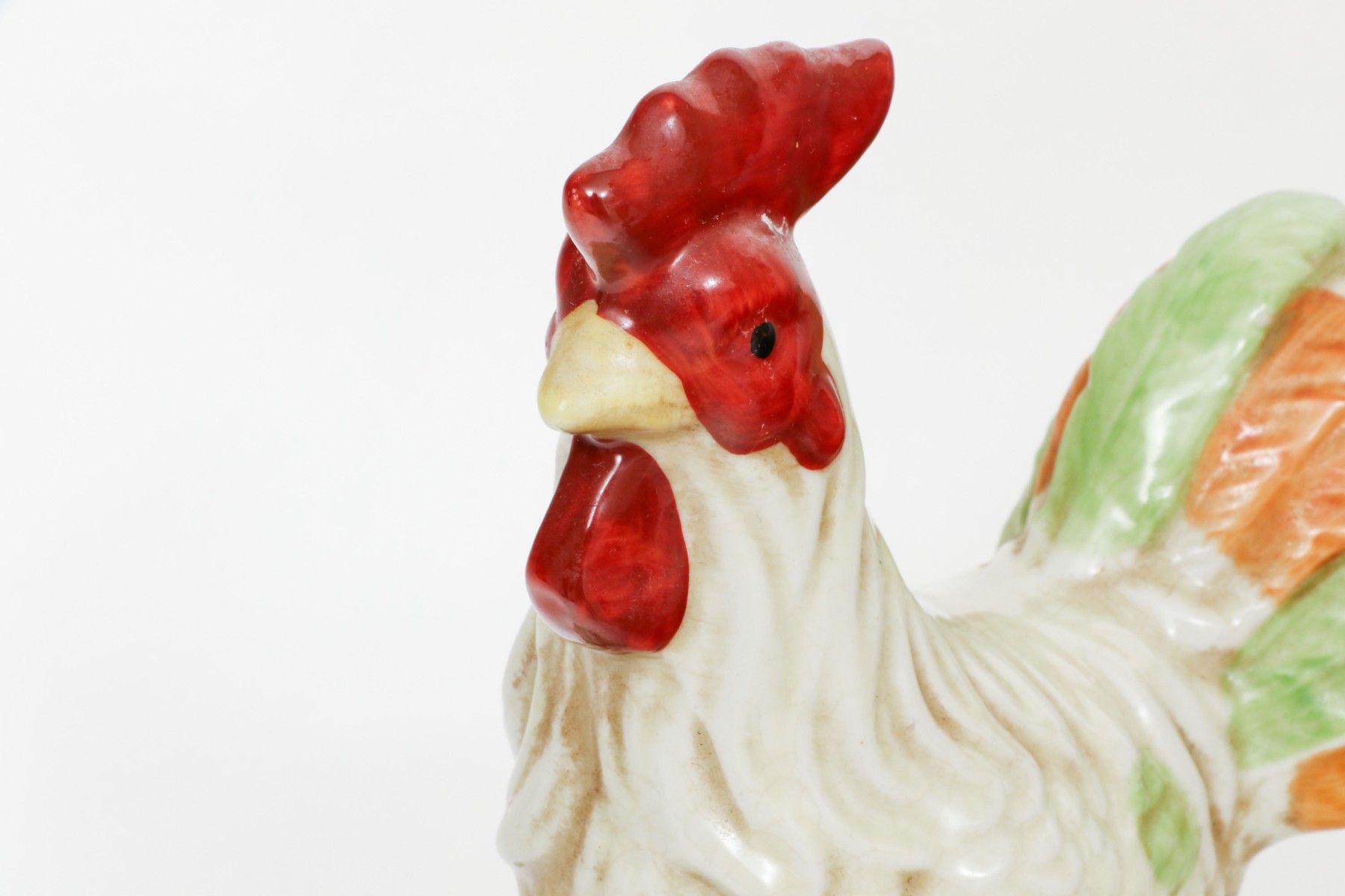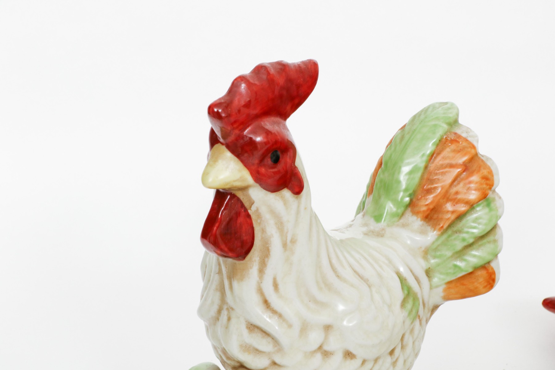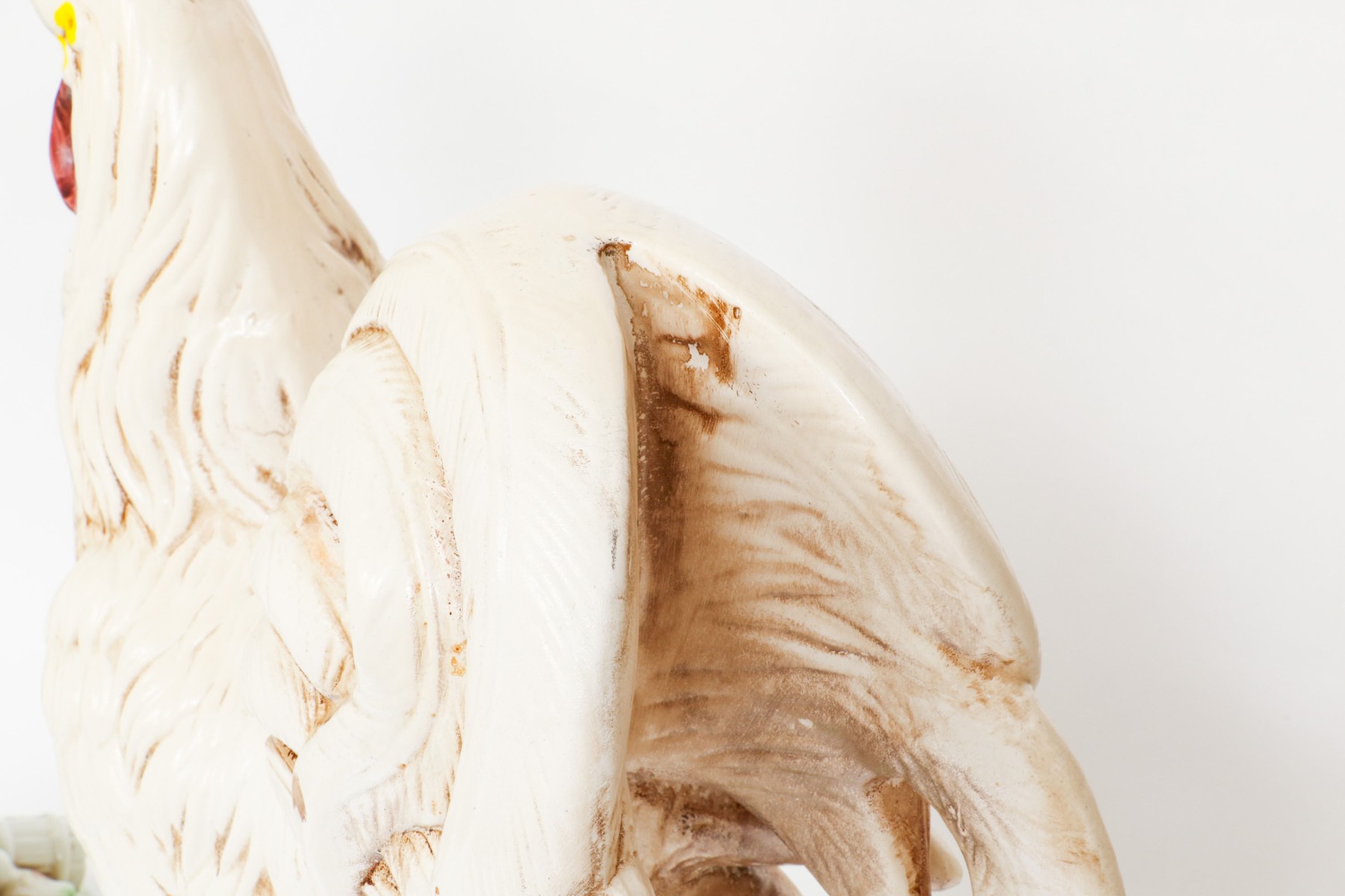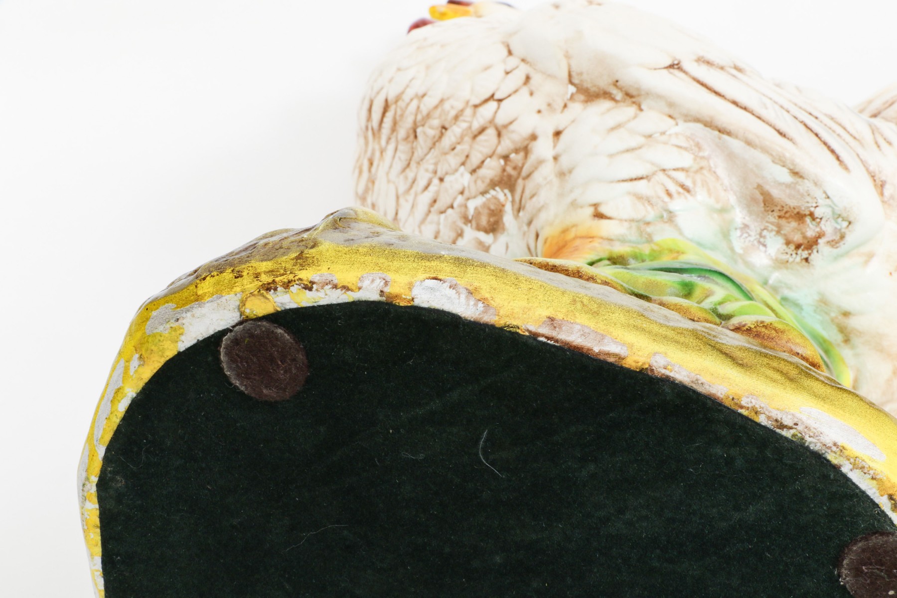 A wonderful garniture trio of Majolica style ceramic rooster figures. Includes two small matching figures and one large statue.