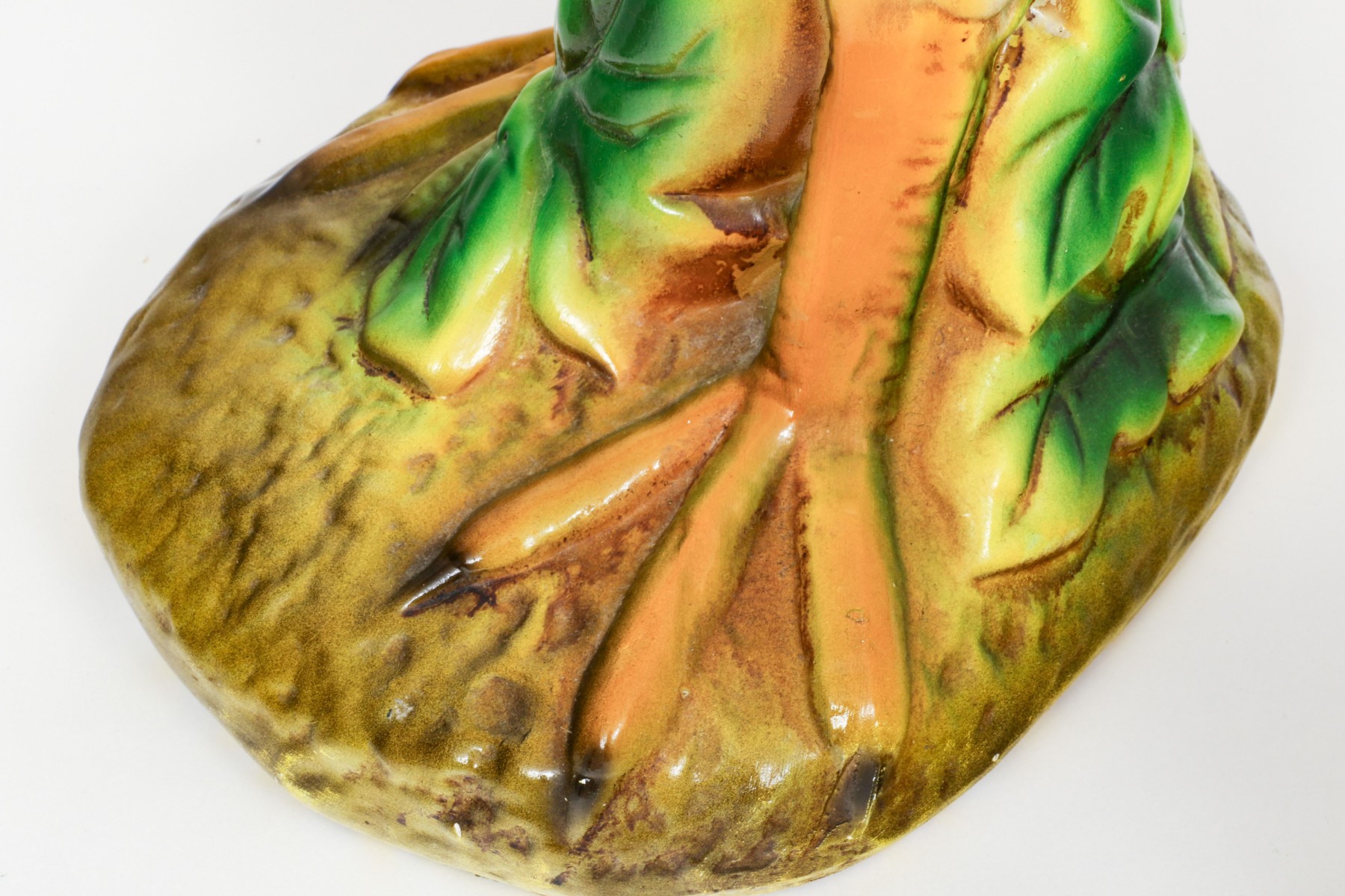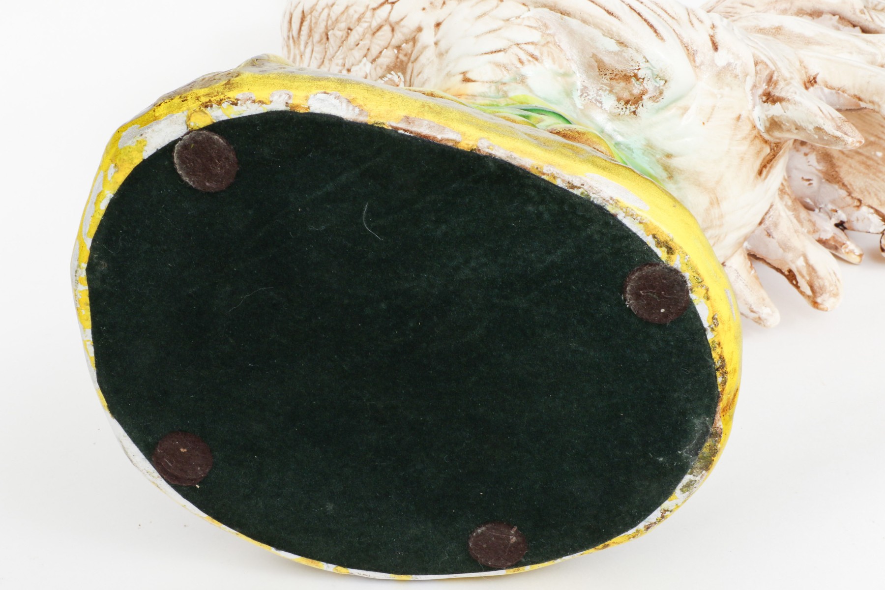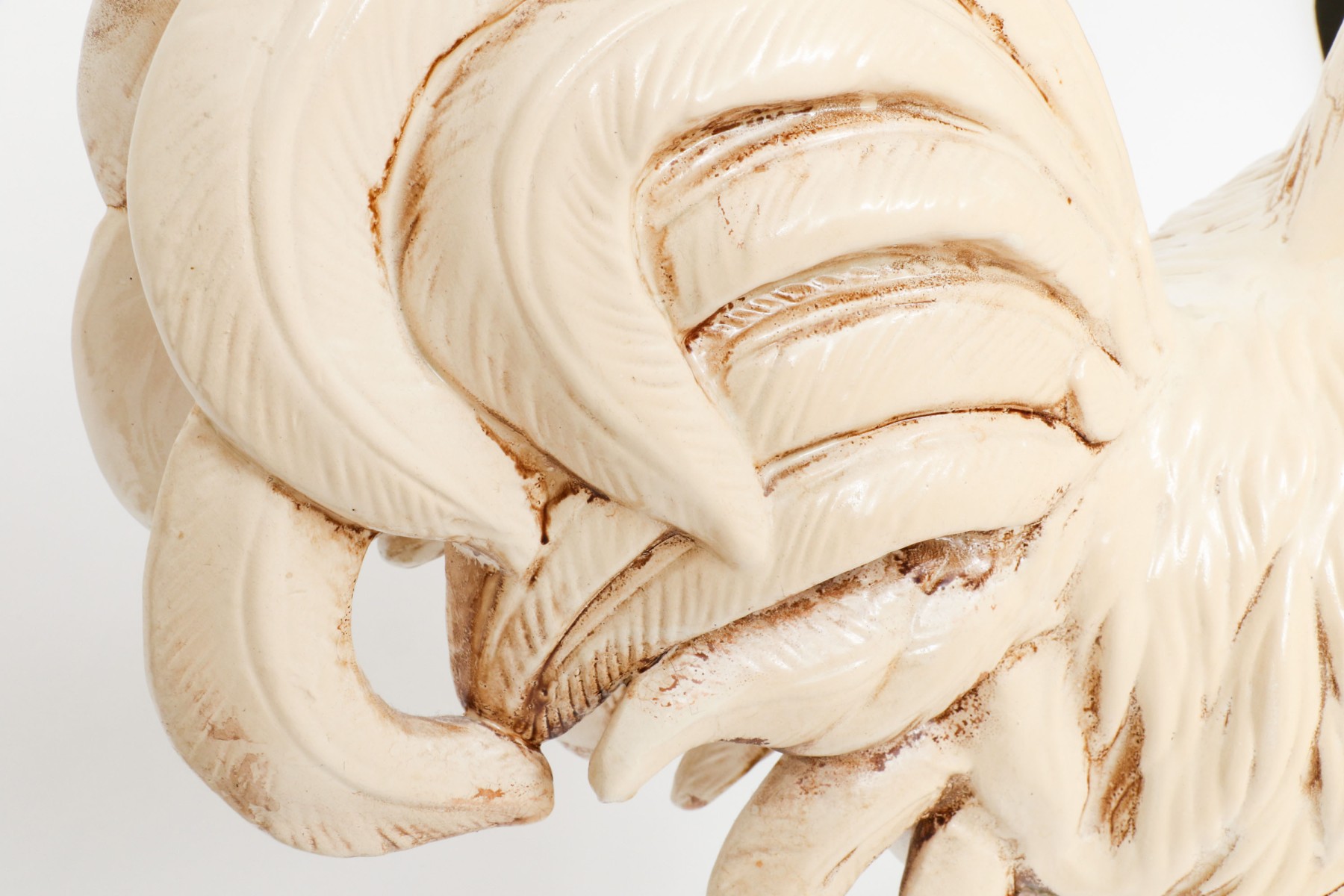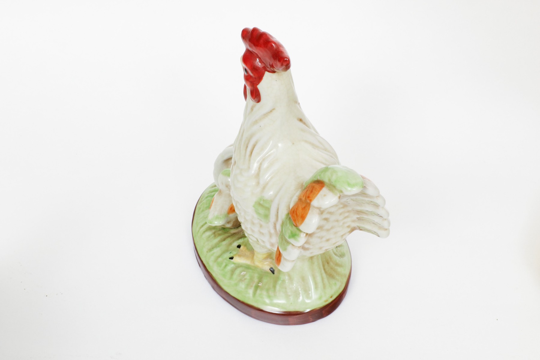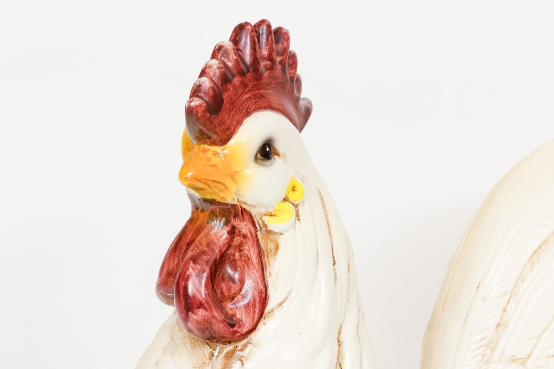 A wonderful garniture trio of Majolica style ceramic rooster figures. Includes two small matching figures and one large statue.