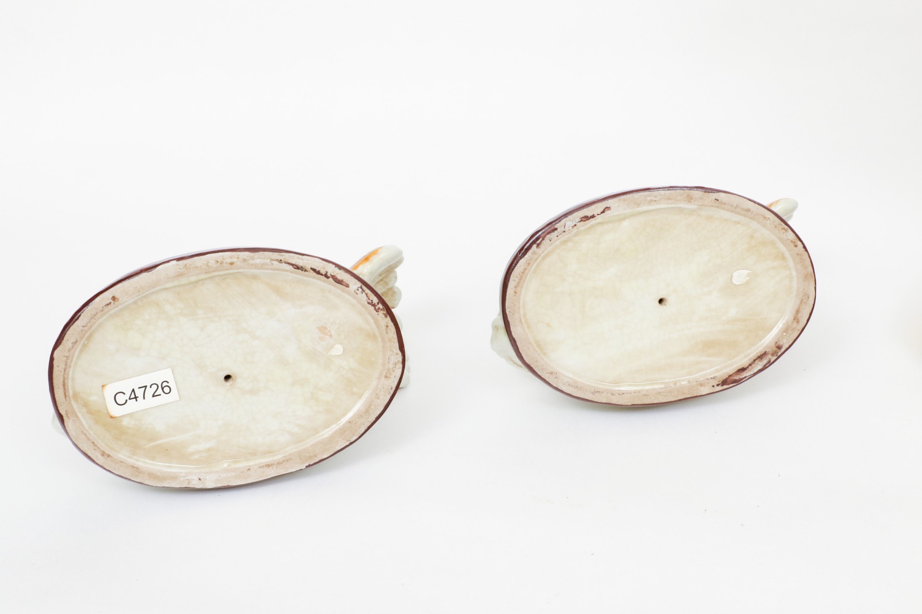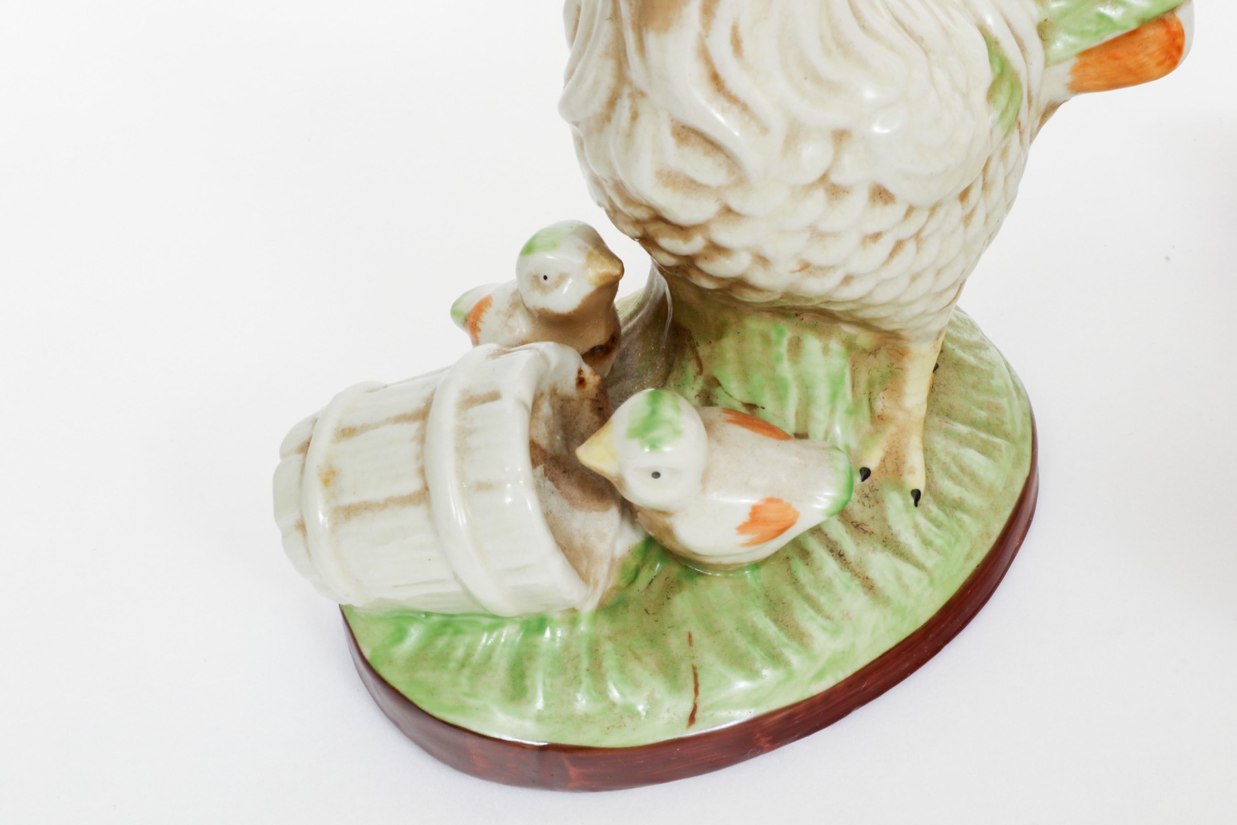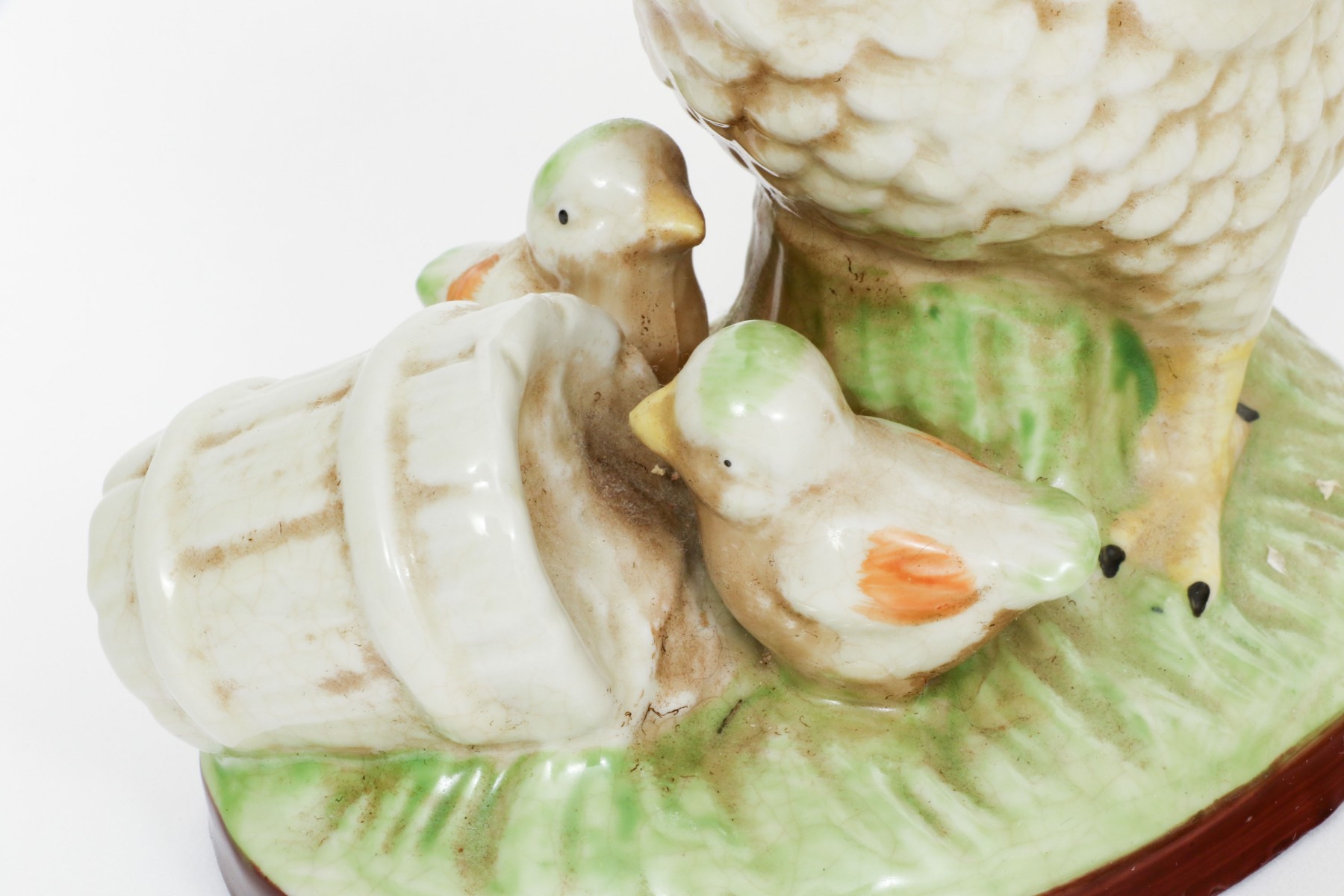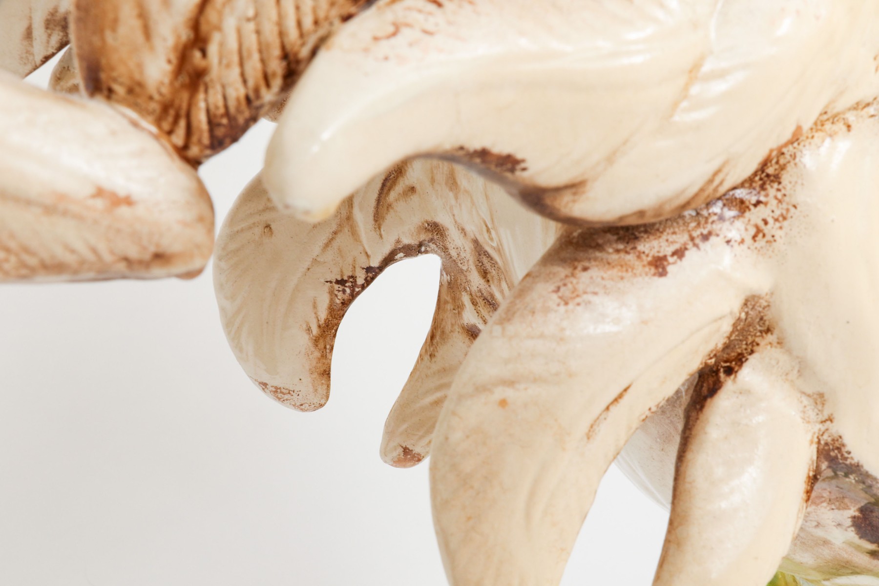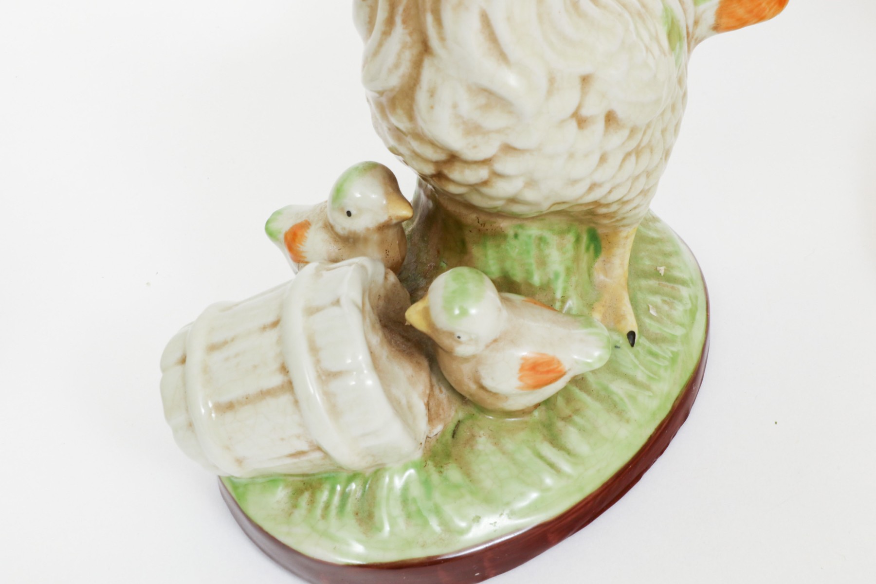 A wonderful garniture trio of Majolica style ceramic rooster figures. Includes two small matching figures and one large statue.