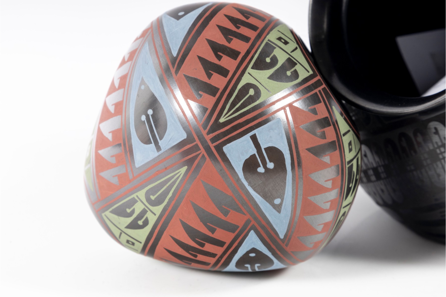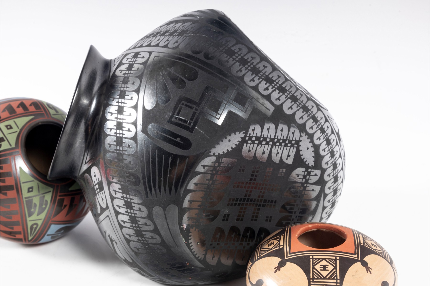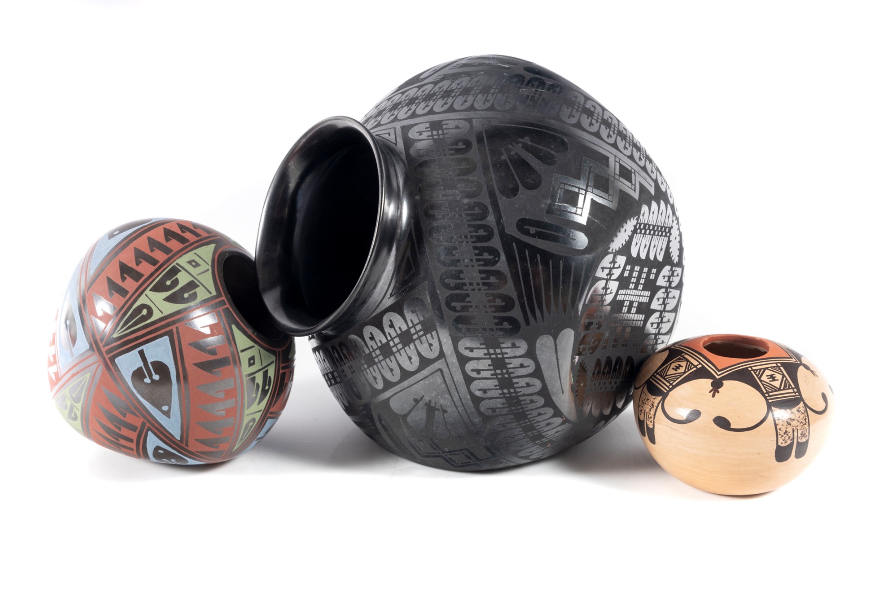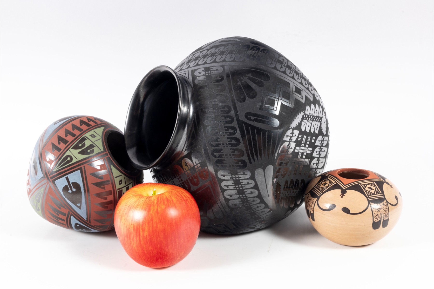 The skilled potters of Mata Ortiz contemporary works of art, often emboldened by Mimbres designs shared by the Southwest, Native American cultures. The largest example shown is finished in an illustrious gloss black, and rests on all four sides as opposed to upright. A small signature resides at the bottom of each item -- all produced by different residents of Mata Ortiz, Chihuahua, Mexico.