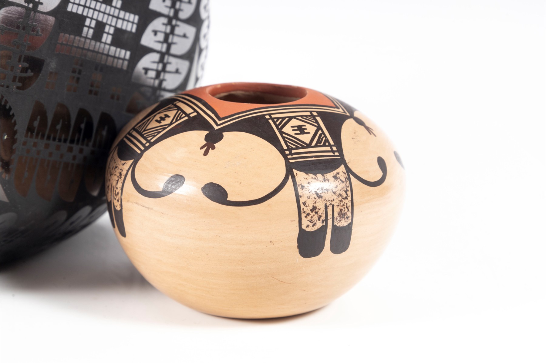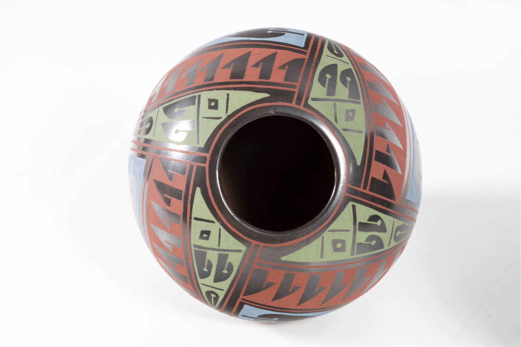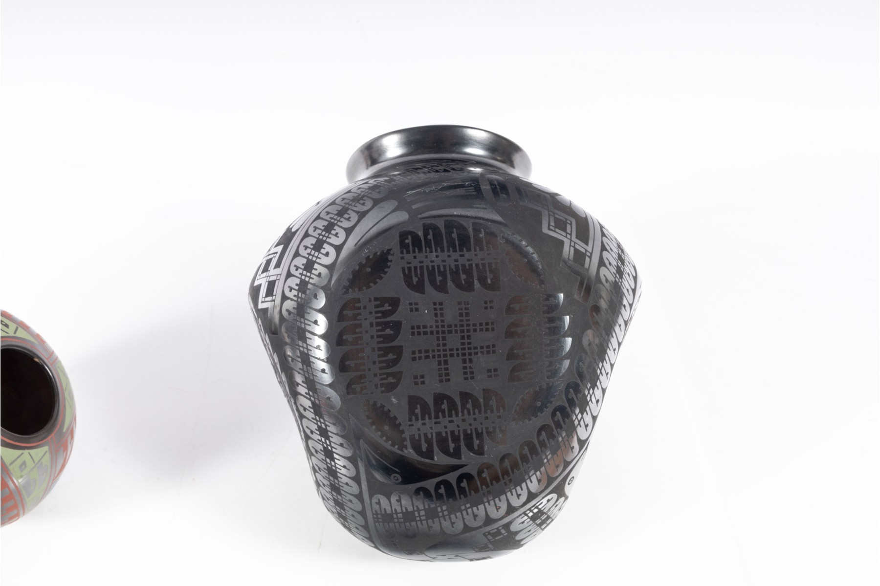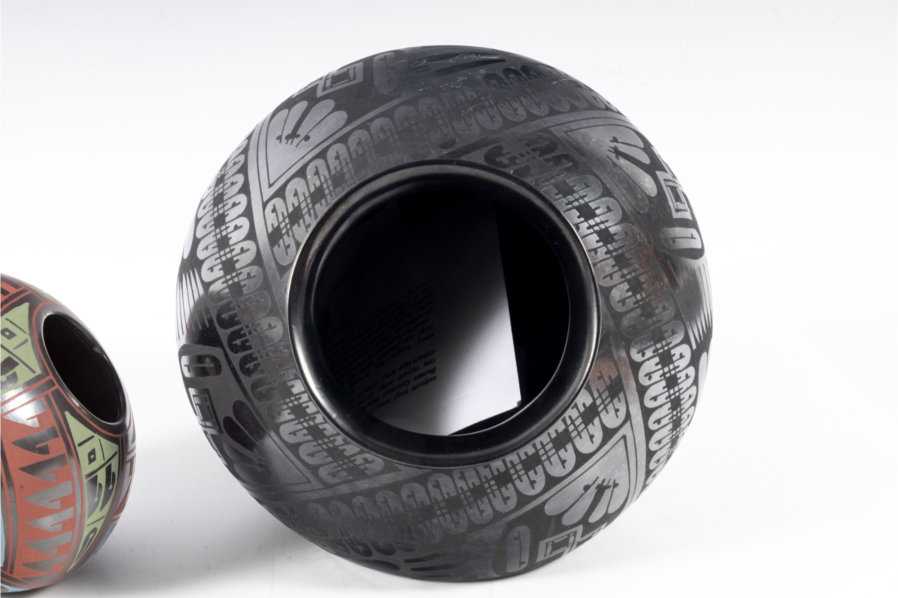 The skilled potters of Mata Ortiz contemporary works of art, often emboldened by Mimbres designs shared by the Southwest, Native American cultures. The largest example shown is finished in an illustrious gloss black, and rests on all four sides as opposed to upright. A small signature resides at the bottom of each item -- all produced by different residents of Mata Ortiz, Chihuahua, Mexico.