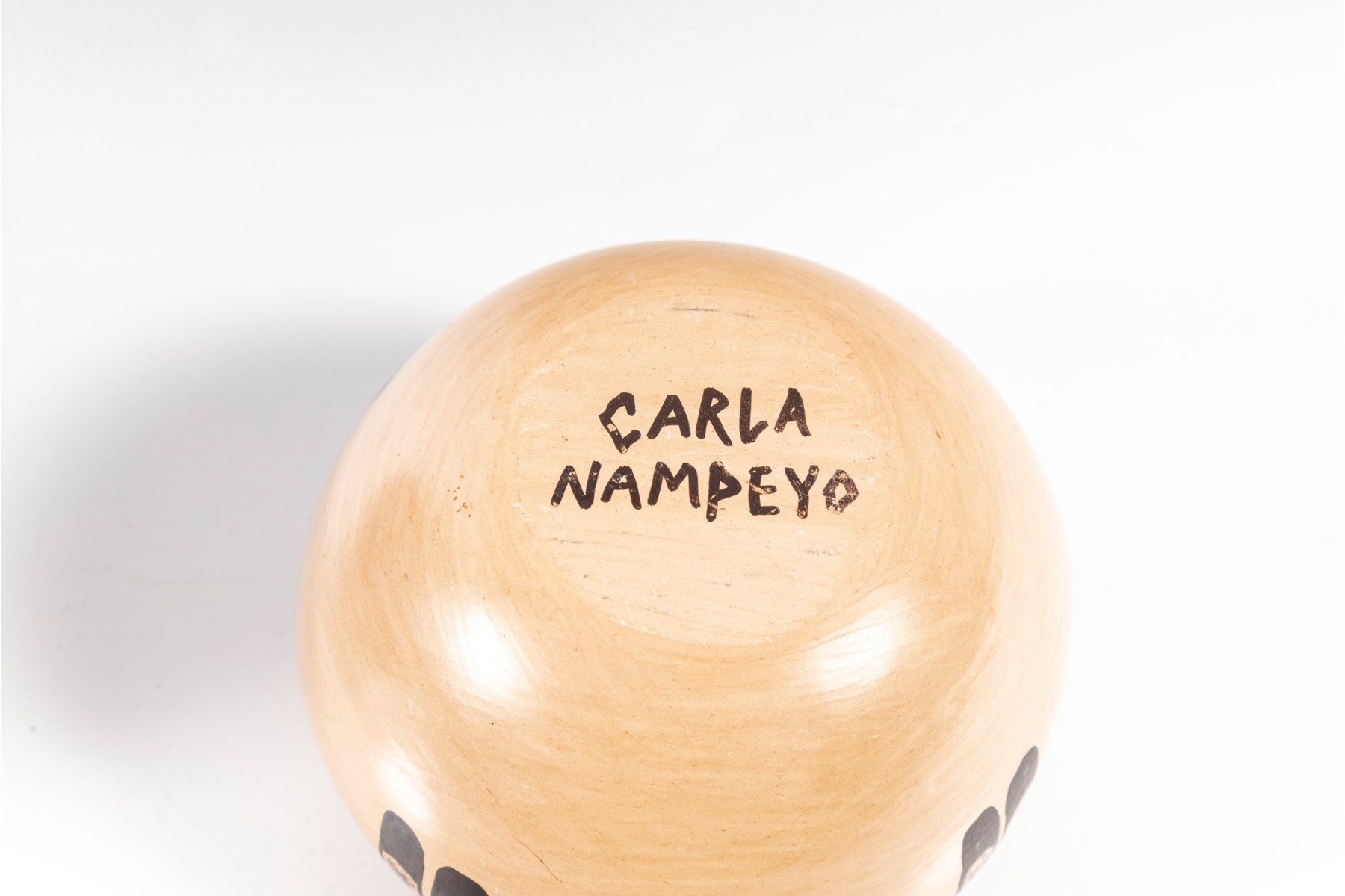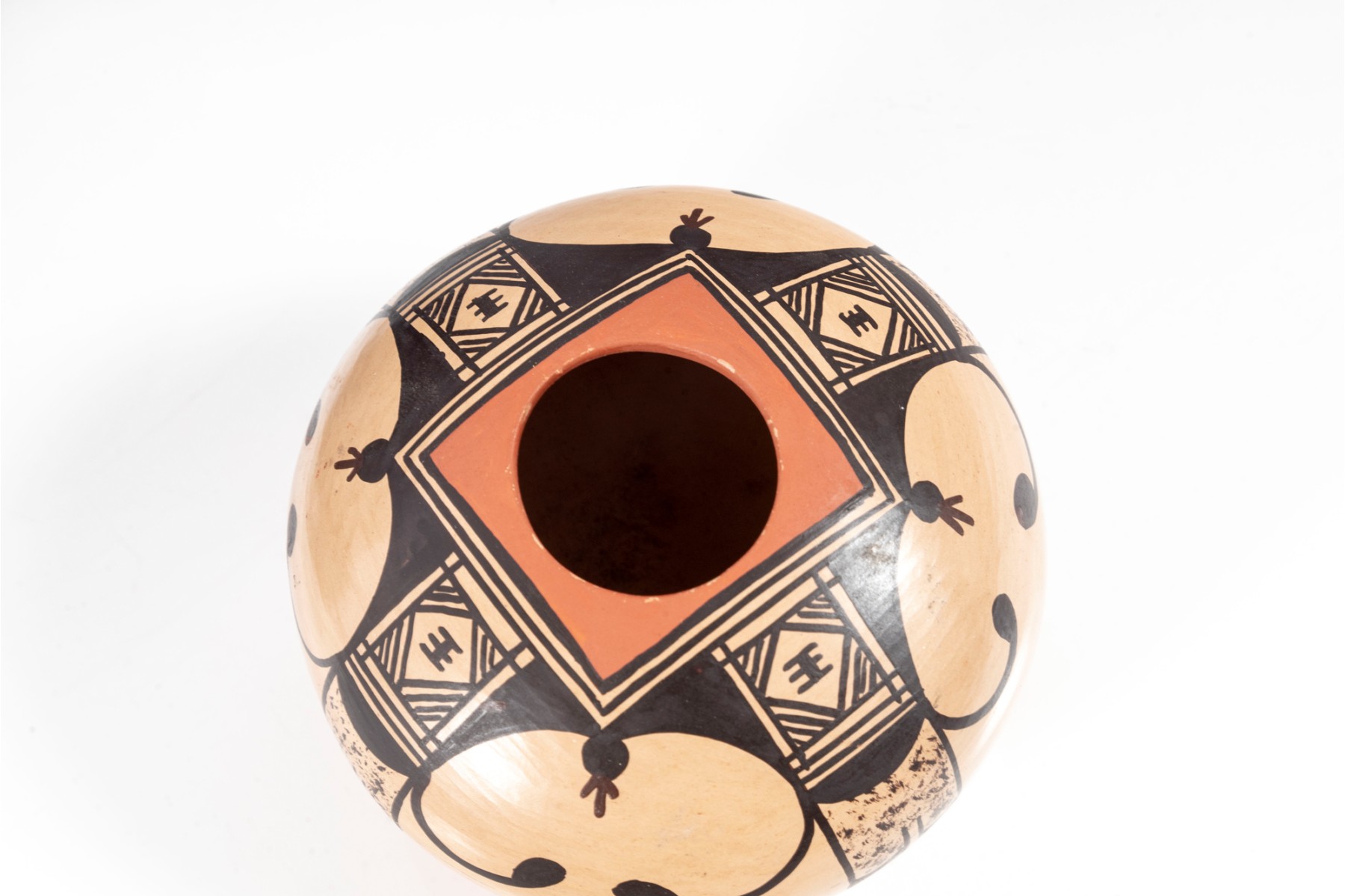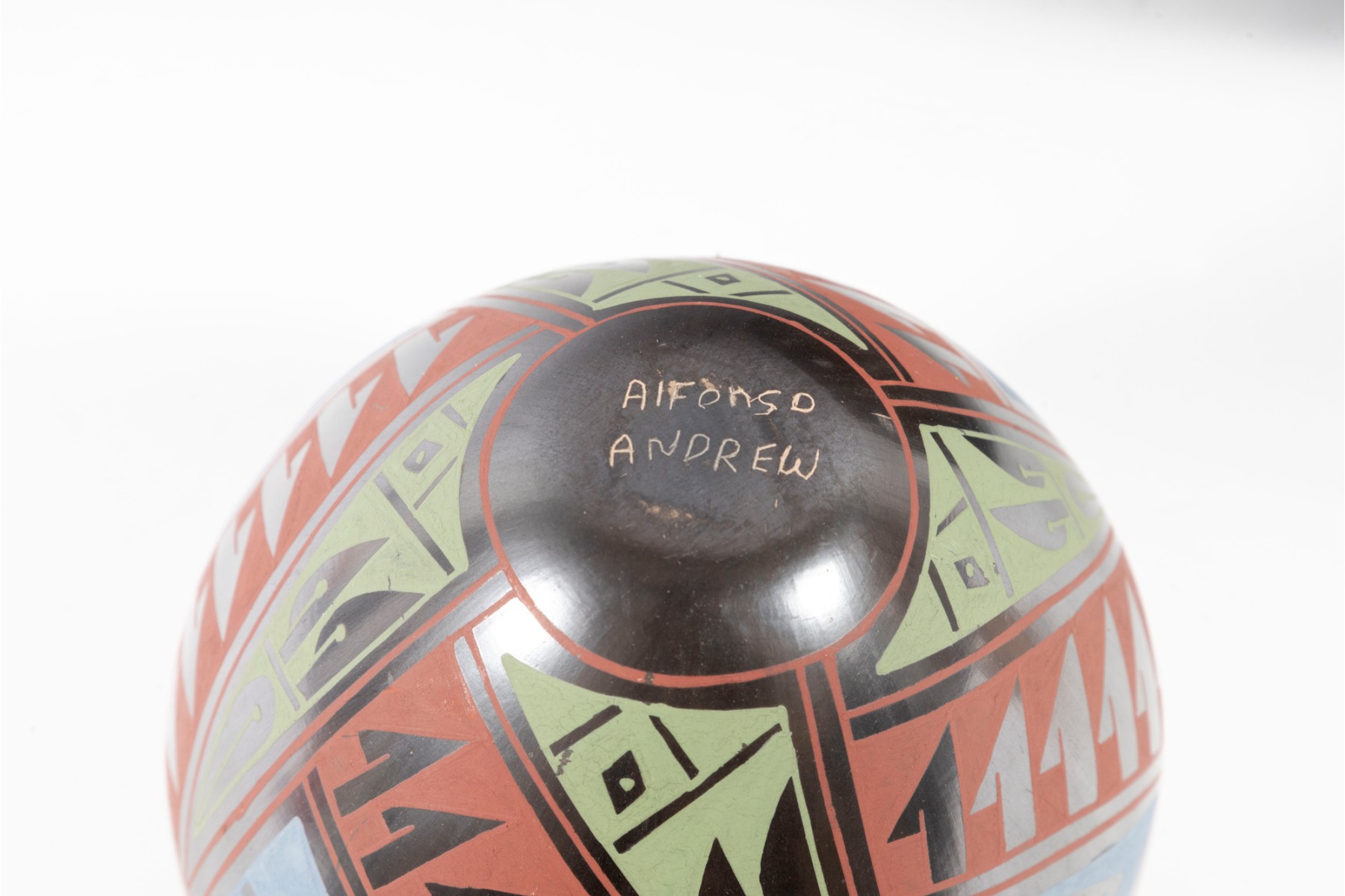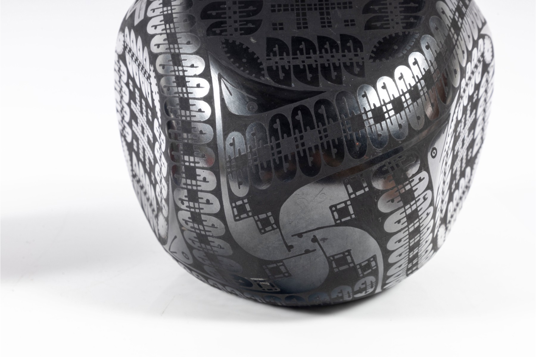 The skilled potters of Mata Ortiz contemporary works of art, often emboldened by Mimbres designs shared by the Southwest, Native American cultures. The largest example shown is finished in an illustrious gloss black, and rests on all four sides as opposed to upright. A small signature resides at the bottom of each item -- all produced by different residents of Mata Ortiz, Chihuahua, Mexico.