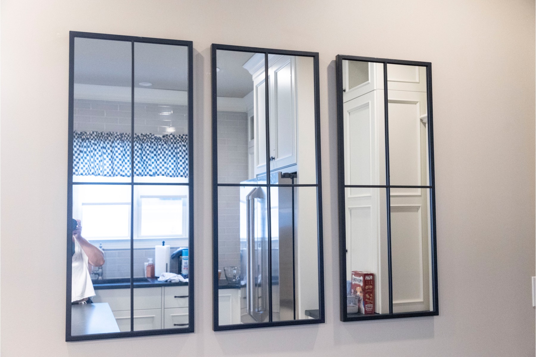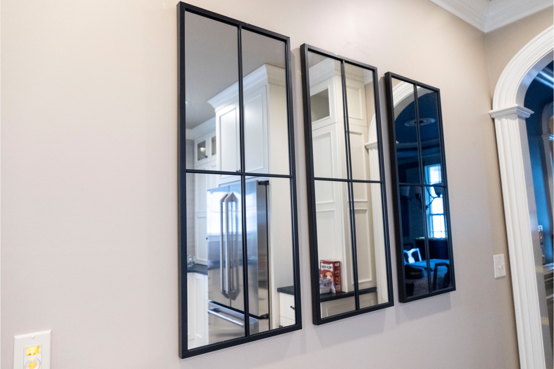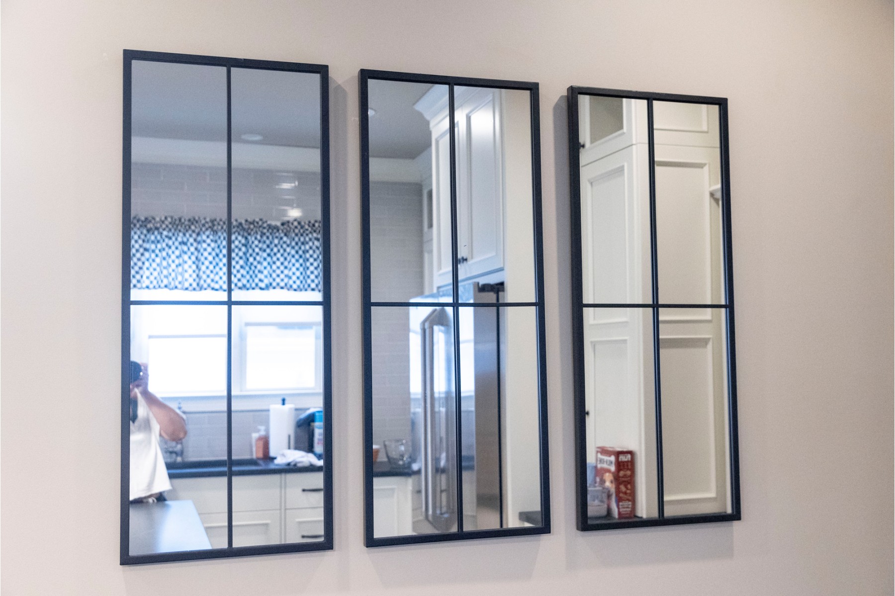 A collective three-piece set modern decorative wall mirrors with black iron frames.