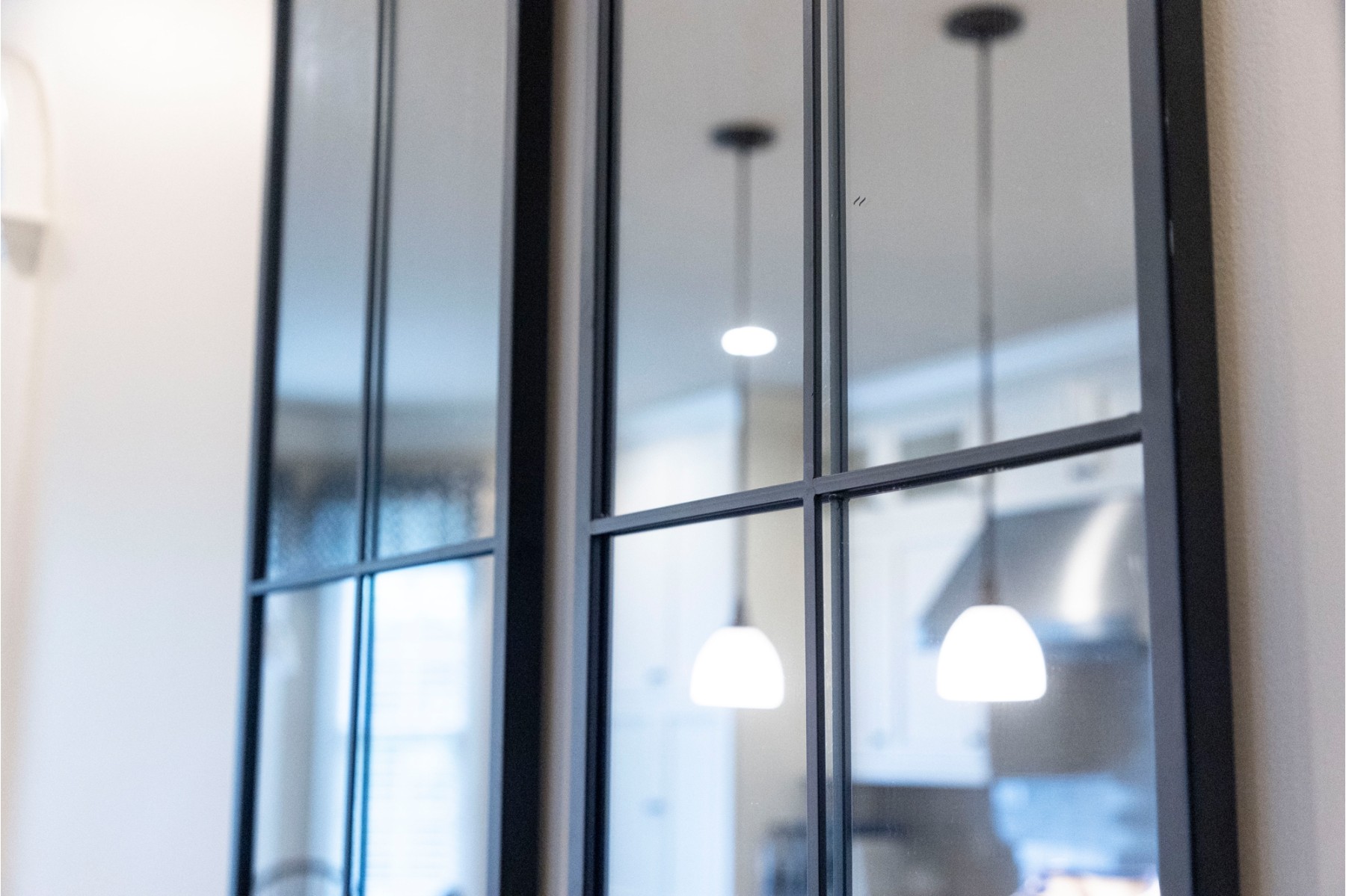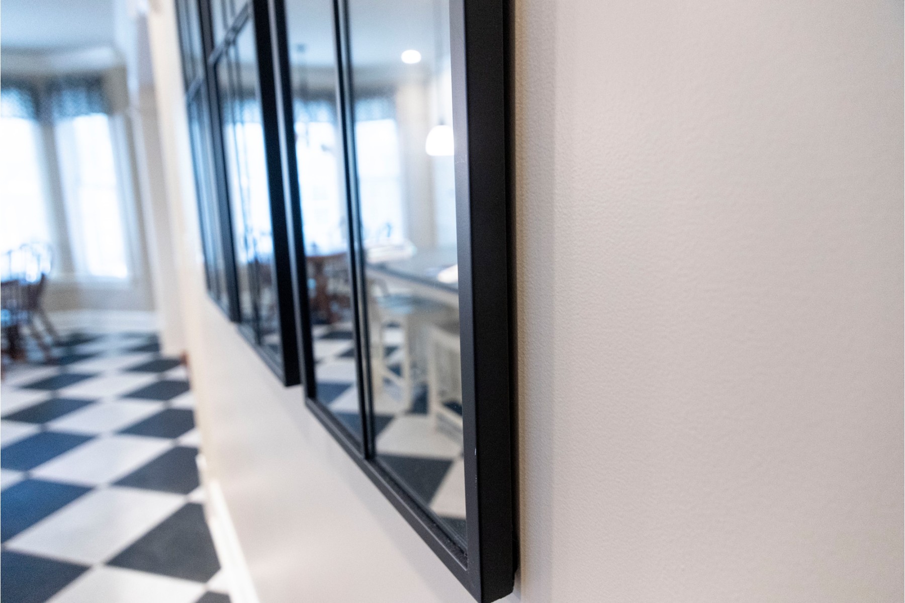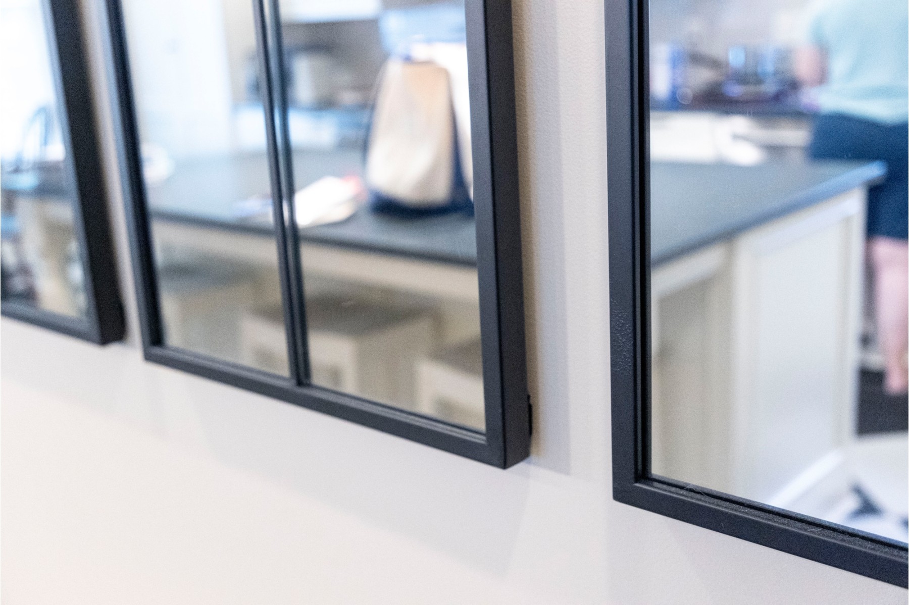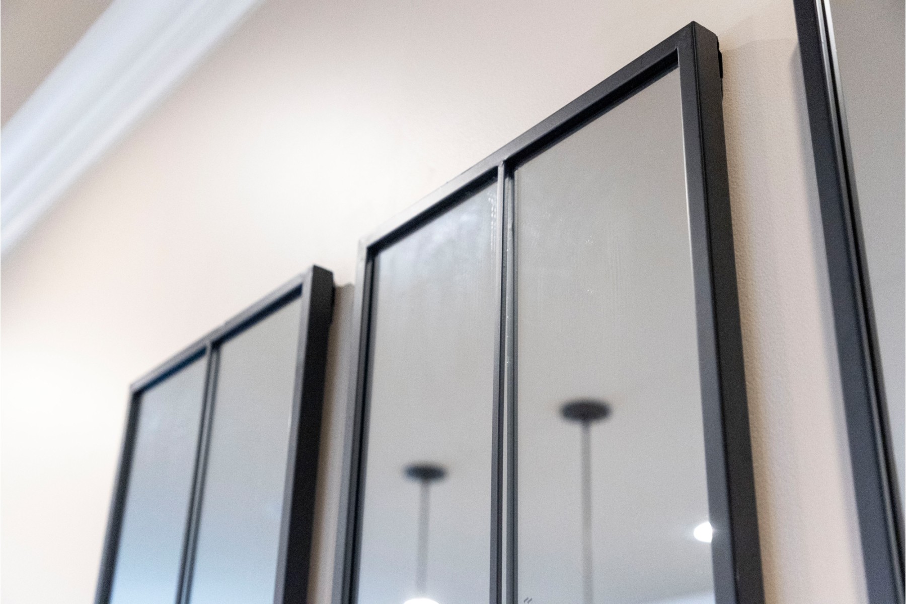 A collective three-piece set modern decorative wall mirrors with black iron frames.