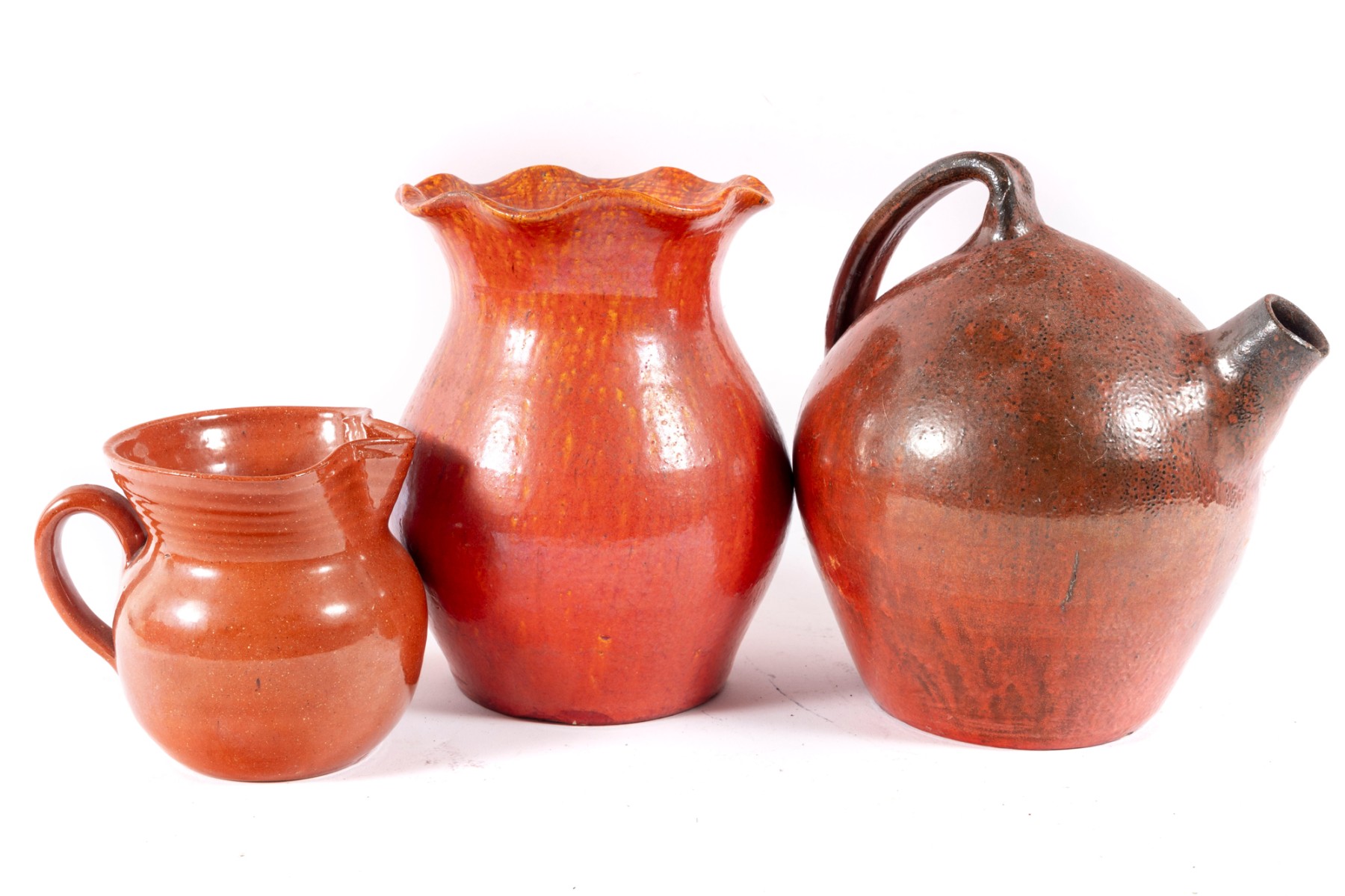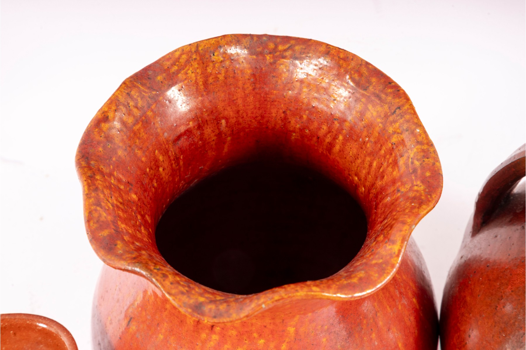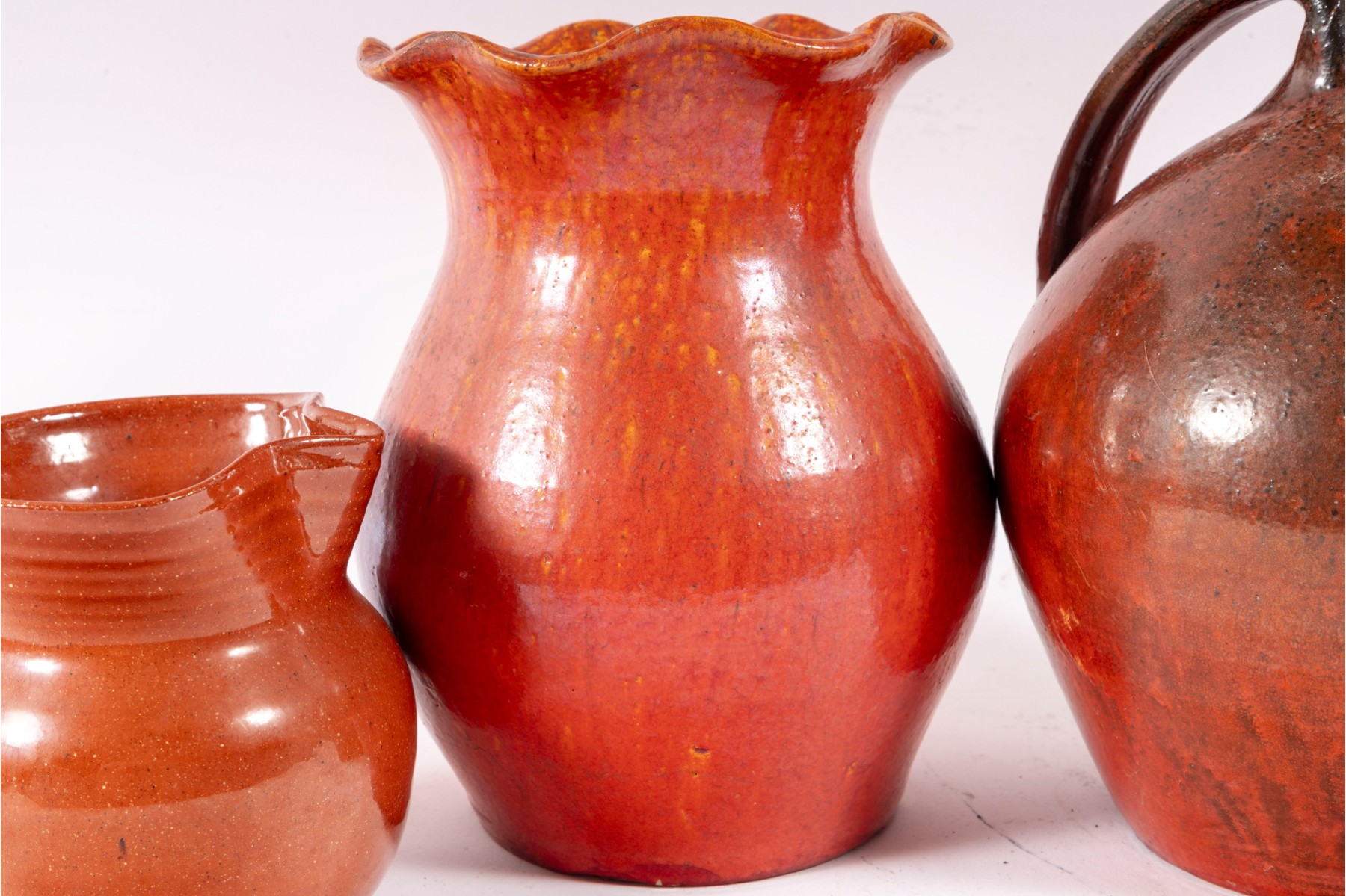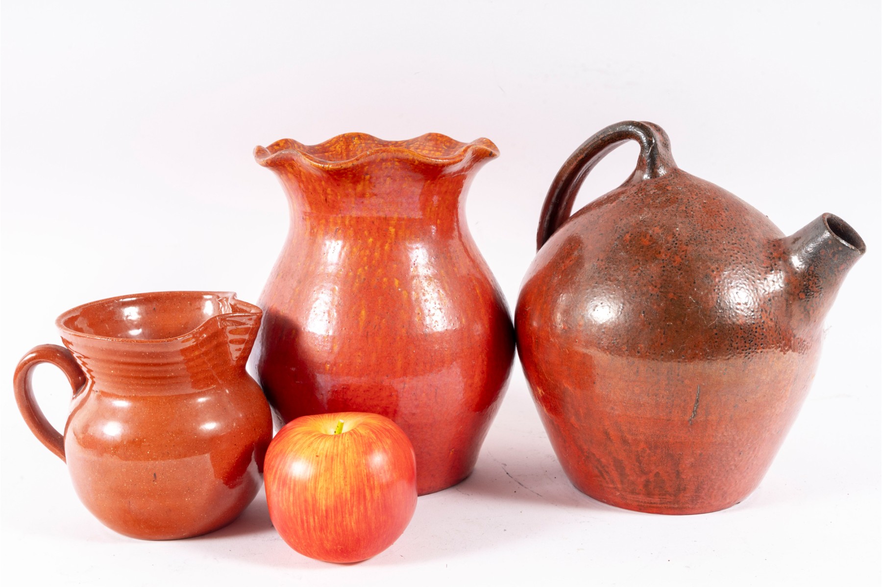 Three North Carolina pottery items from Jugtownware and North Cole Pottery -- all glazed in earthy orange tones over fine ceramic.