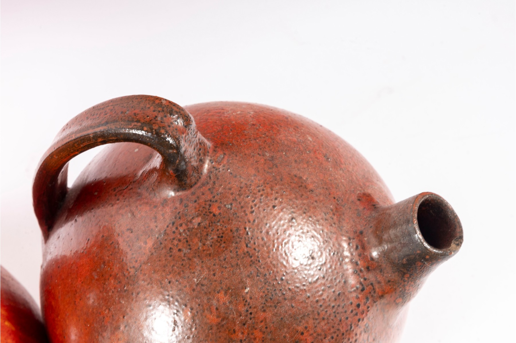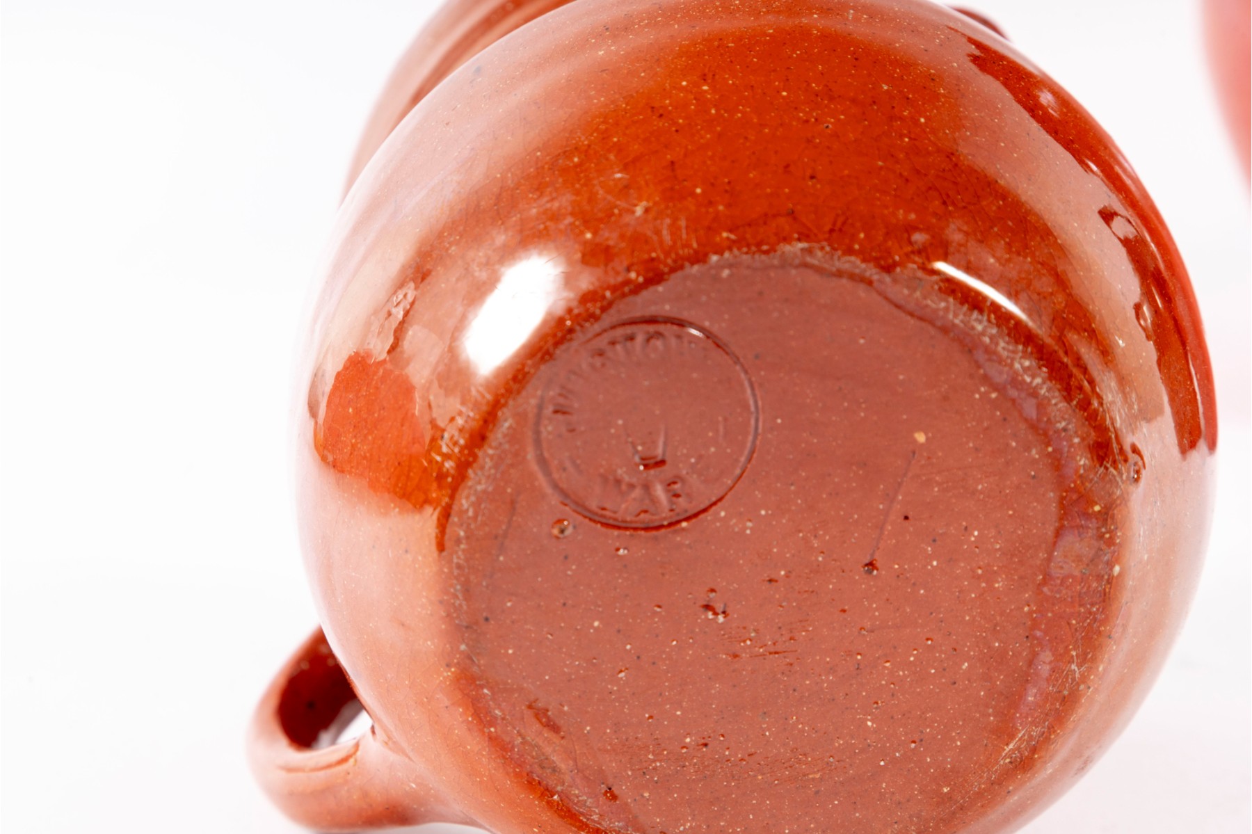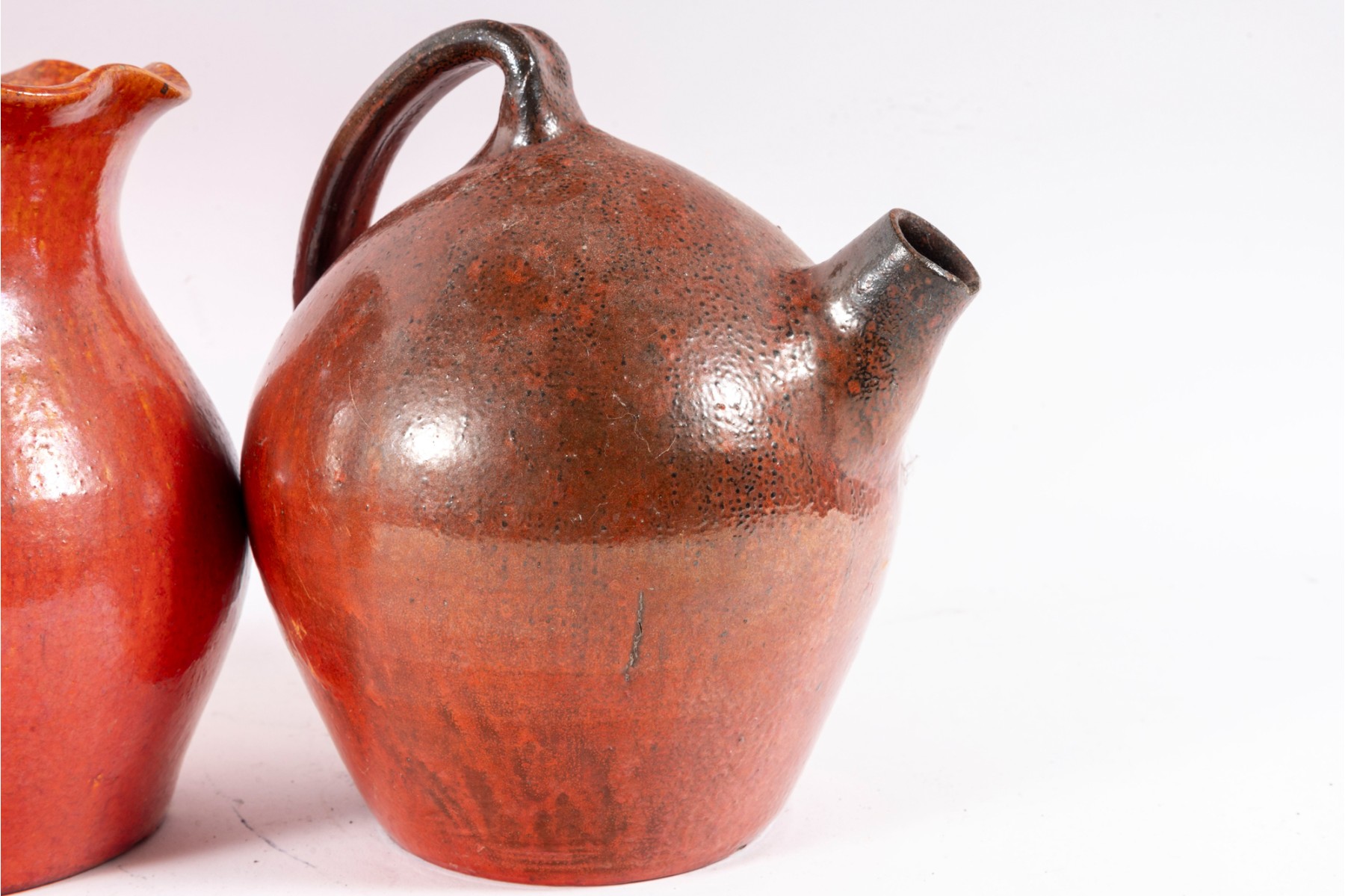 Three North Carolina pottery items from Jugtownware and North Cole Pottery -- all glazed in earthy orange tones over fine ceramic.