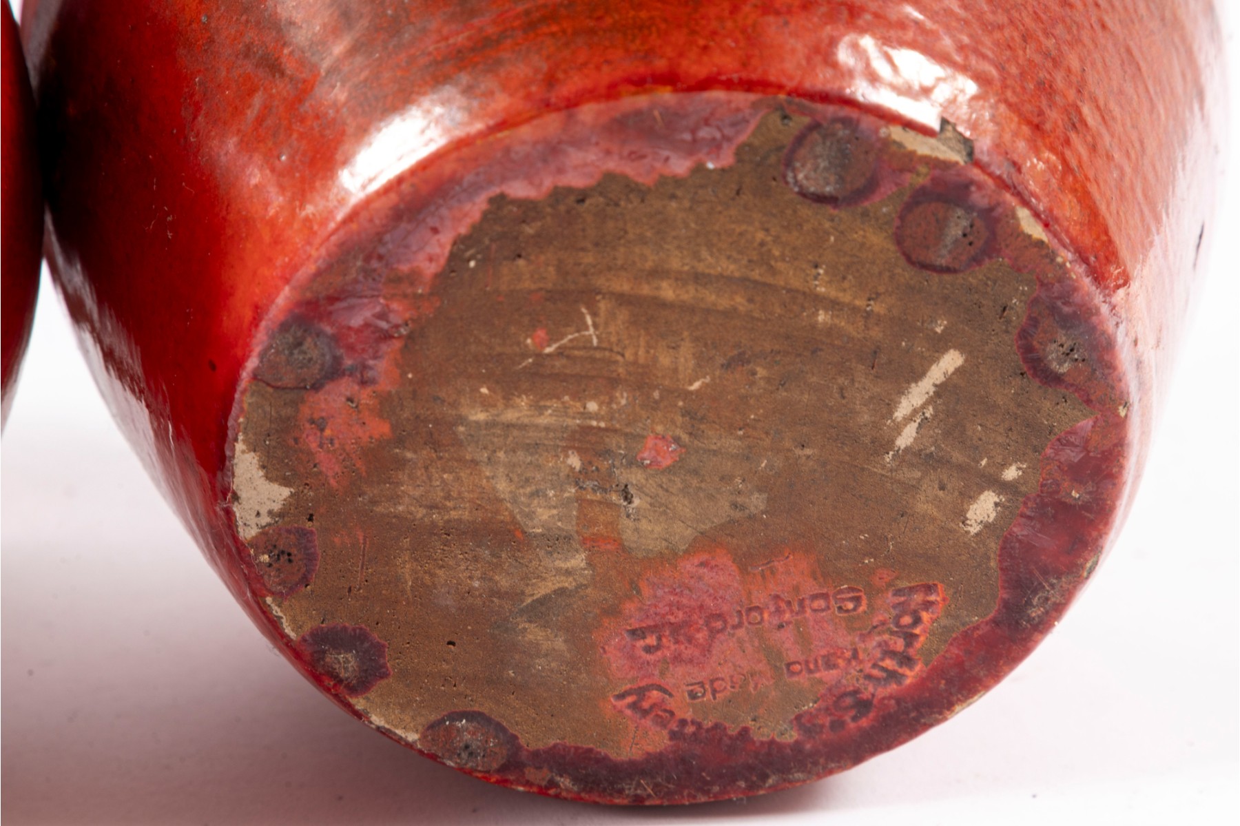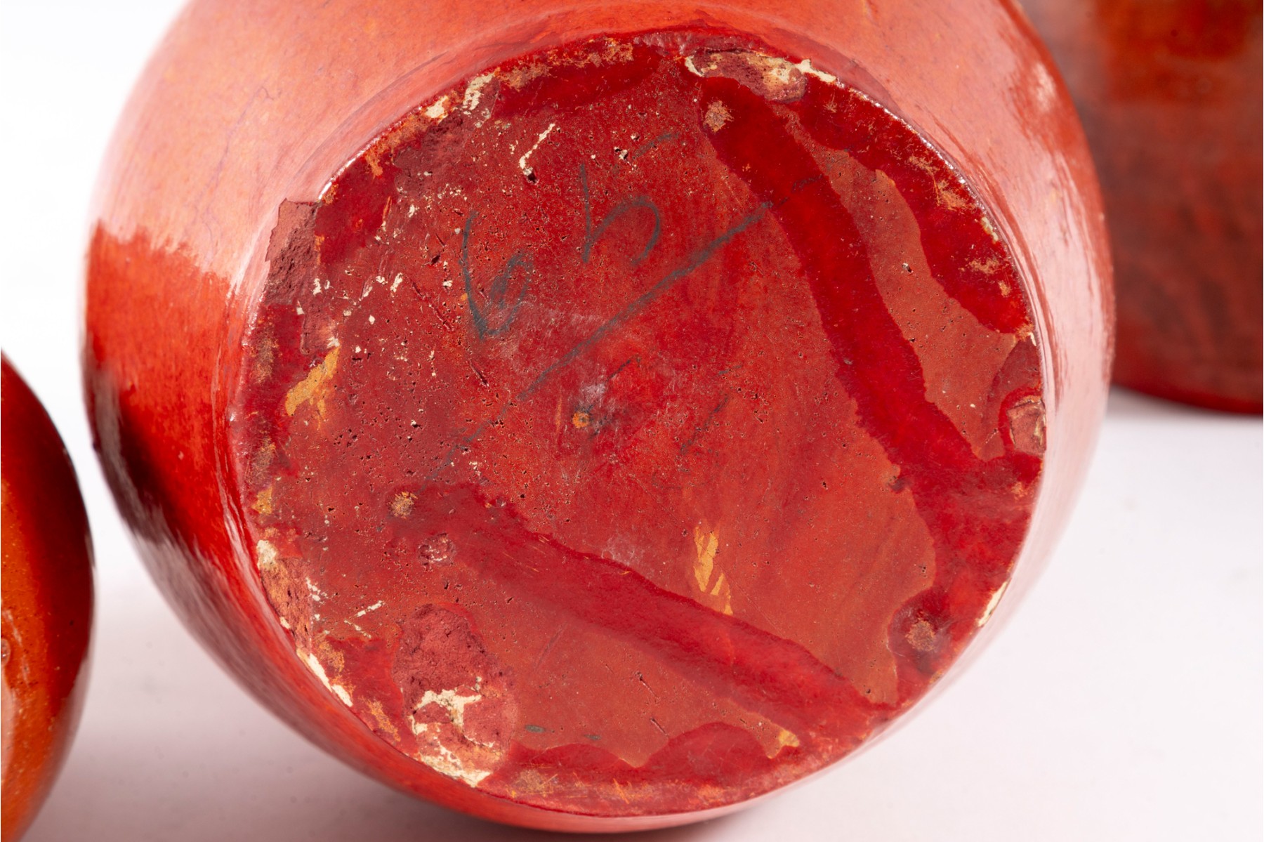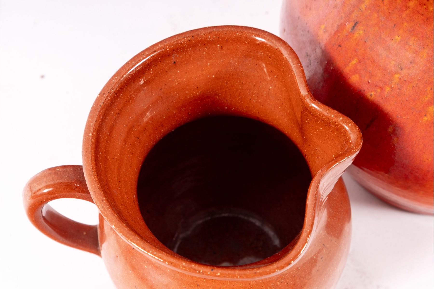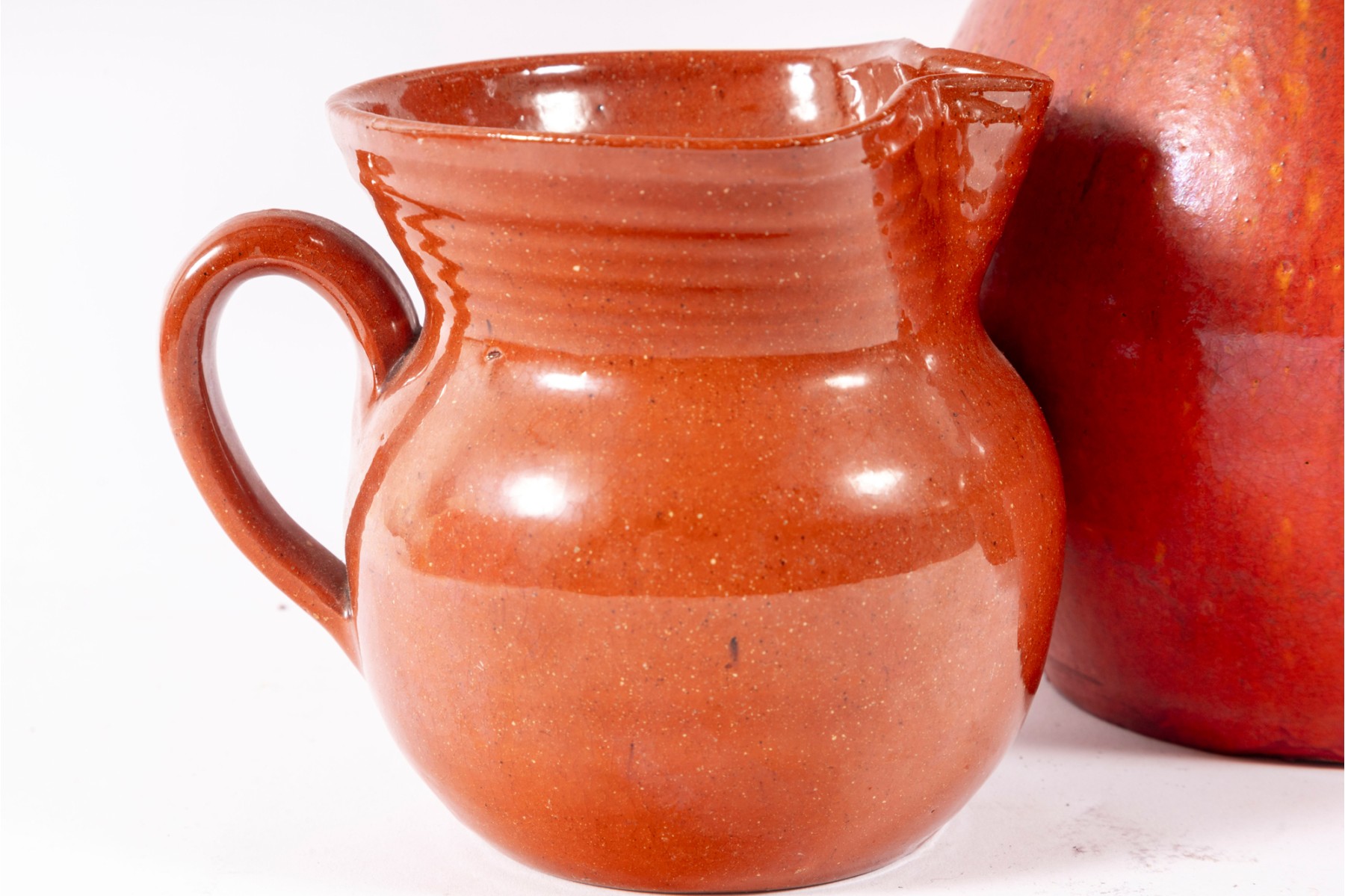 Three North Carolina pottery items from Jugtownware and North Cole Pottery -- all glazed in earthy orange tones over fine ceramic.