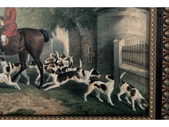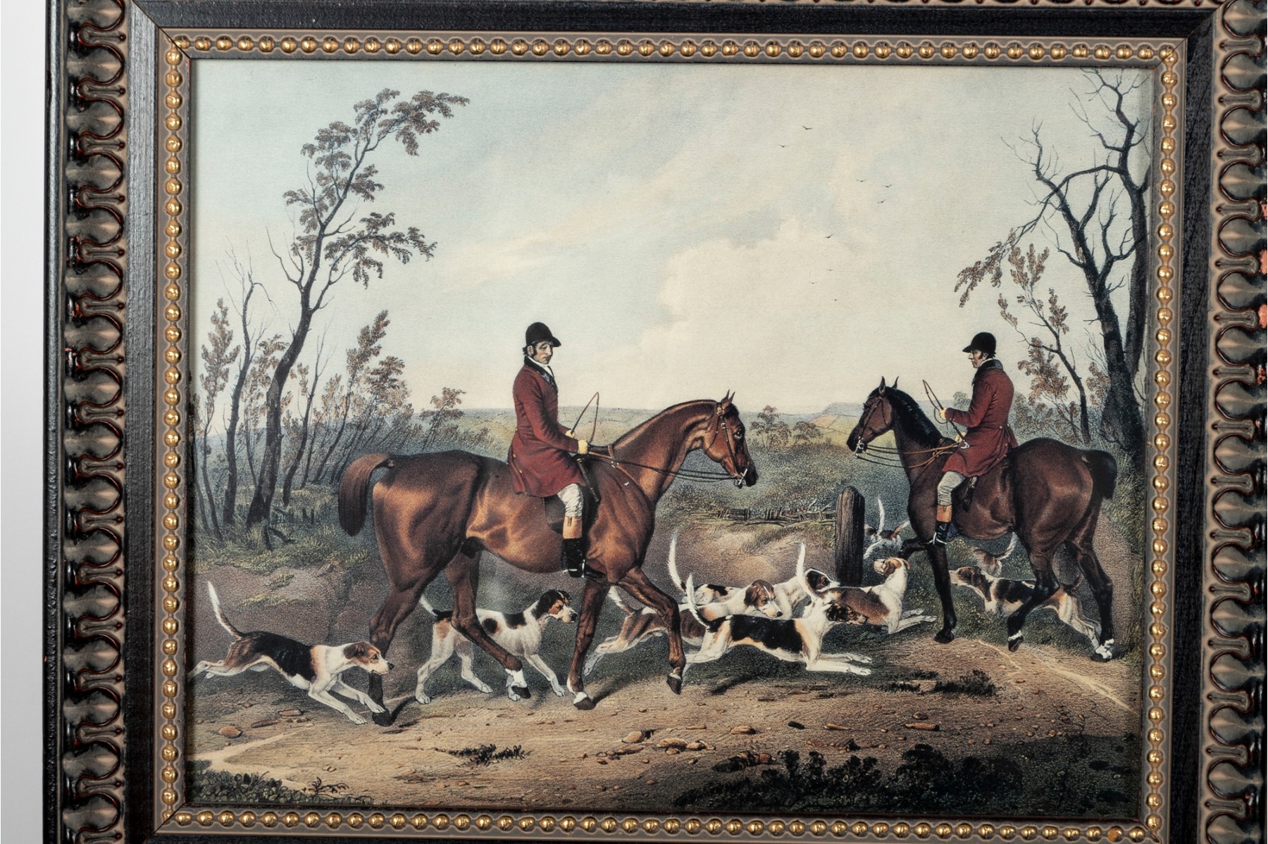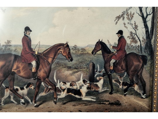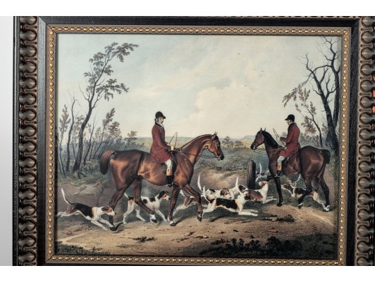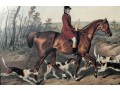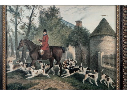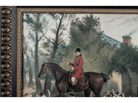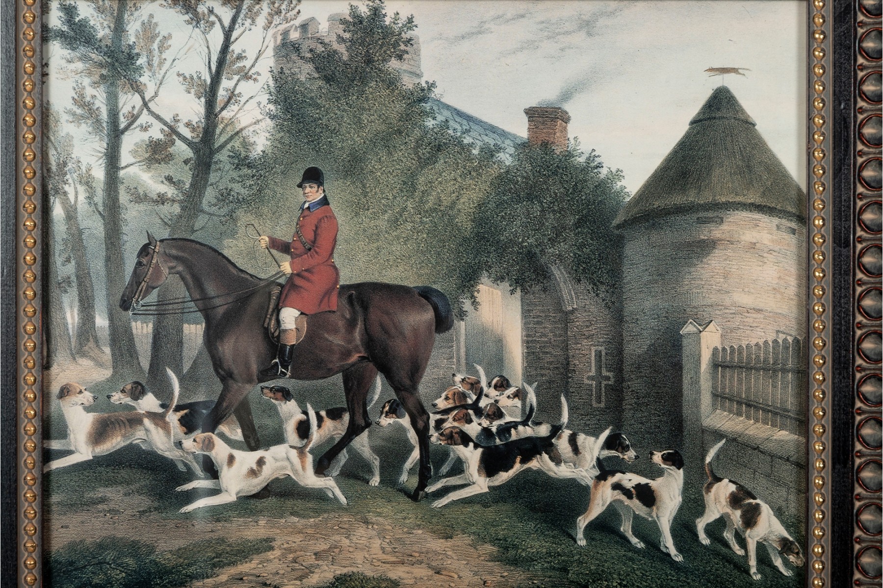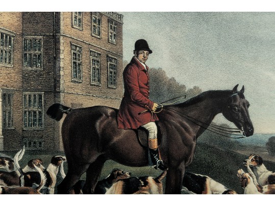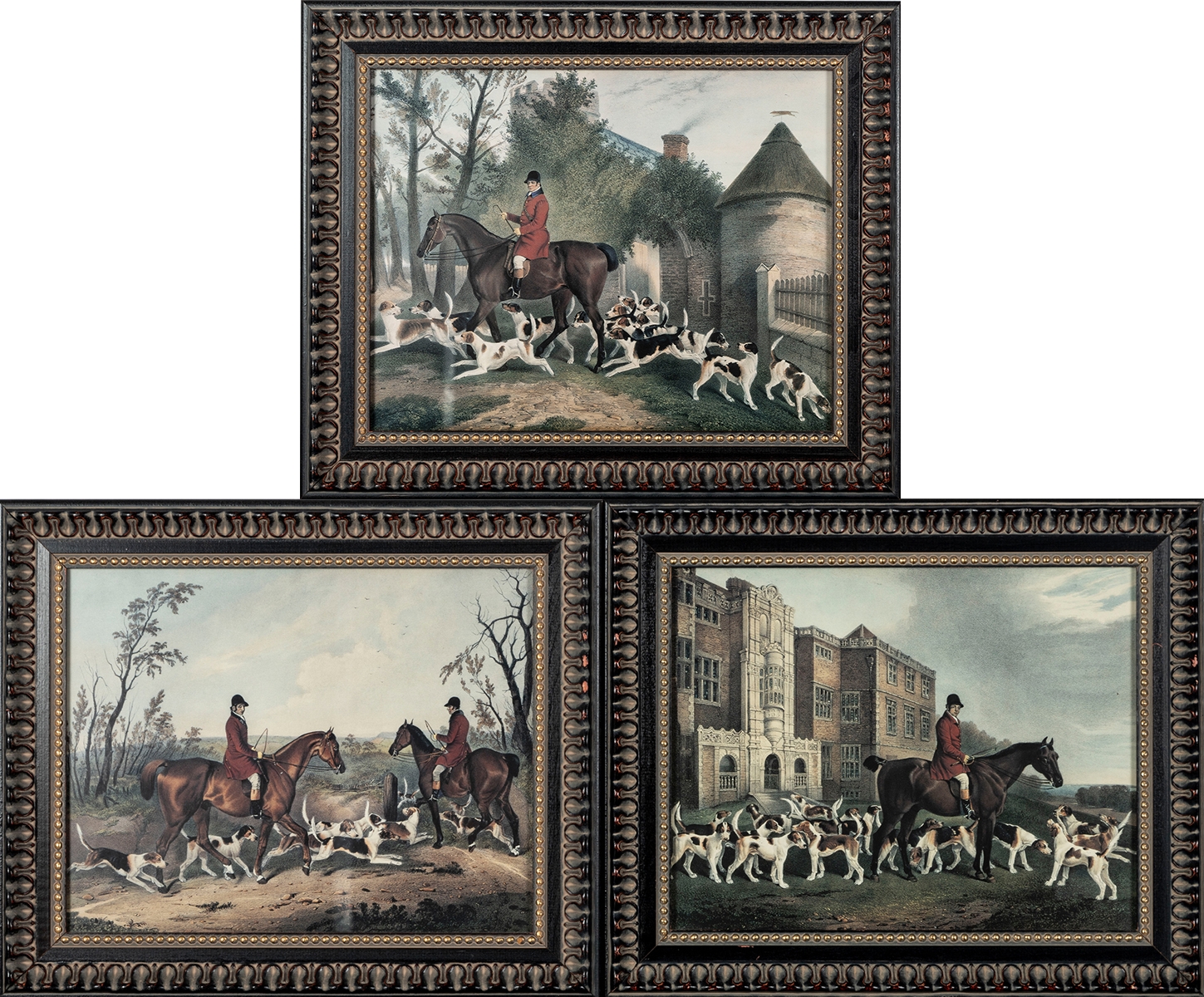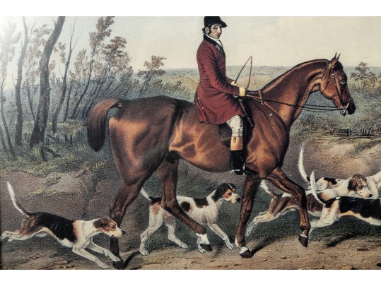 A wonderful trio of Richard Barrett Davis (English, 1782-1854) lithographs including "W. Sebright, Huntsman To The Milton Hounds," "Huntsman Whipper-in To The Milton Hounds," and "James Shirley Huntsman, to the Bramshill Hounds," all depicting gentleman in red coats on brown horses accompanied by hunting dogs in traditional landscapes.