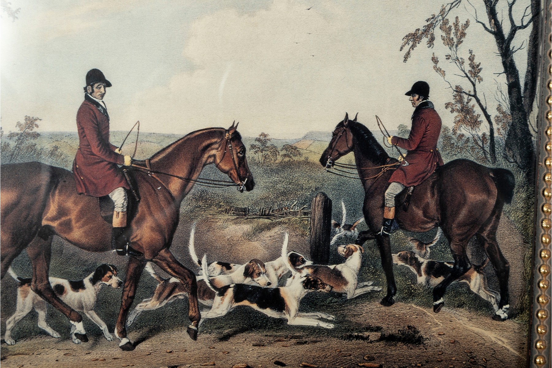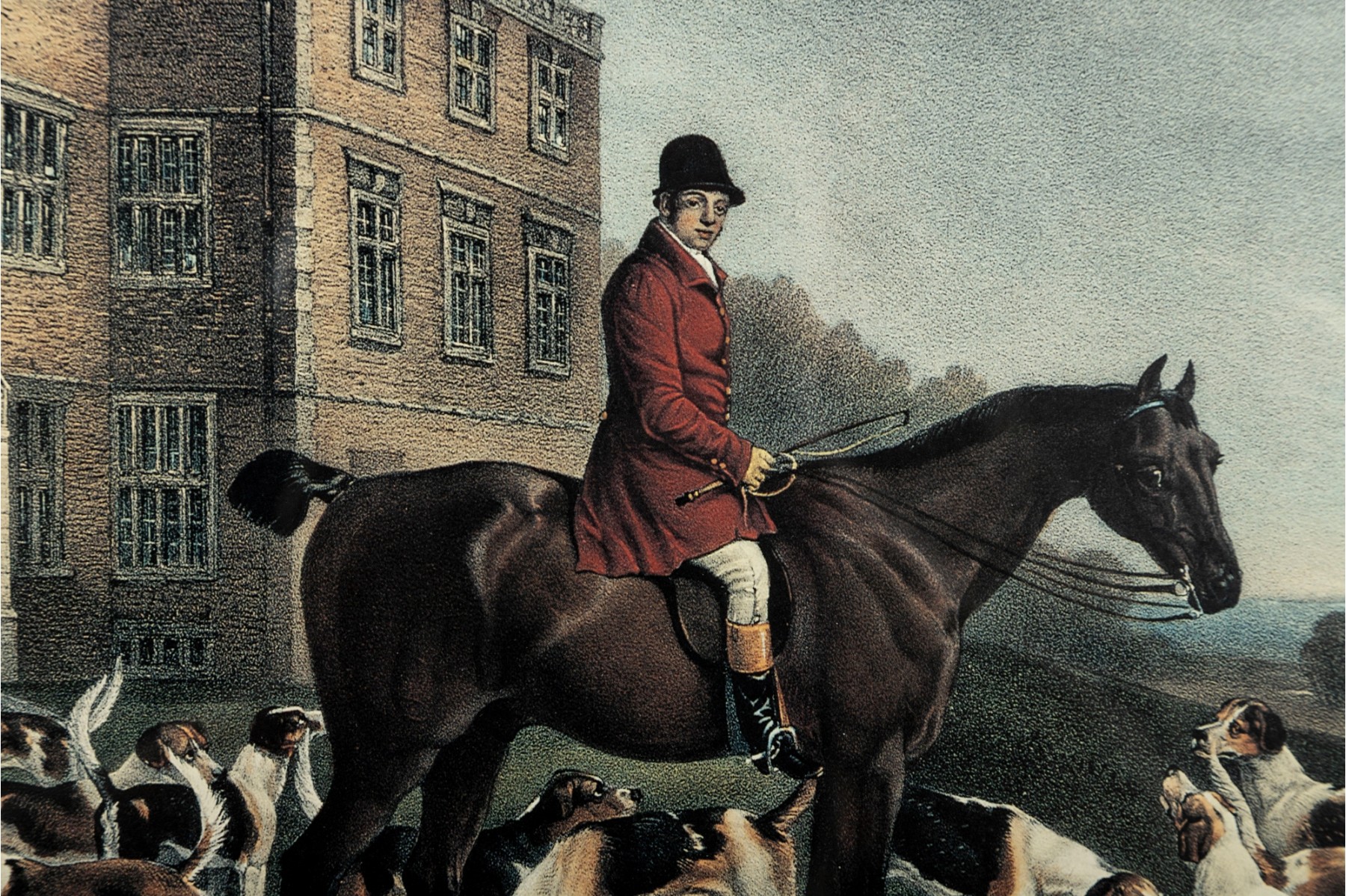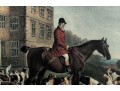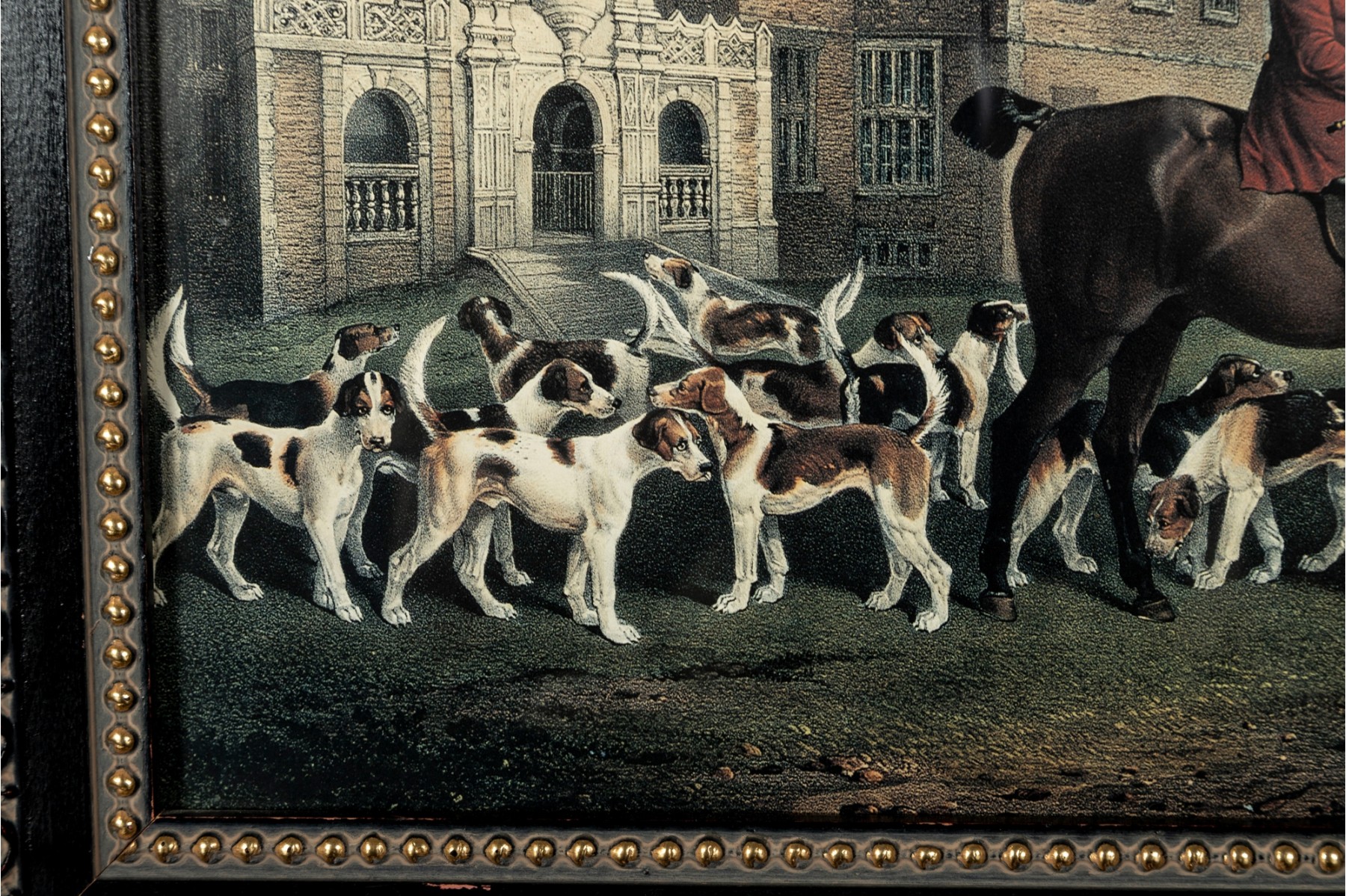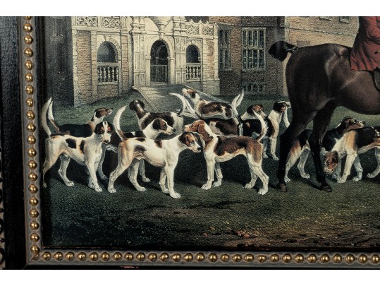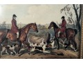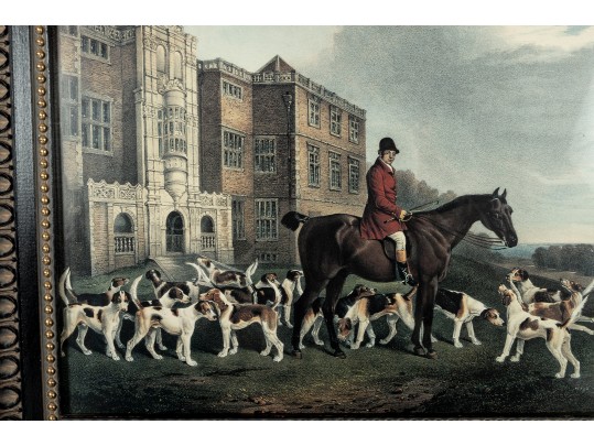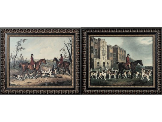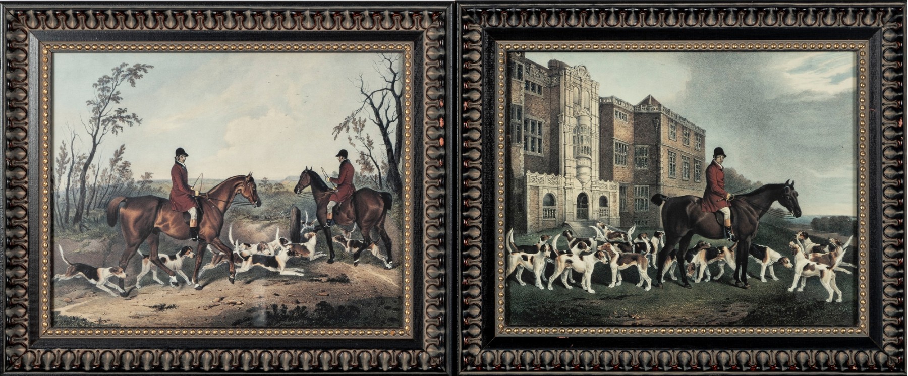 A wonderful trio of Richard Barrett Davis (English, 1782-1854) lithographs including "W. Sebright, Huntsman To The Milton Hounds," "Huntsman Whipper-in To The Milton Hounds," and "James Shirley Huntsman, to the Bramshill Hounds," all depicting gentleman in red coats on brown horses accompanied by hunting dogs in traditional landscapes.