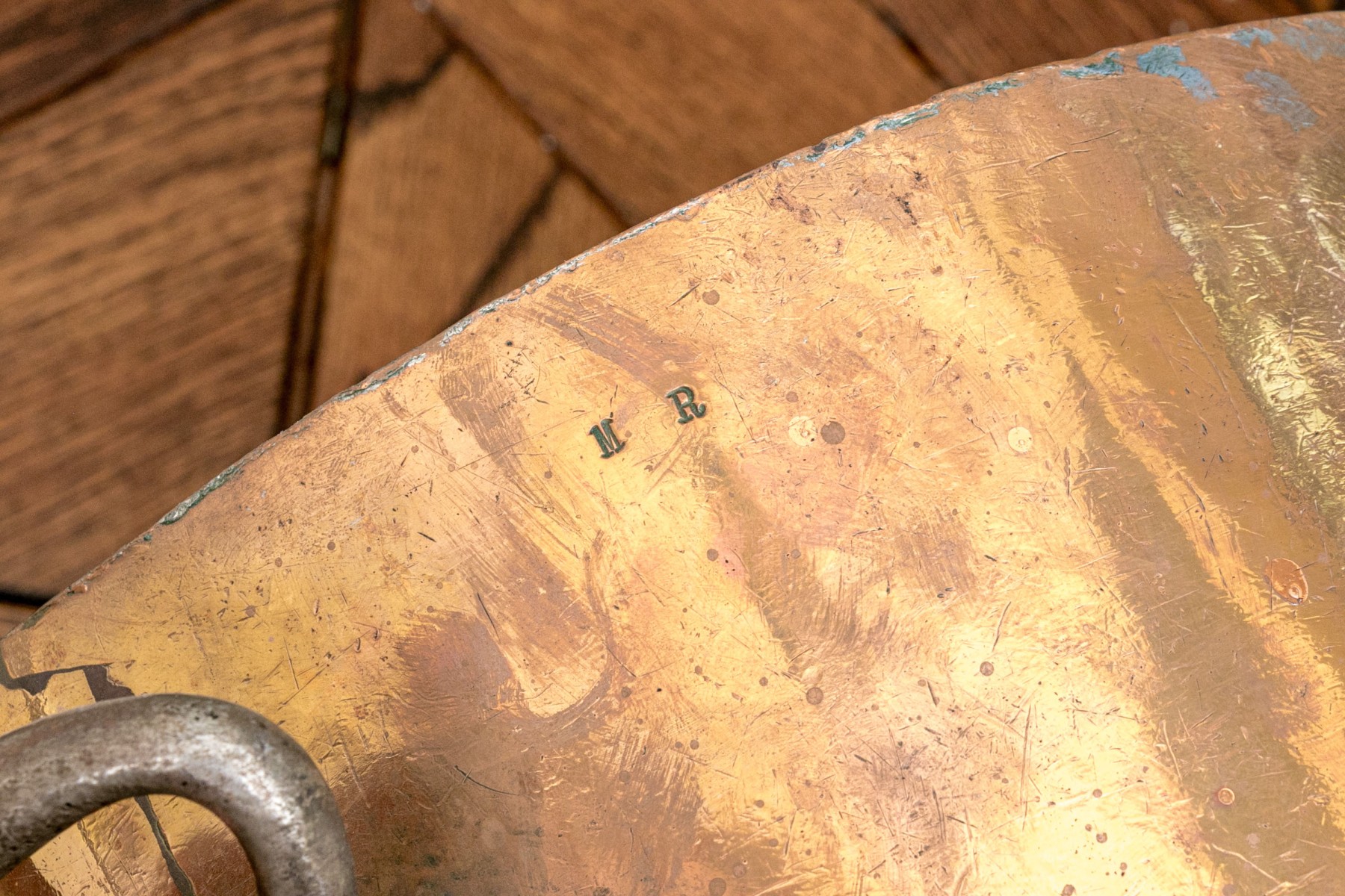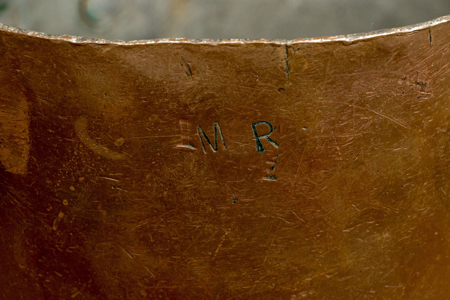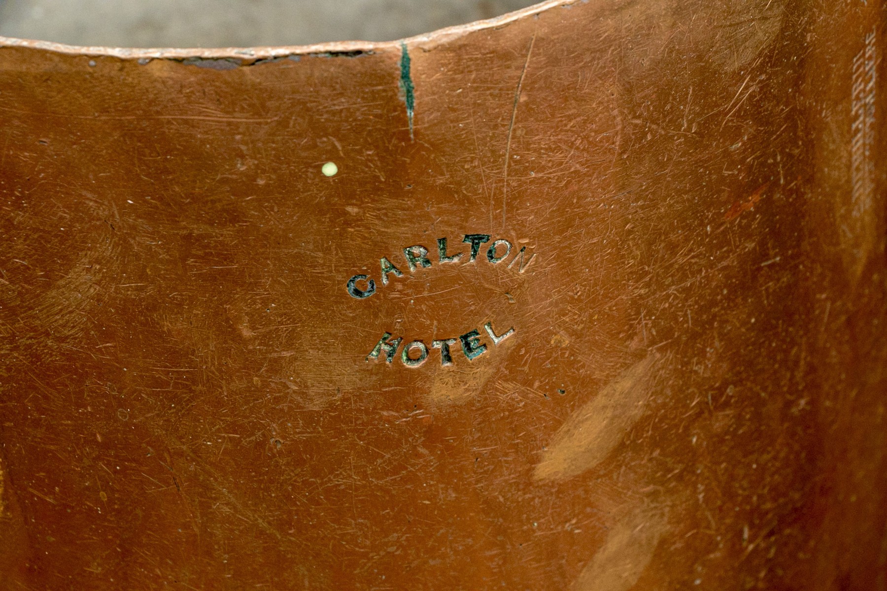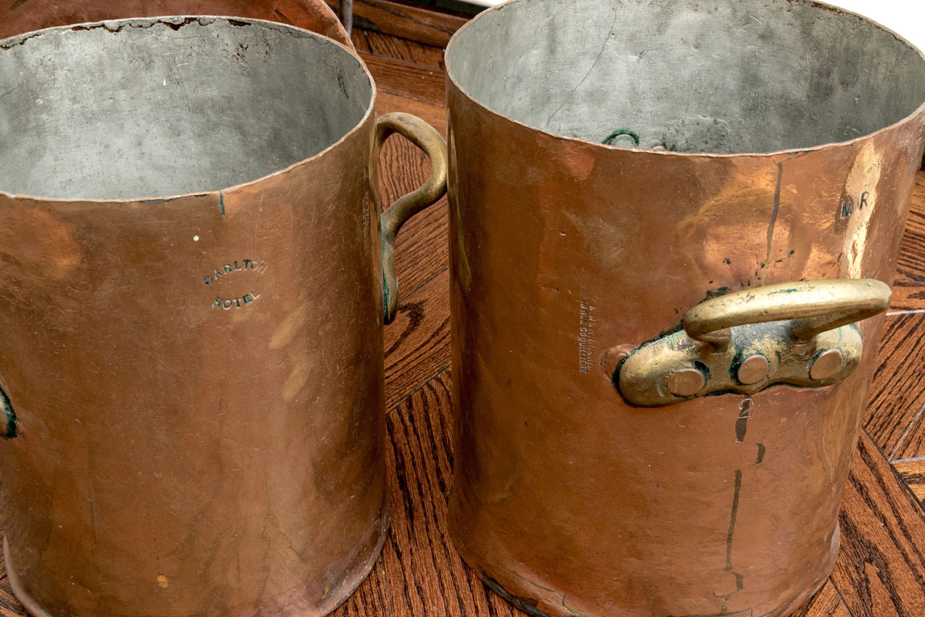 The largest impress stamped "M R", with applied steel handles (diameter 11 x 10 3/4"H), one impress stamped "Carlton Hotel" with applied brass handles (diameter 8 1/4 x 10"H), the last marked "M R", Carlton Hotel and maker address (diameter 9 x 11"H).