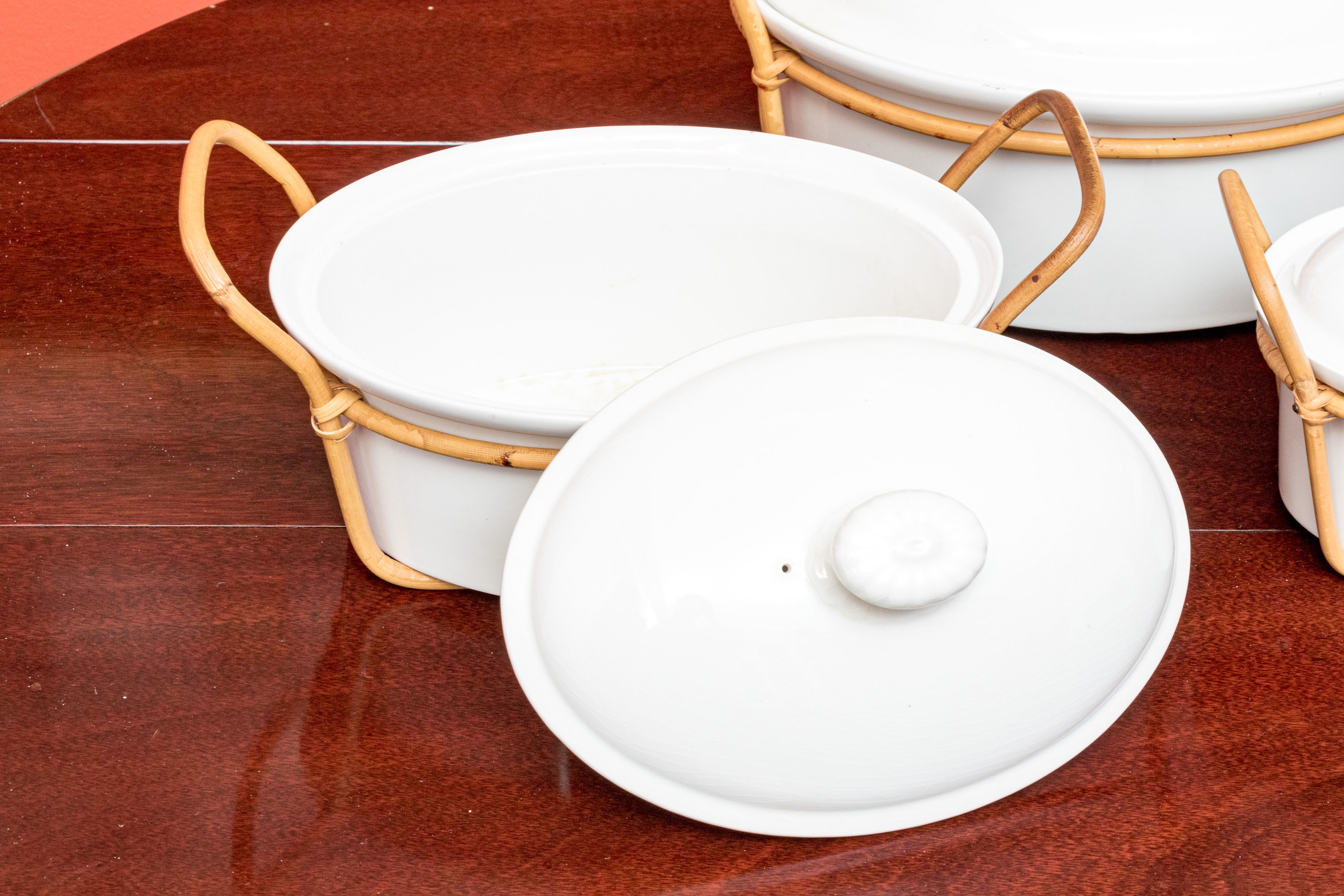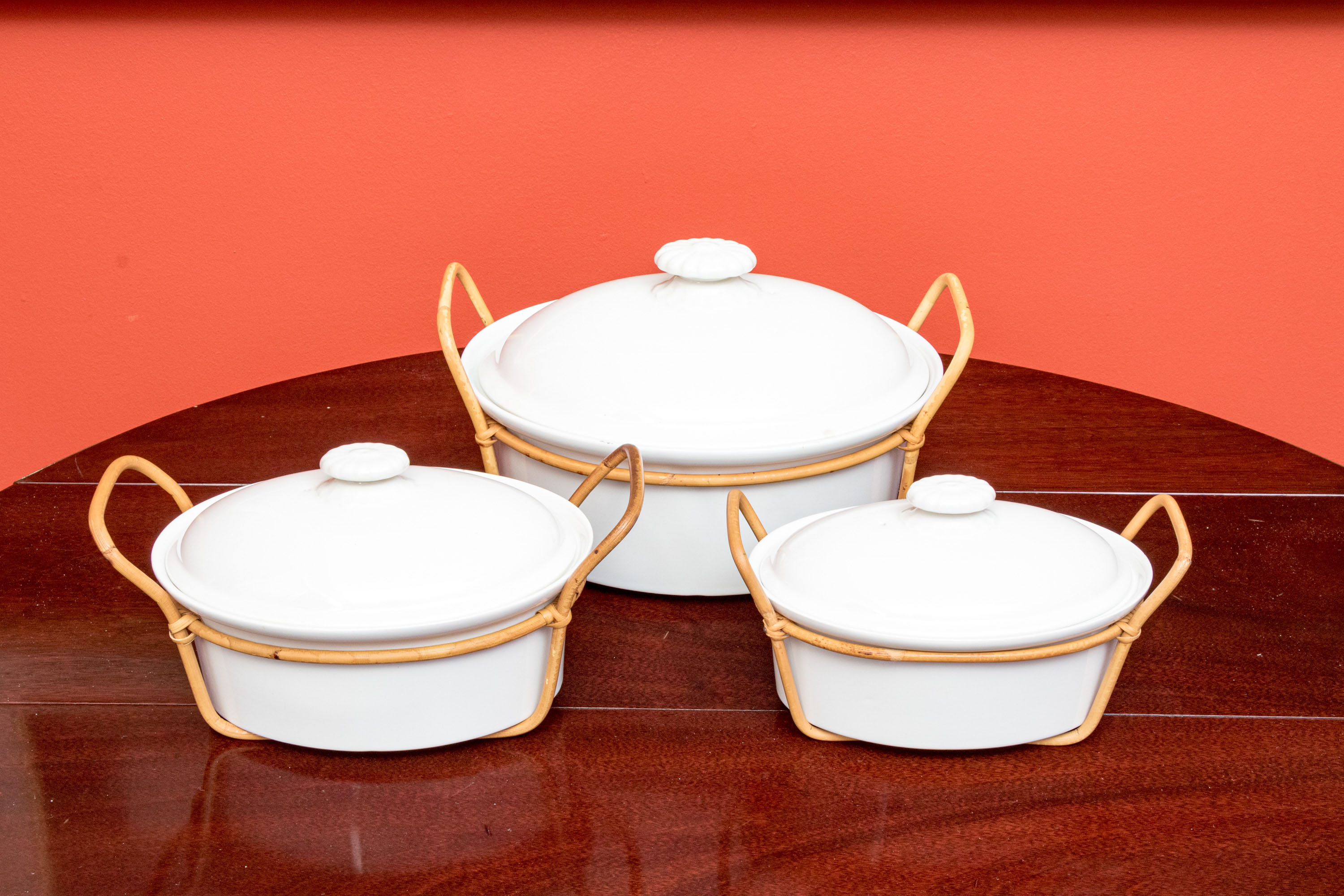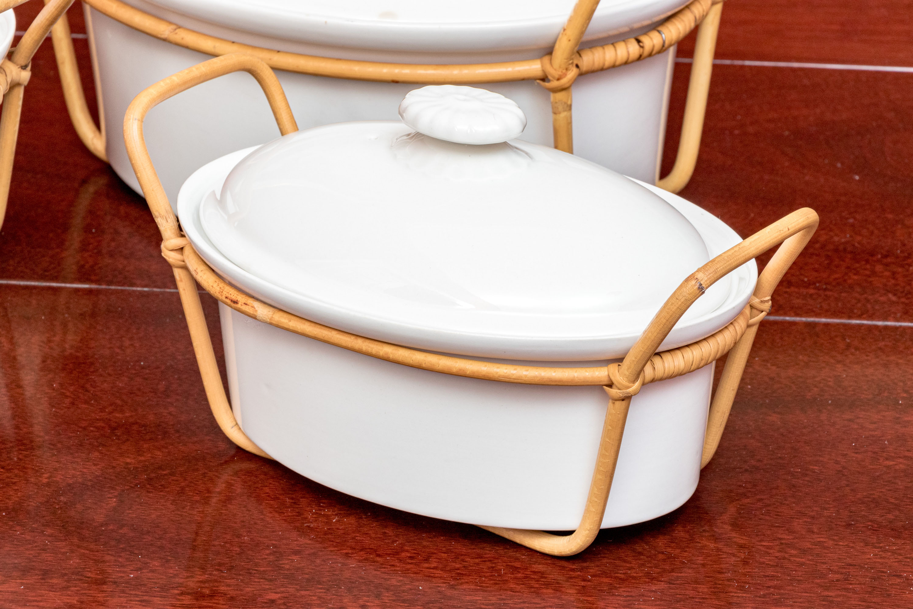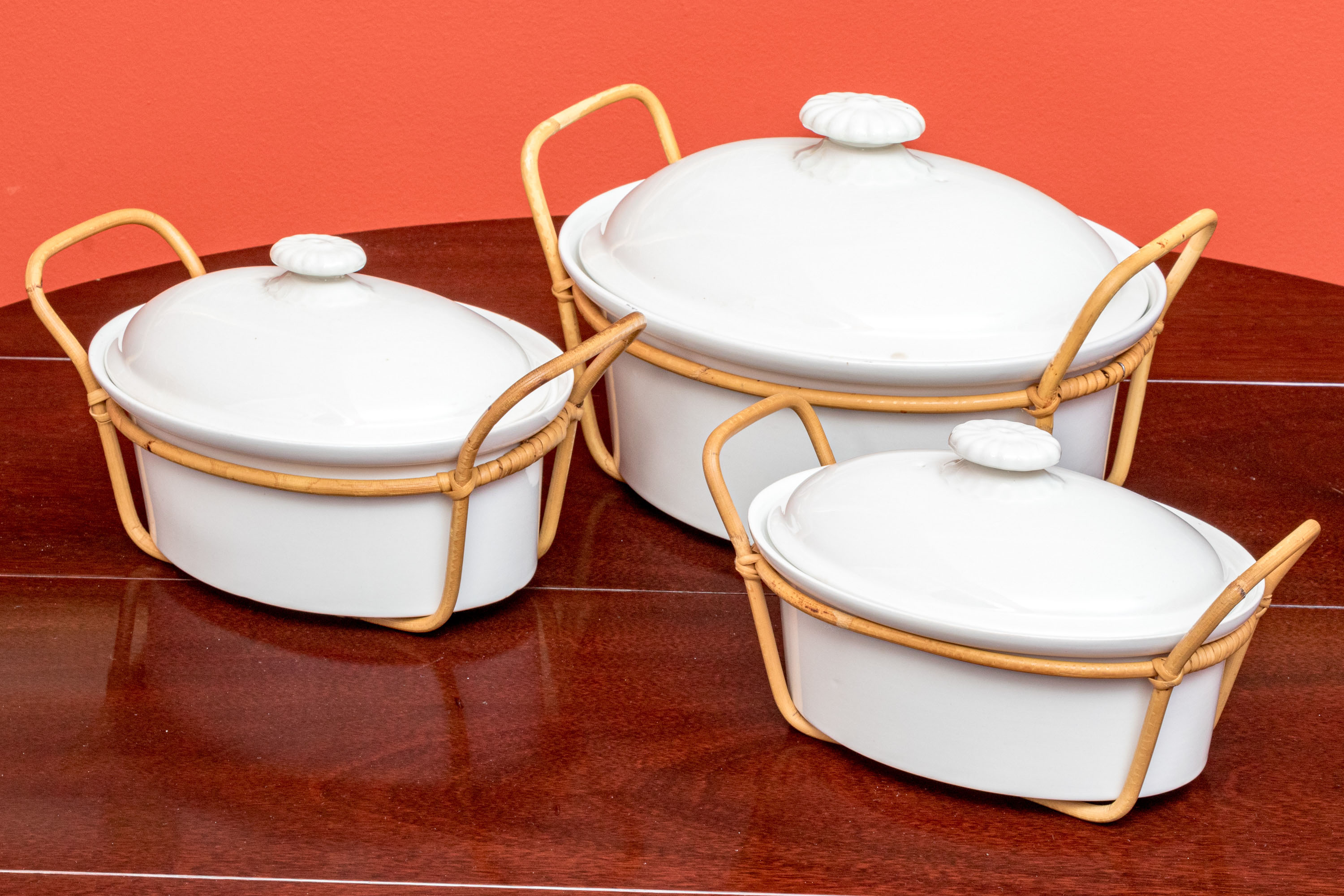 Three graduated Arabia of Finland white porcelain, lidded casseroles, each within a fitted wicker stand, marked beneath.