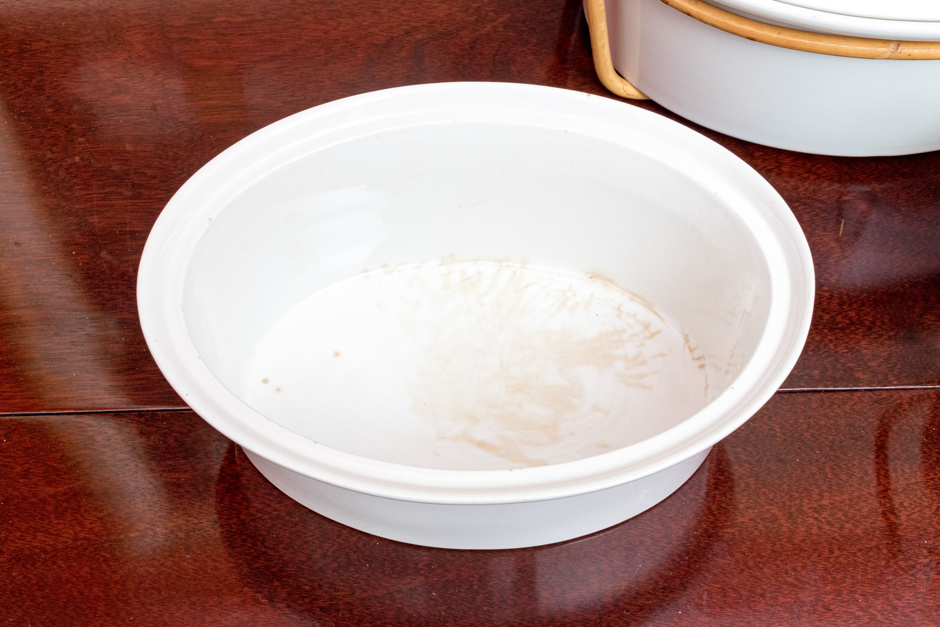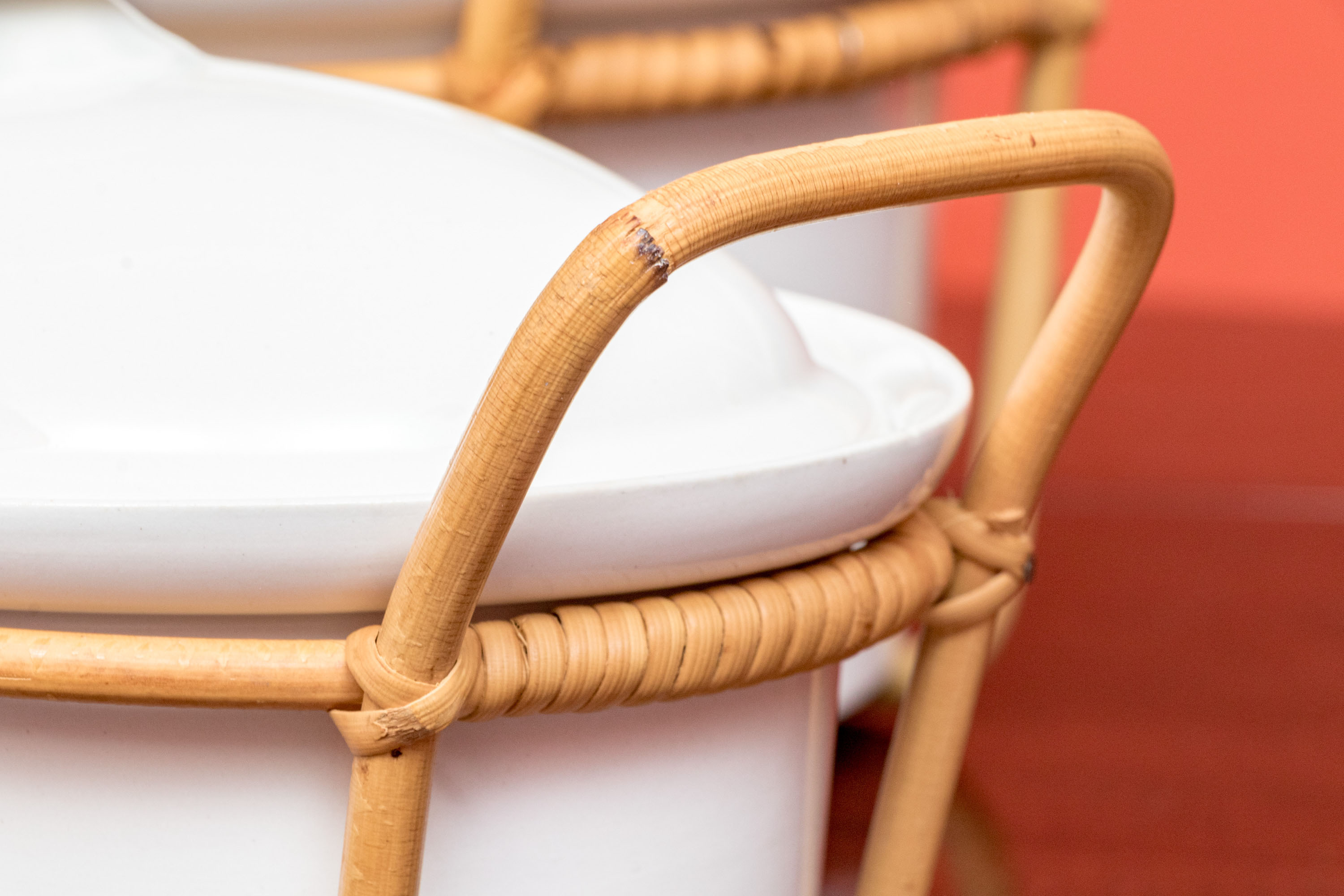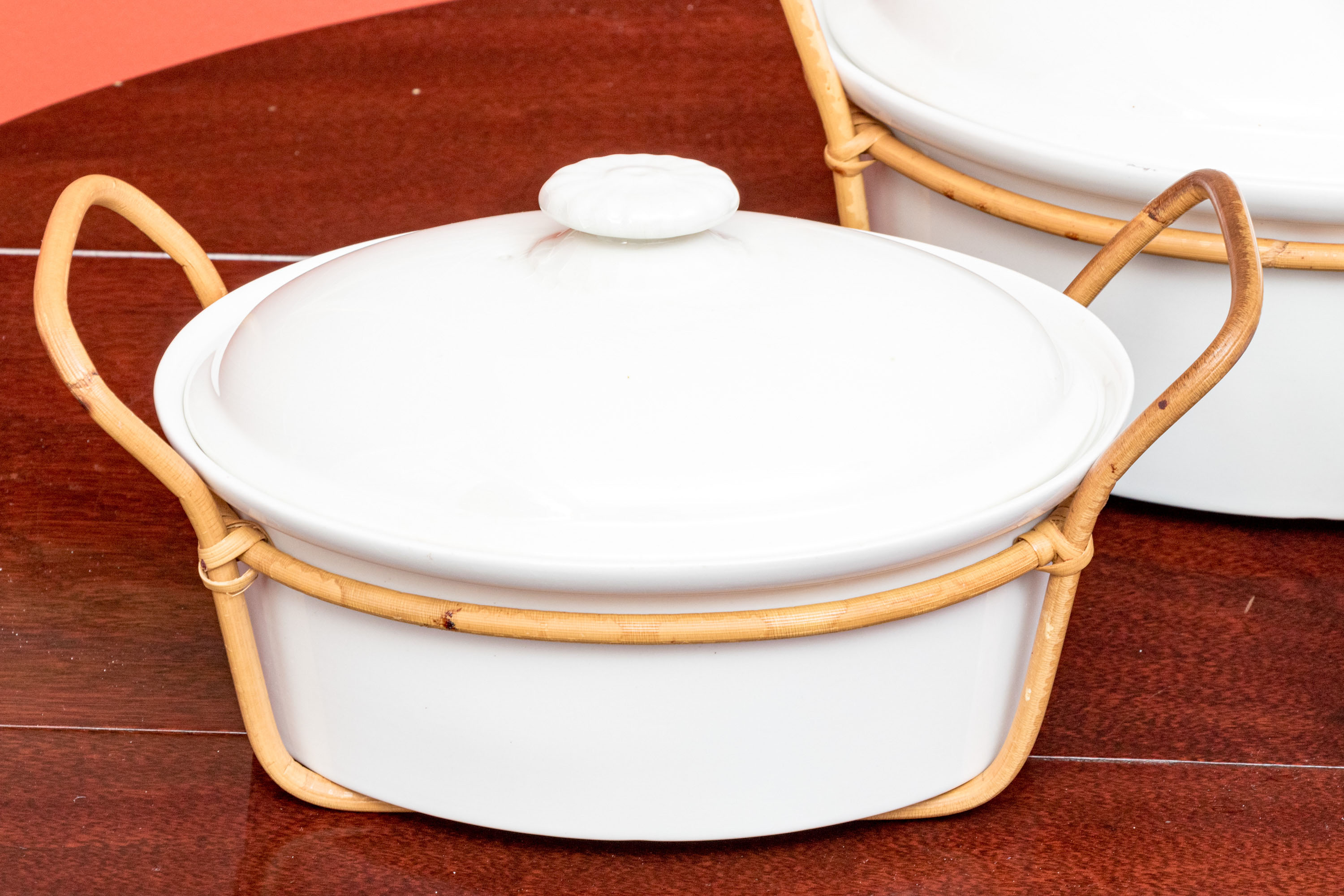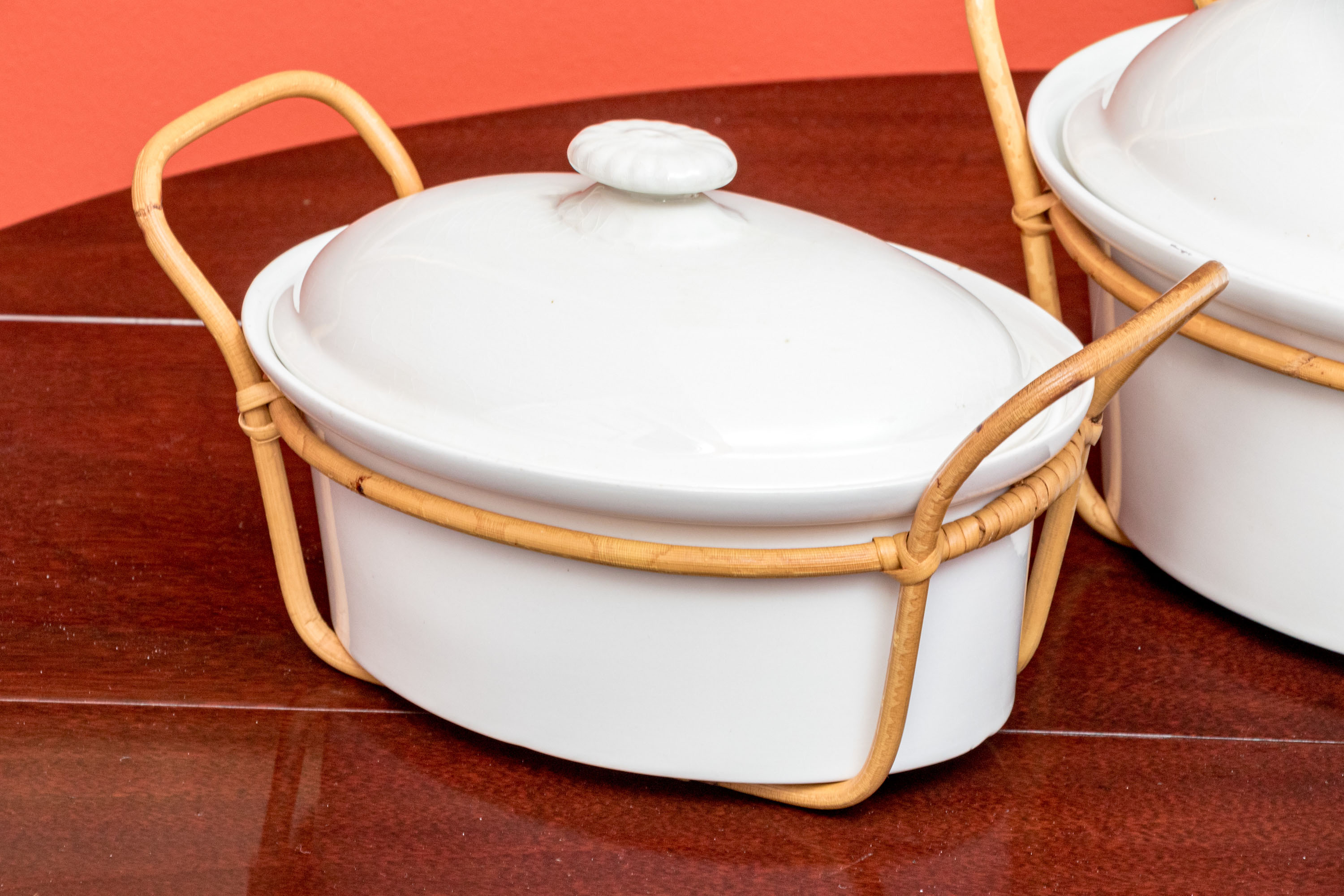 Three graduated Arabia of Finland white porcelain, lidded casseroles, each within a fitted wicker stand, marked beneath.