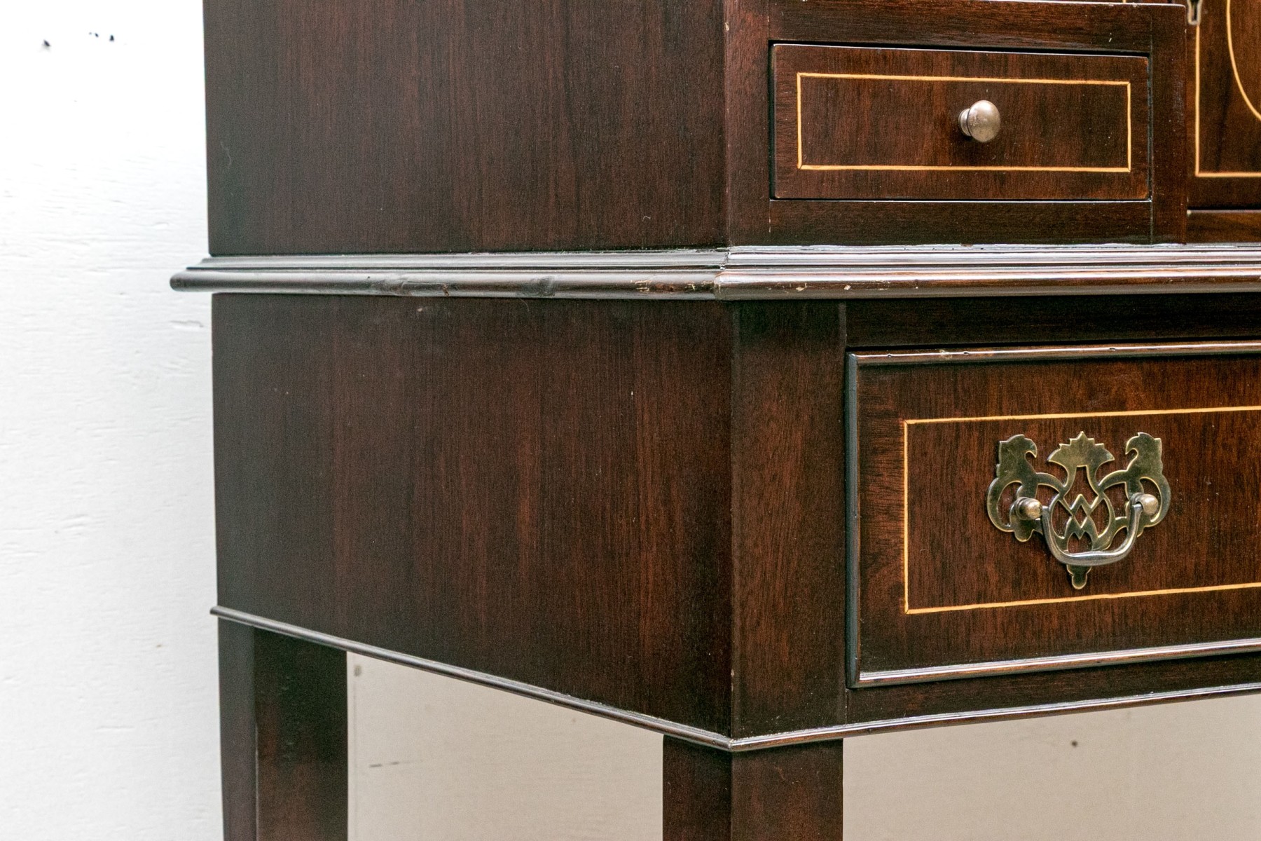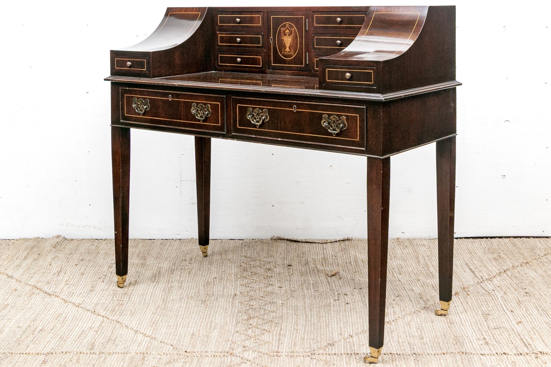 The desk sports a tall hutch of three drawers on each side, flanking a central cabinet door decorated with a fine marquetry urn motif. Flanking the drawers are elegantly sloping concave shoulders with deep-set drawers at the ends. The desk body features two drawers with double brass handles on pierced plaques. Supported by by simple tapered legs on caster feet.