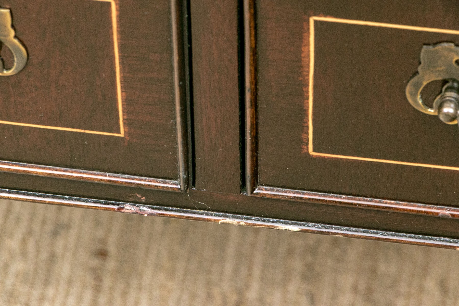 A lovely Trosby England writing desk in Georgian style. Displays a gorgeous chocolate brown mahogany veneer throughout, with fine parquetry borders in a contrasting lighter hue for excellent visual interest.