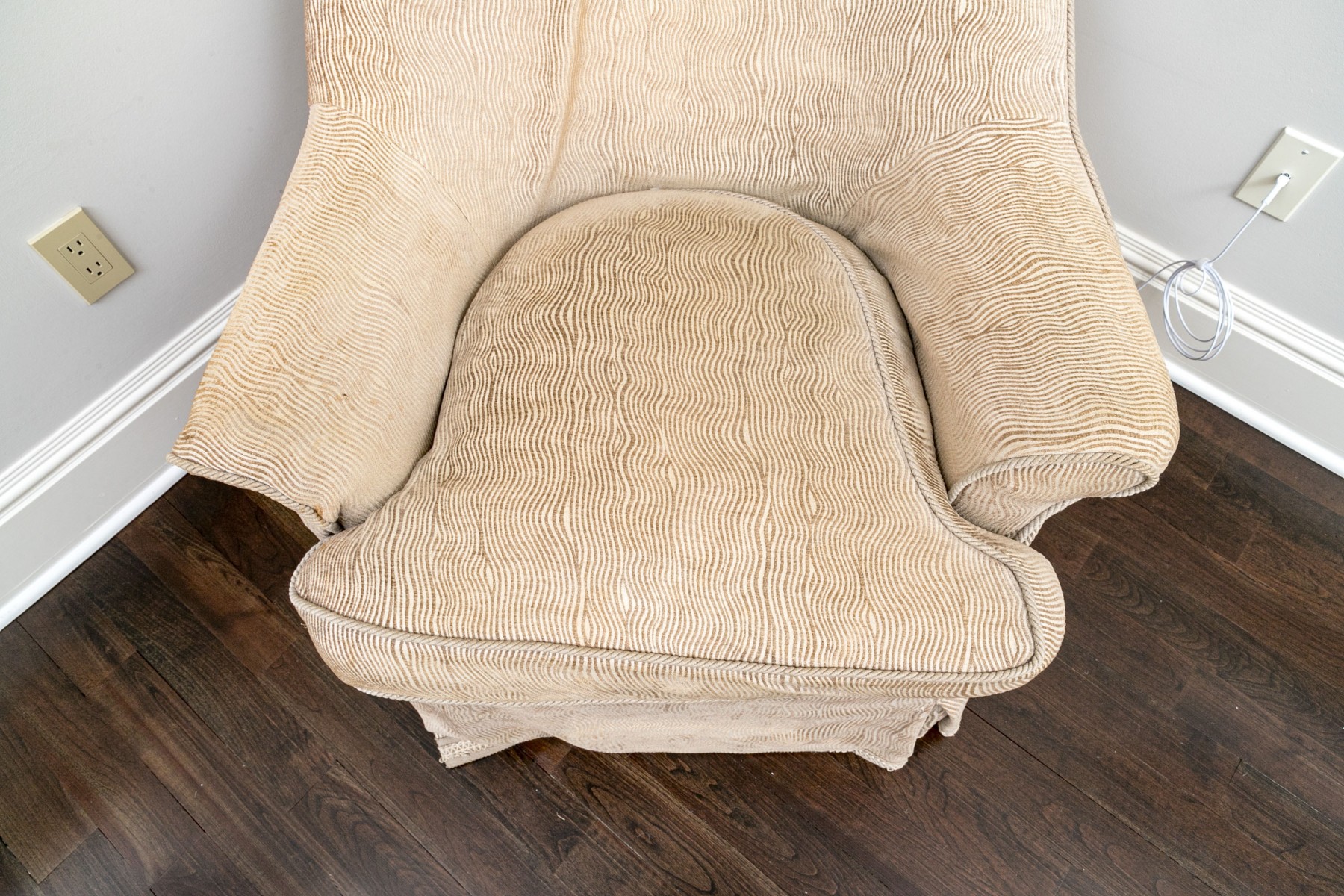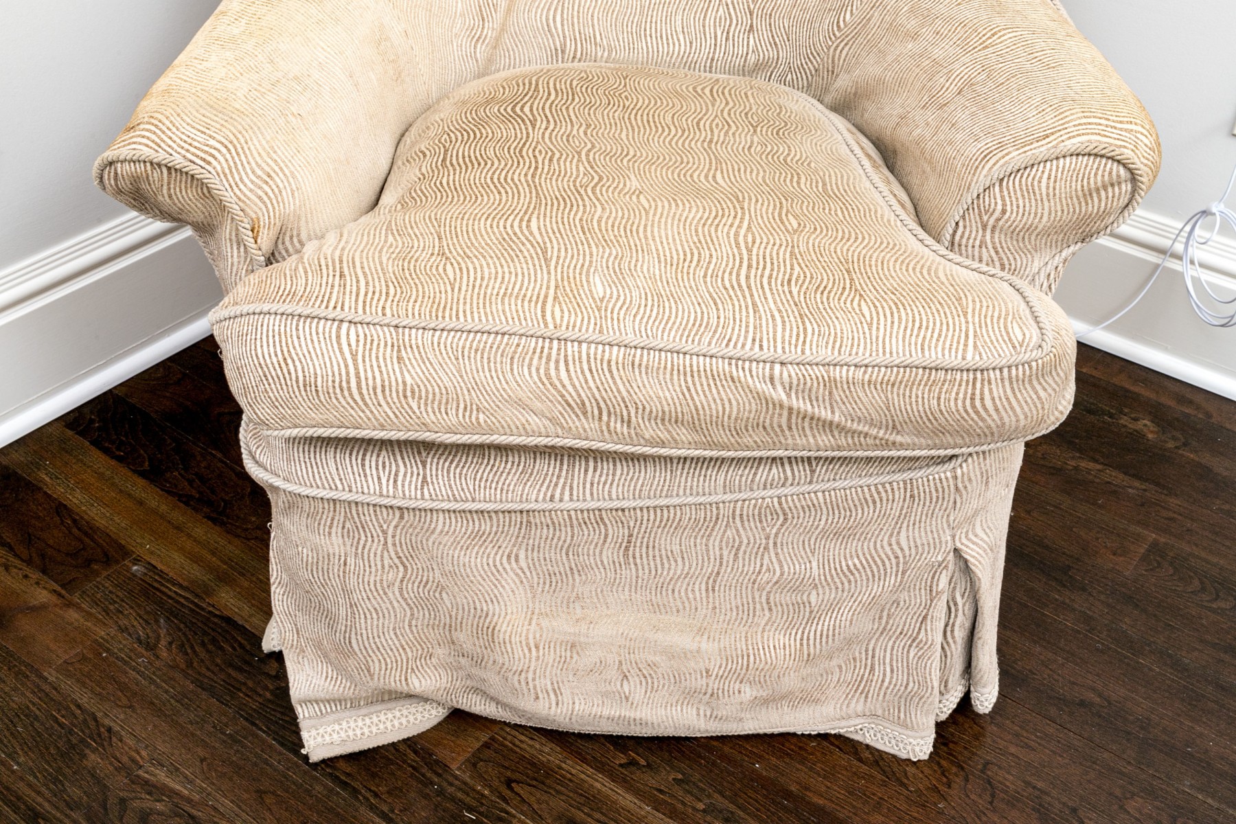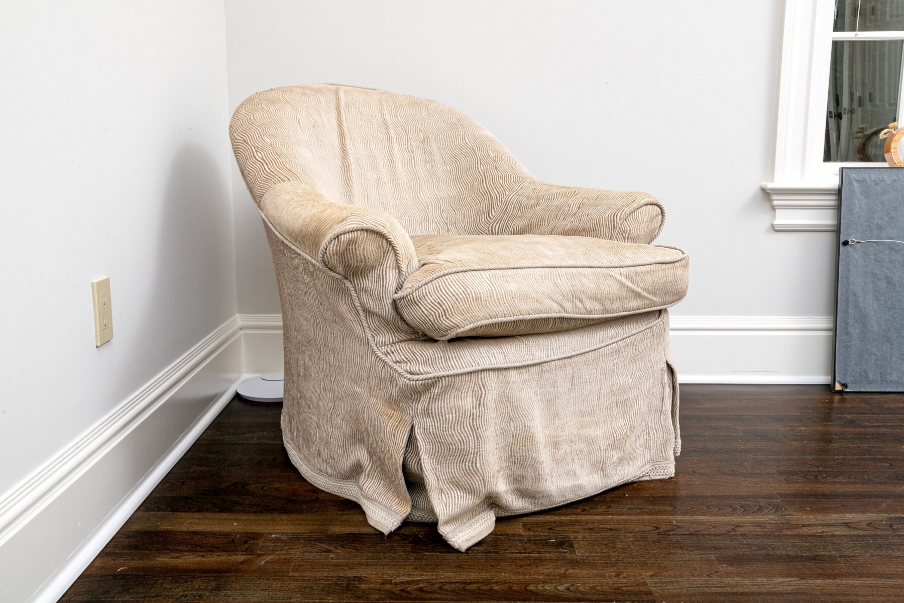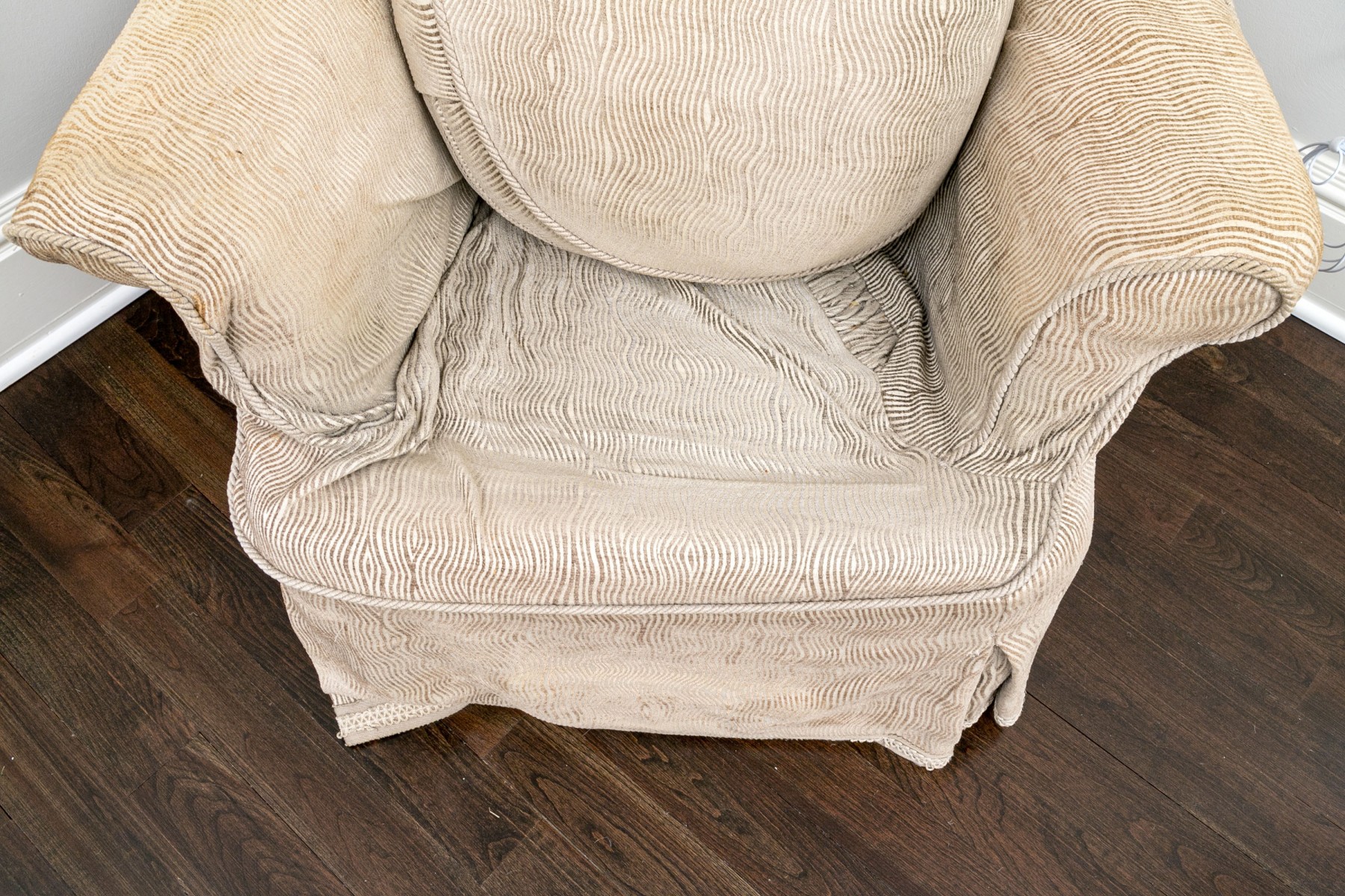 Some embroidery pulling. The chair was not examined under the slip cover. The cushion needs to be adjusted