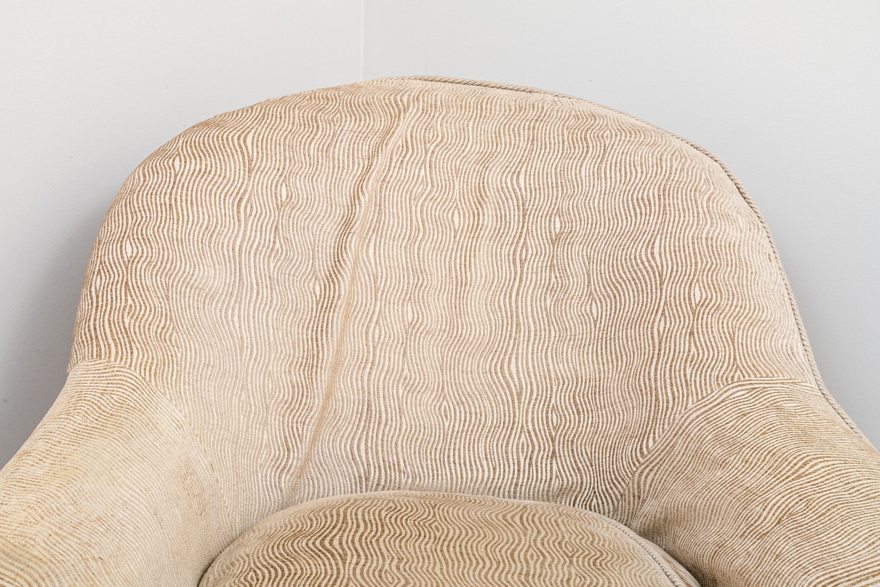 A tub back zebra pattern accent chair with removable seat cushion and a matching skirted apron having an embroidered end.