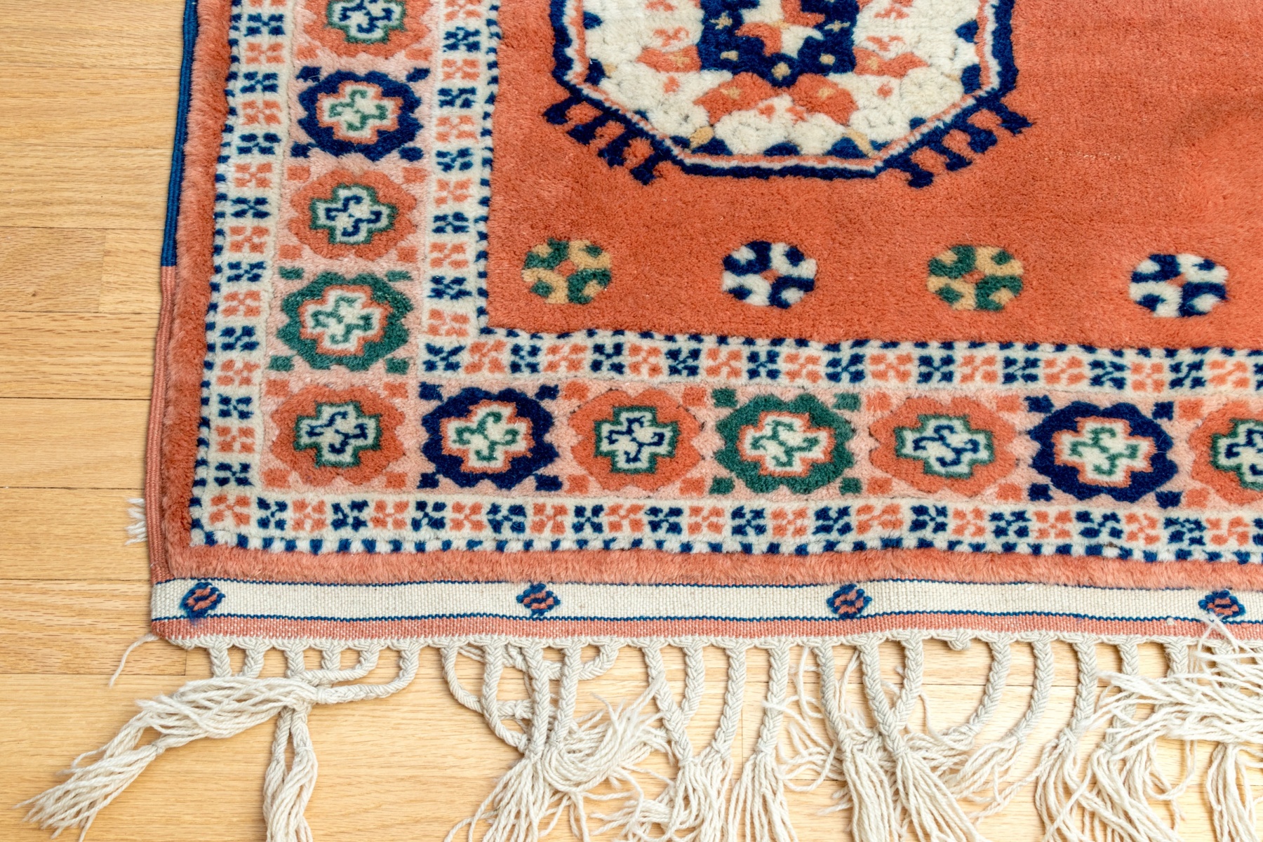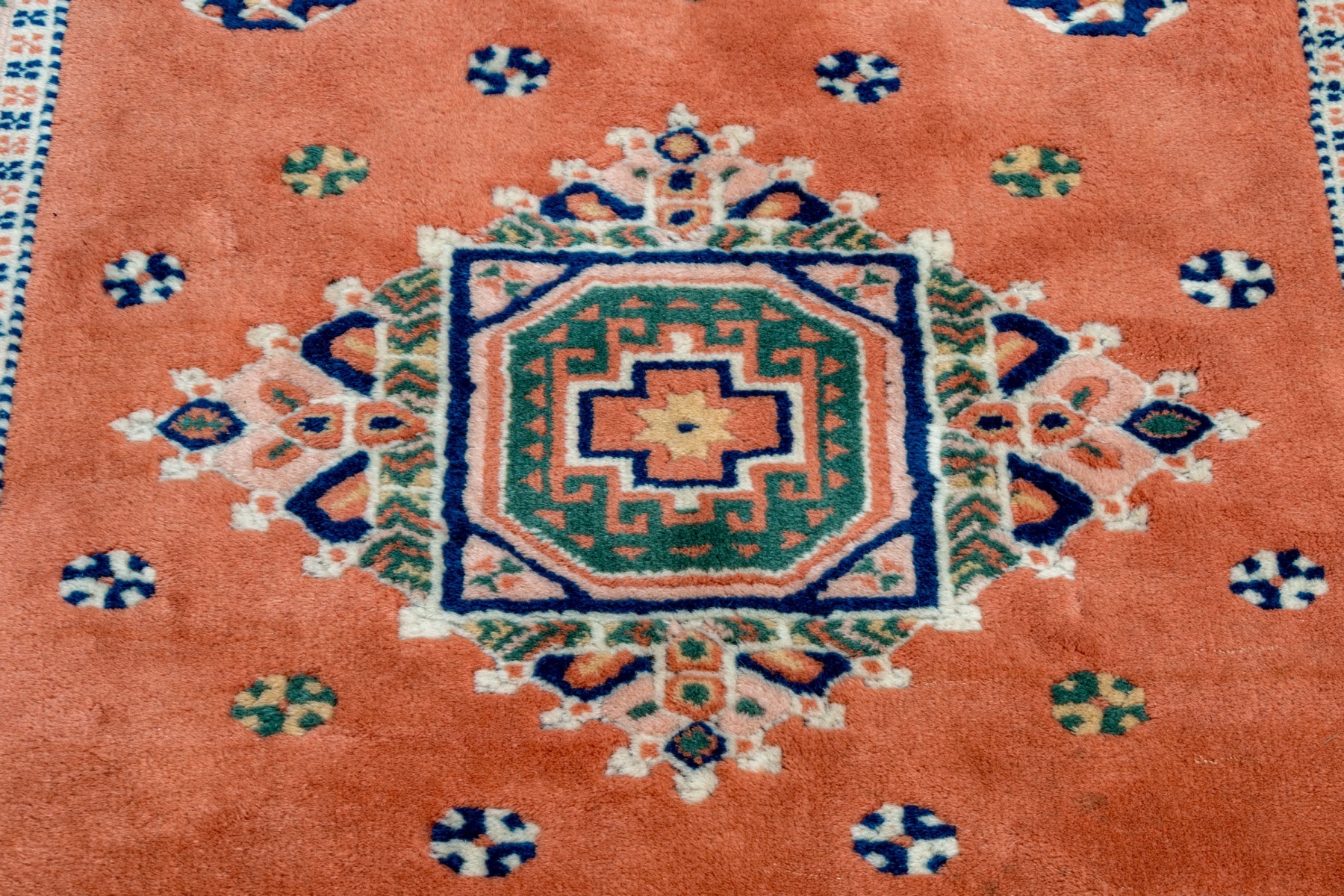 A beautiful Turkish hand-knotted wool accent rug showcasing a wide, pale salmon pink main border of alternating geometric floral motifs flanked by white guard borders with blue and salmon quatrefoil motif surrounding a pretty salmon pink field. The field is designed with a large central diamond shaped medallion and four smaller octagonal medallions at the corners, surrounded by other small medallions in blue, green, yellow, and white.