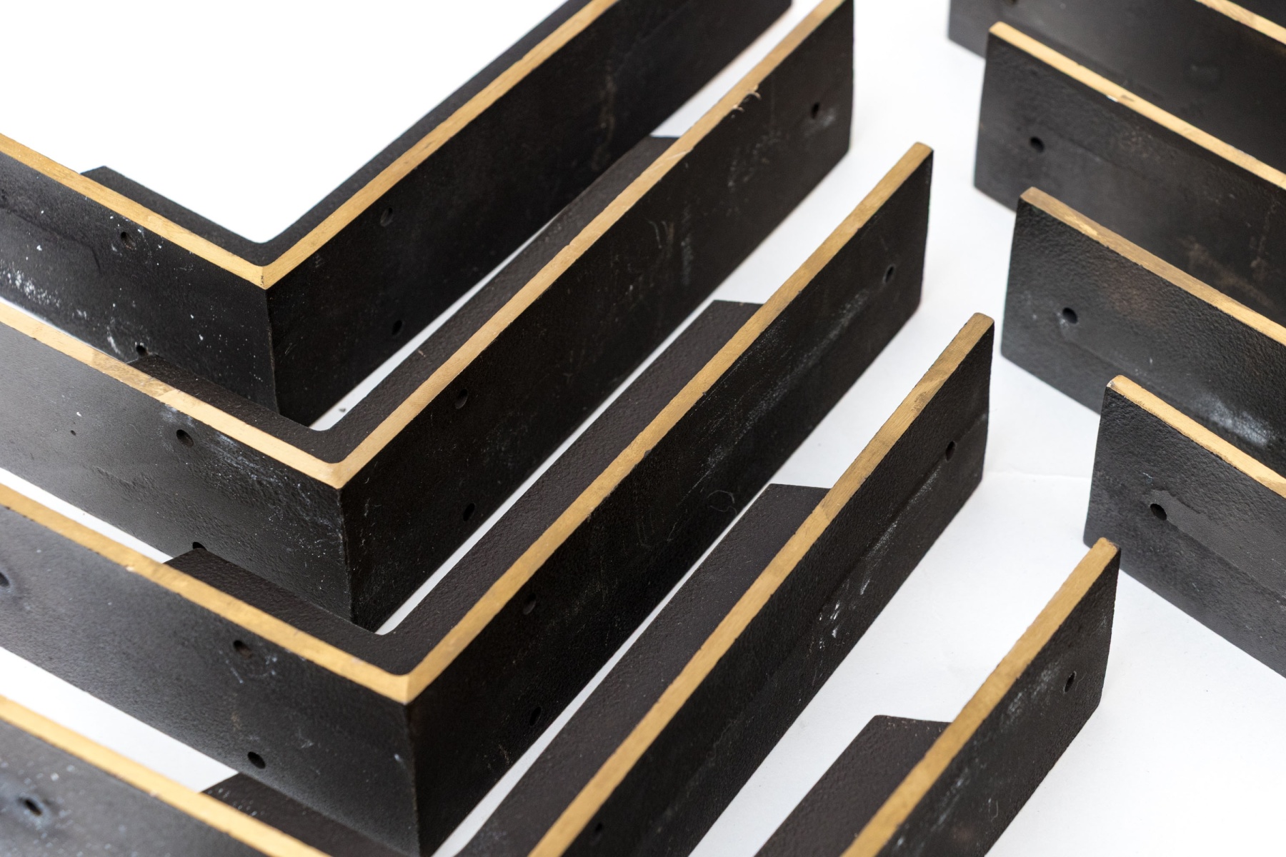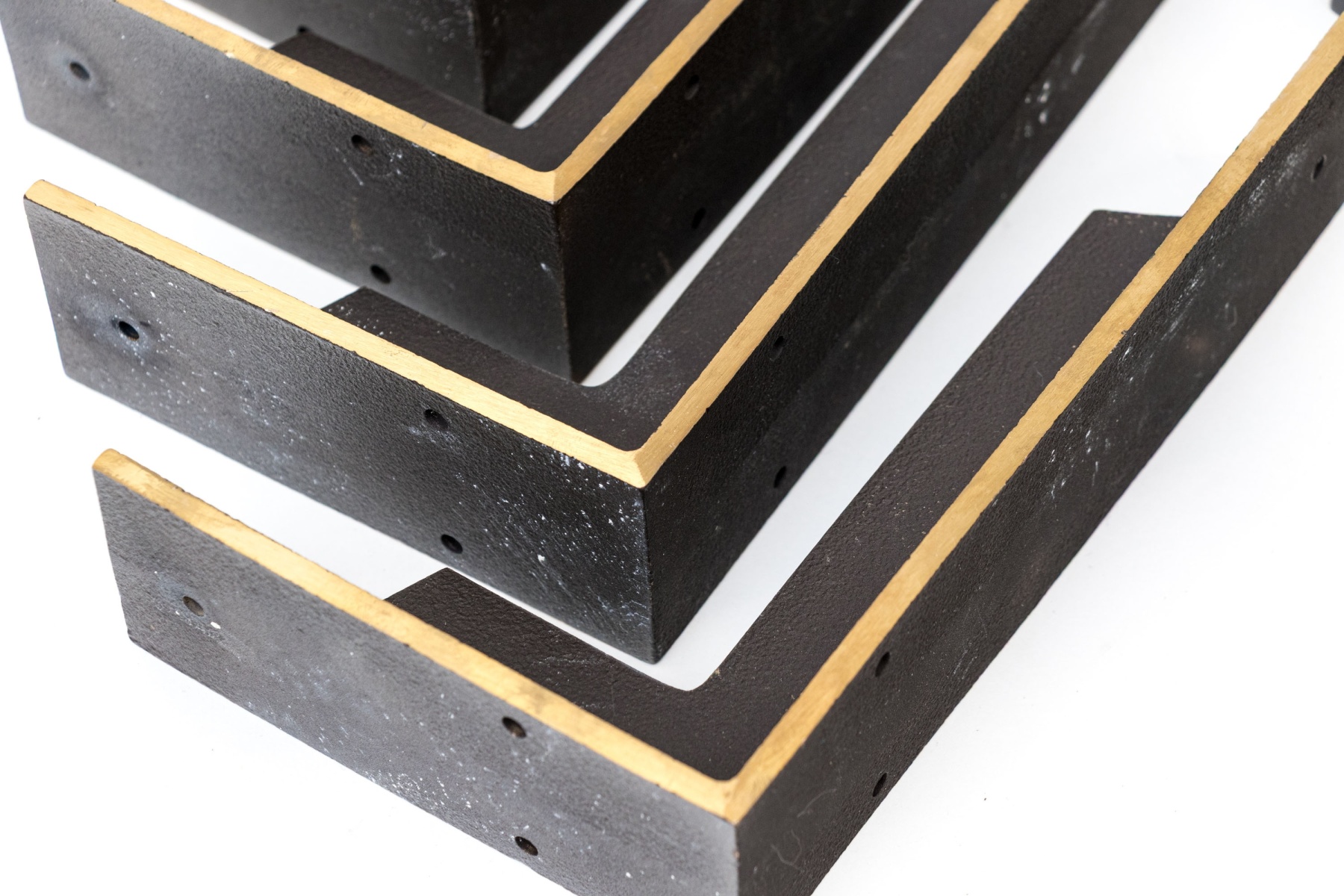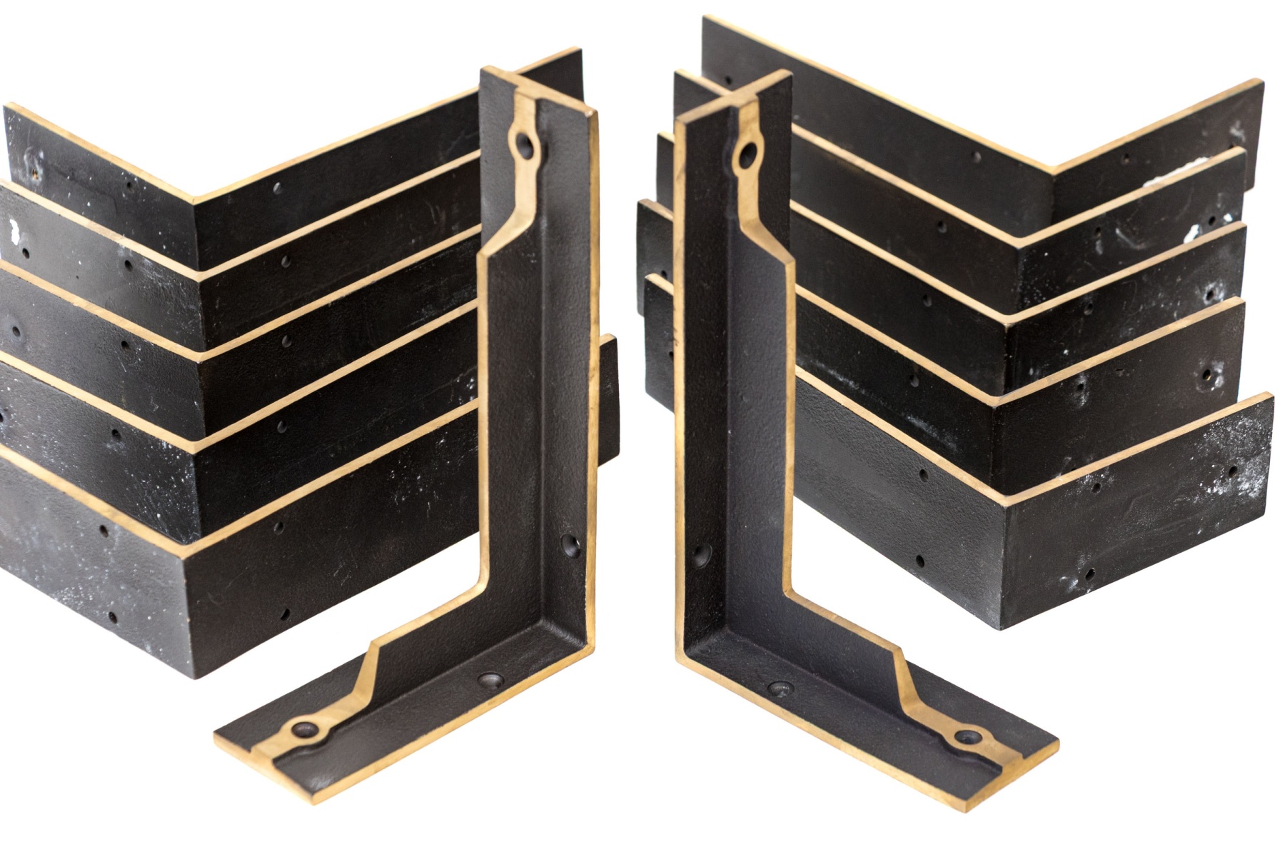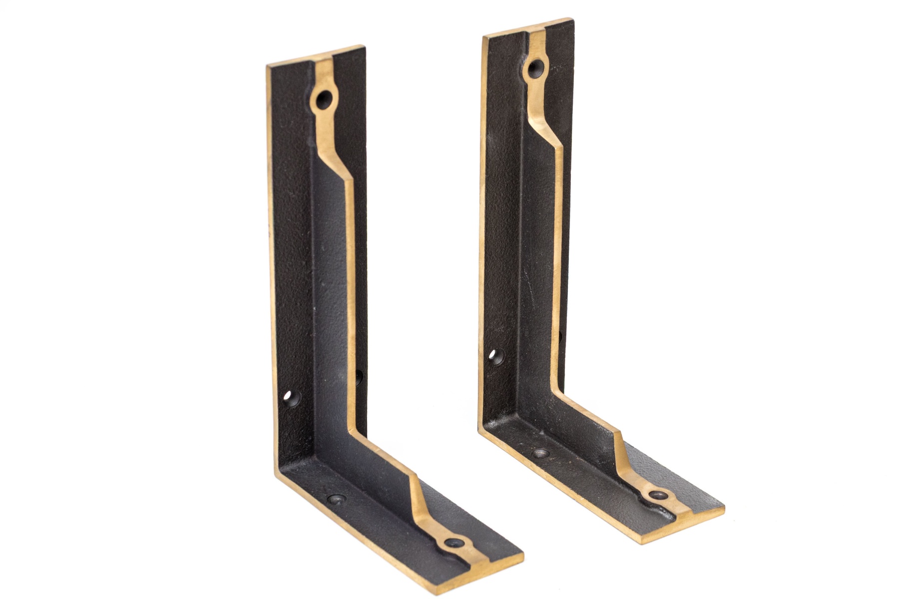 twelve substantial solid brass wall brackets, each showcasing a timeless architectural form and rich, polished patina. Ideal for displaying art, shelving, or decorative objects, these weighty supports blend functionality with refined design