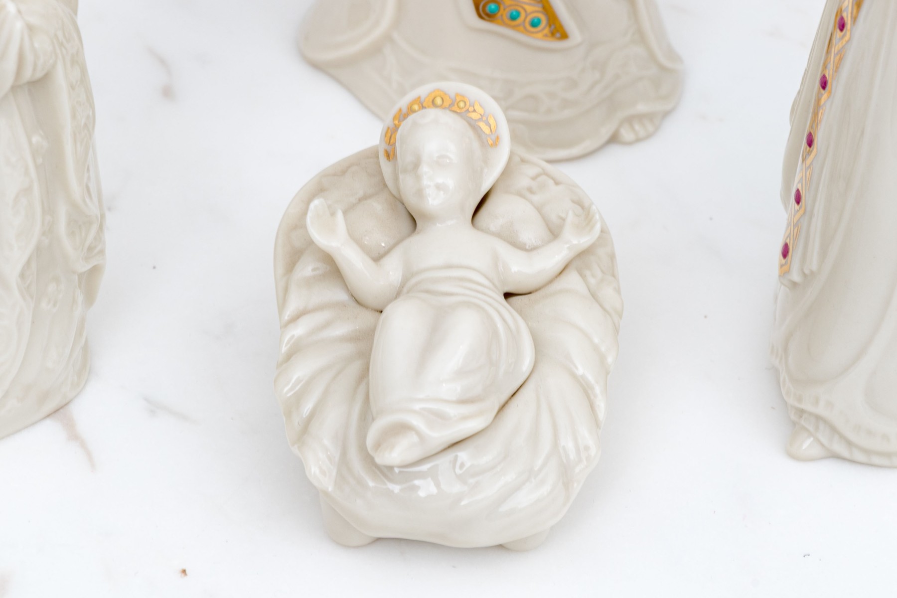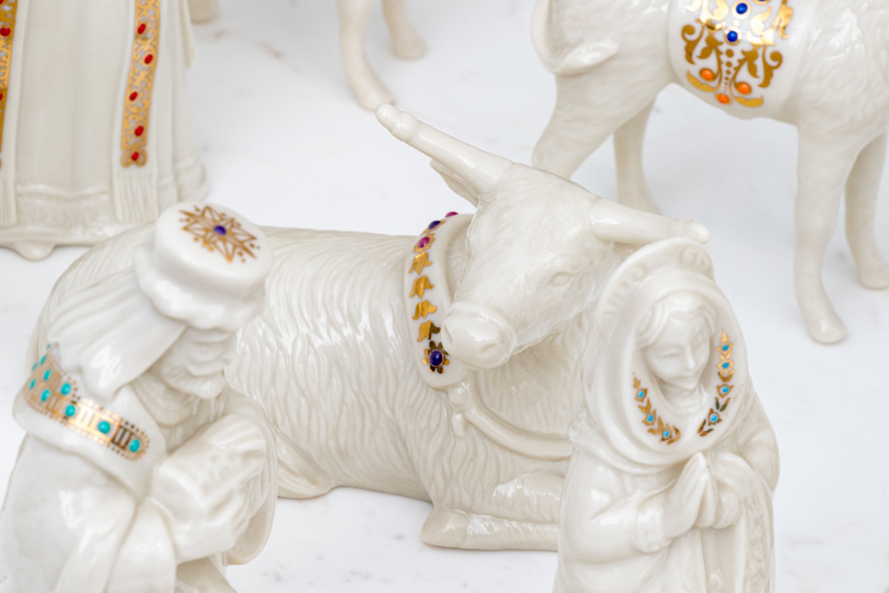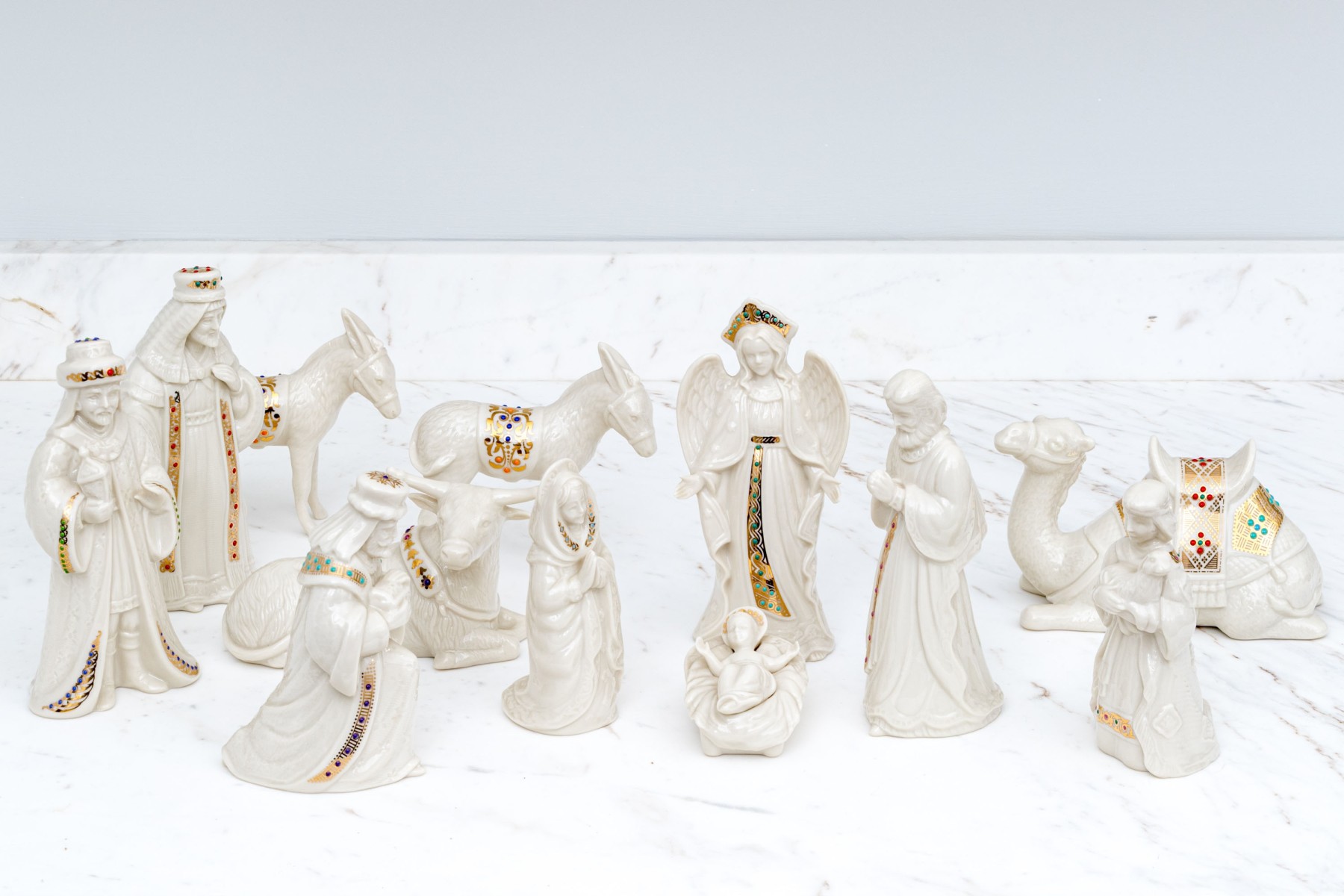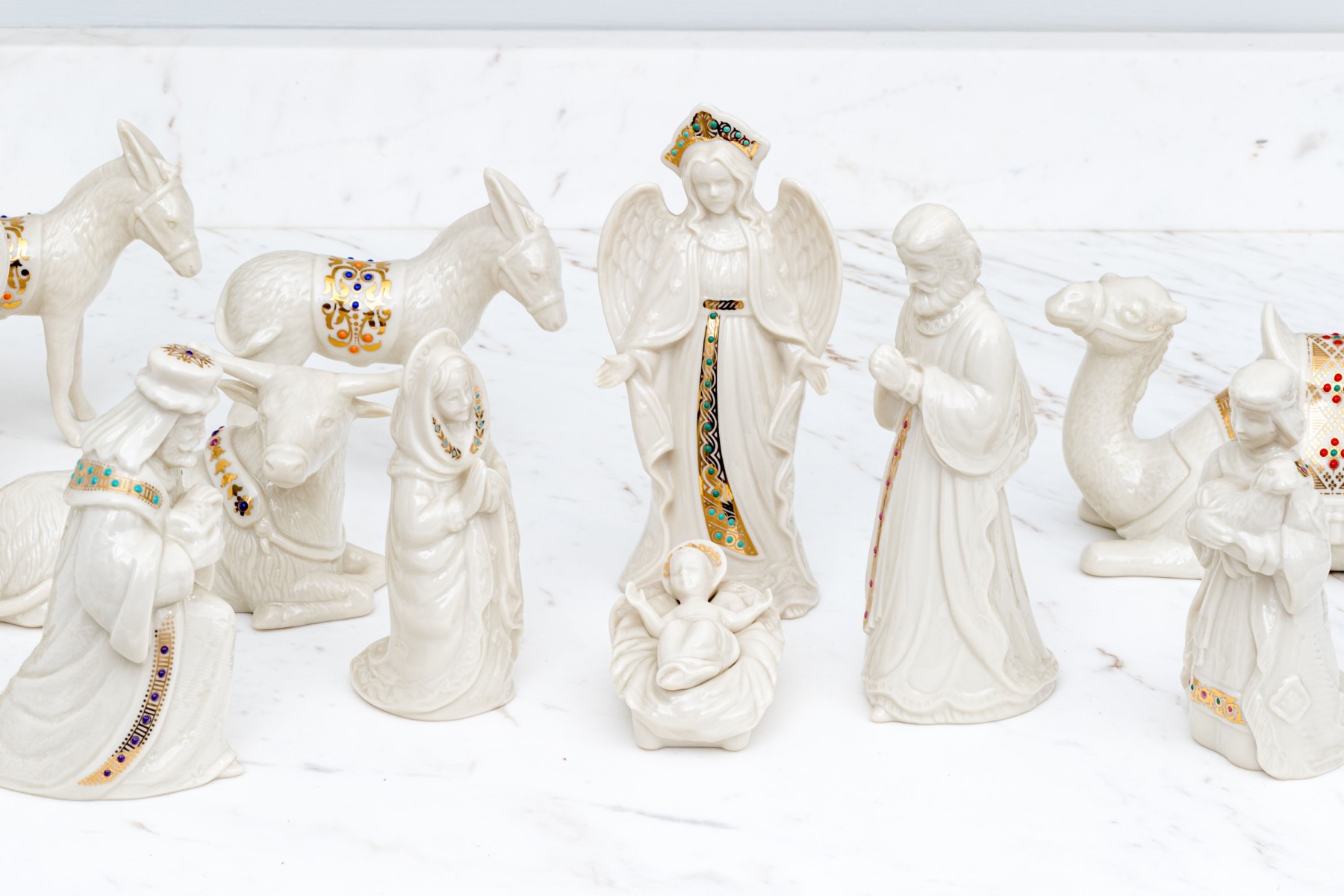 A wonderful Lenox nativity set comprised of twelve pieces including baby Jesus, Magi, reclining bull, camels and more.