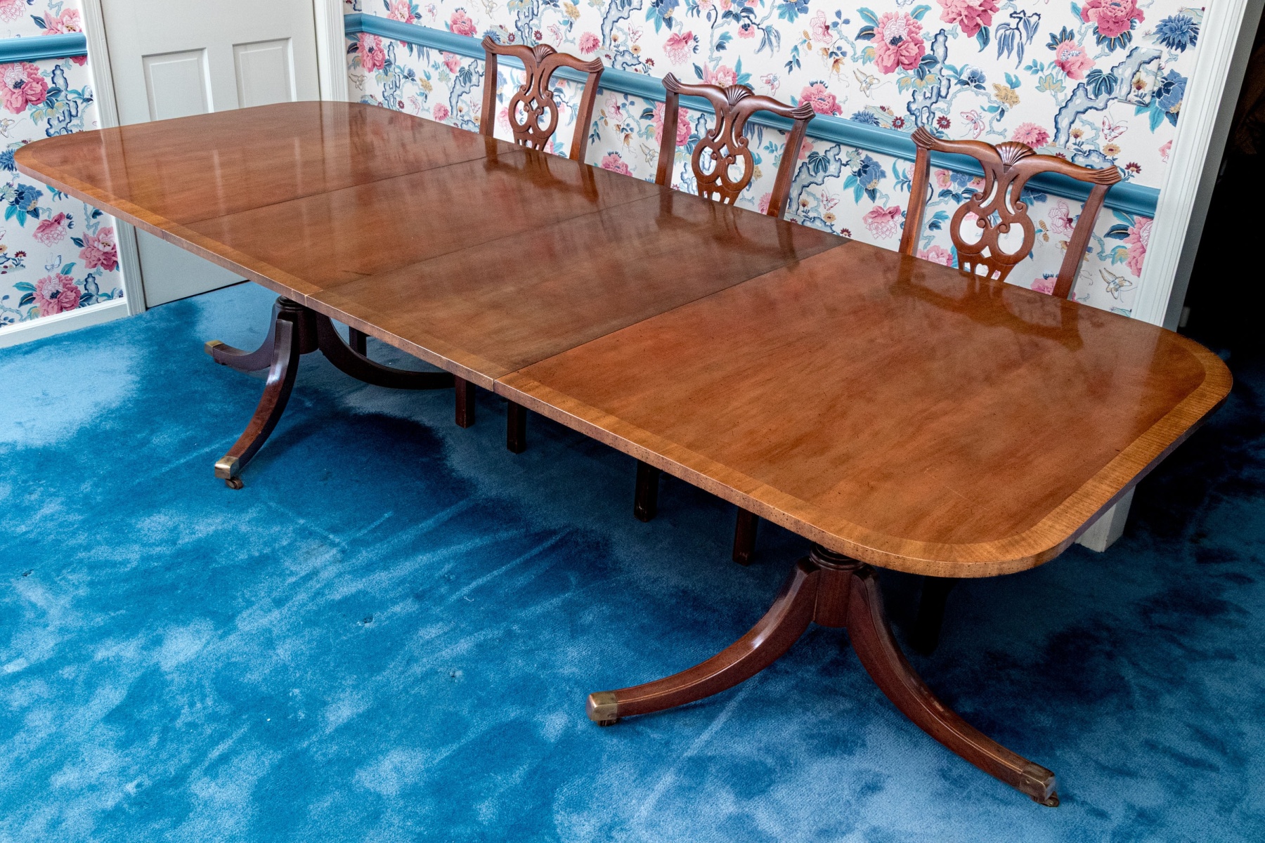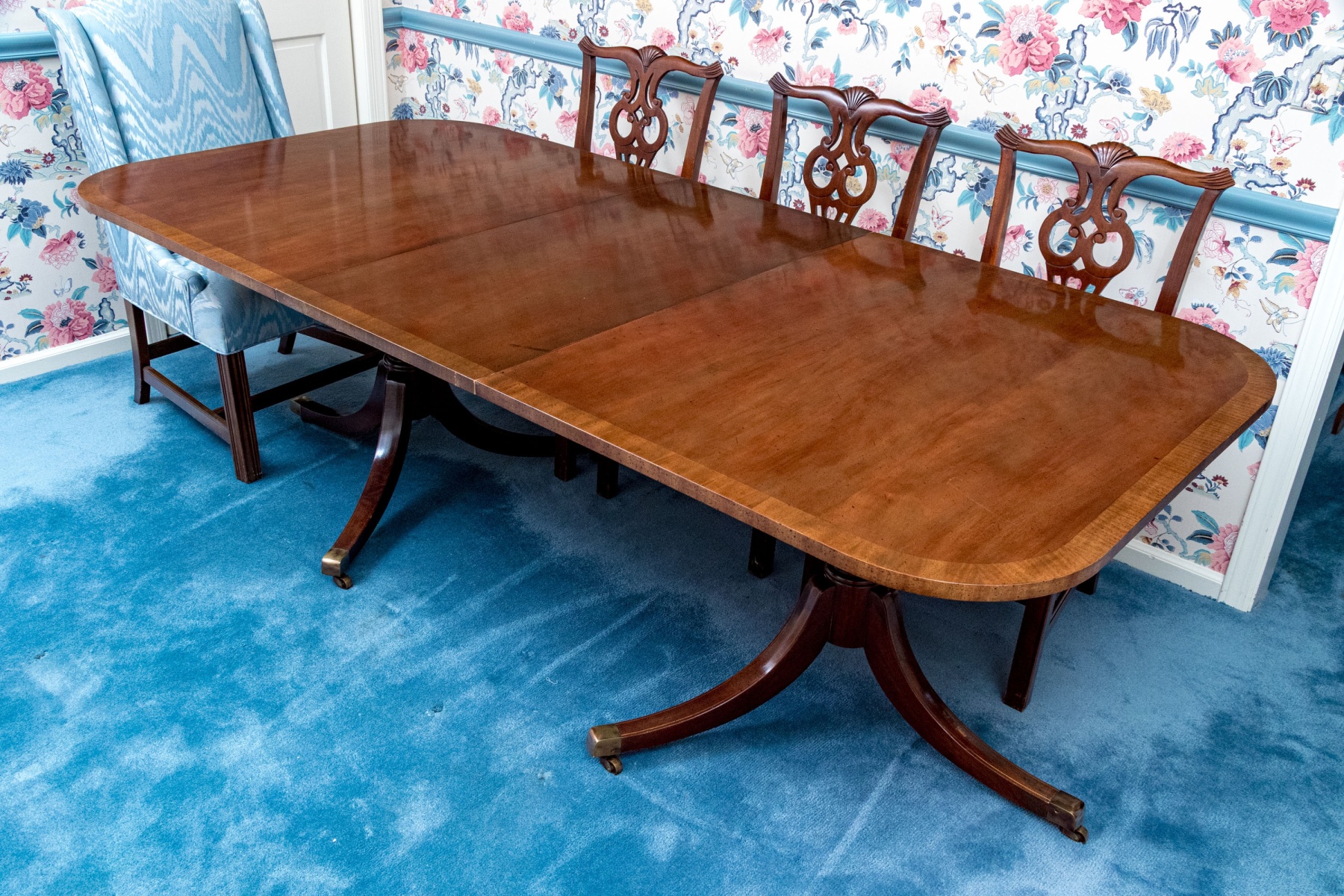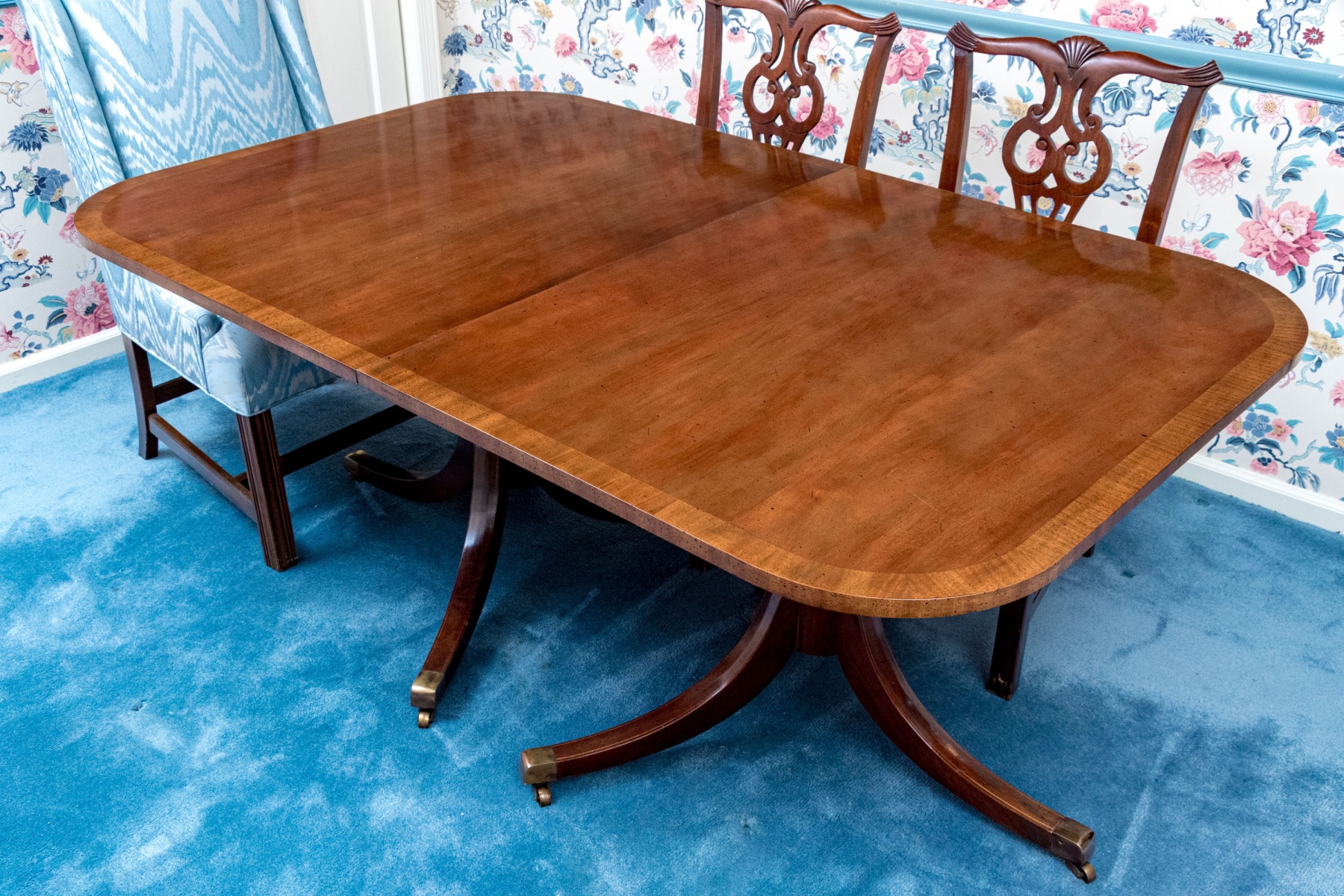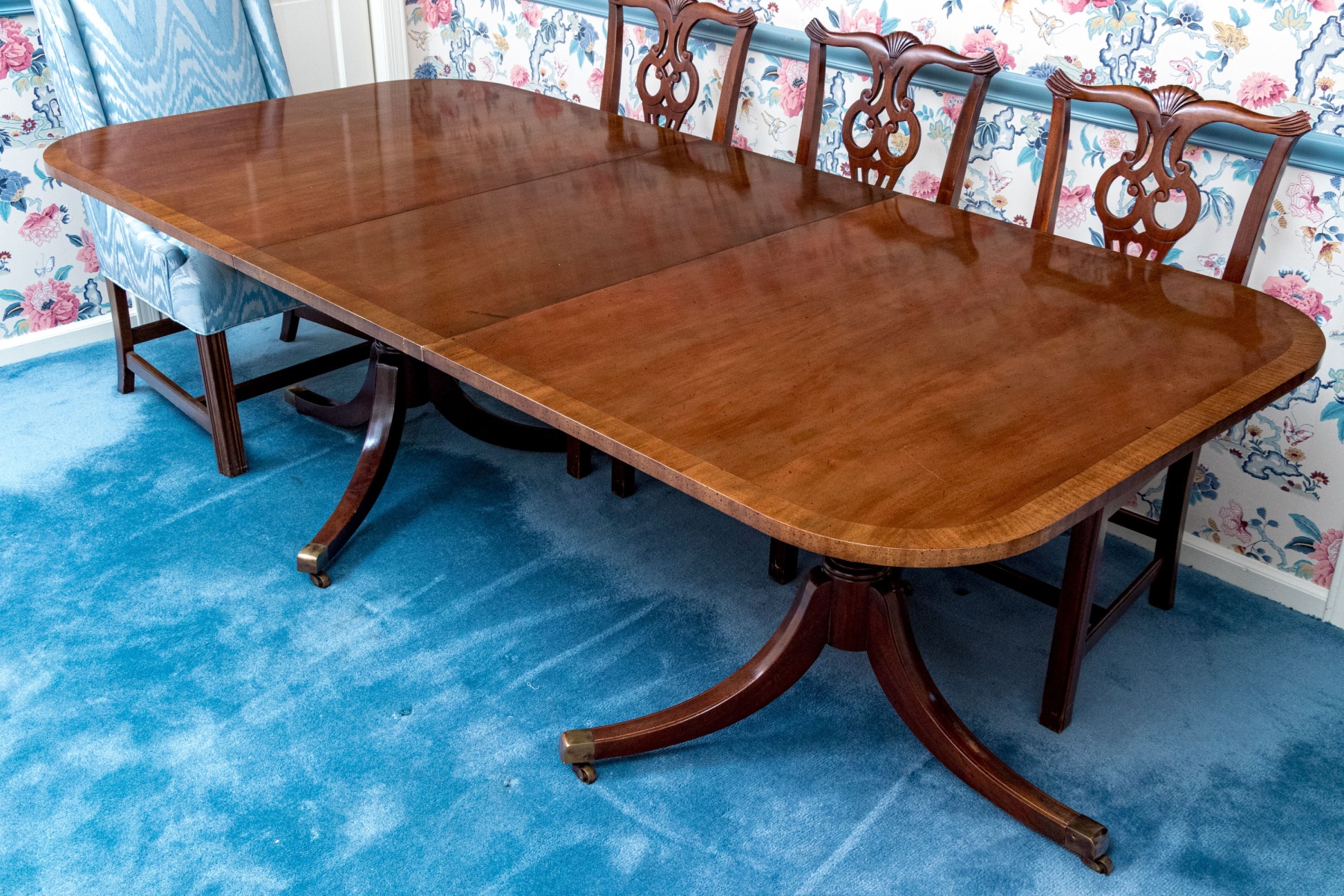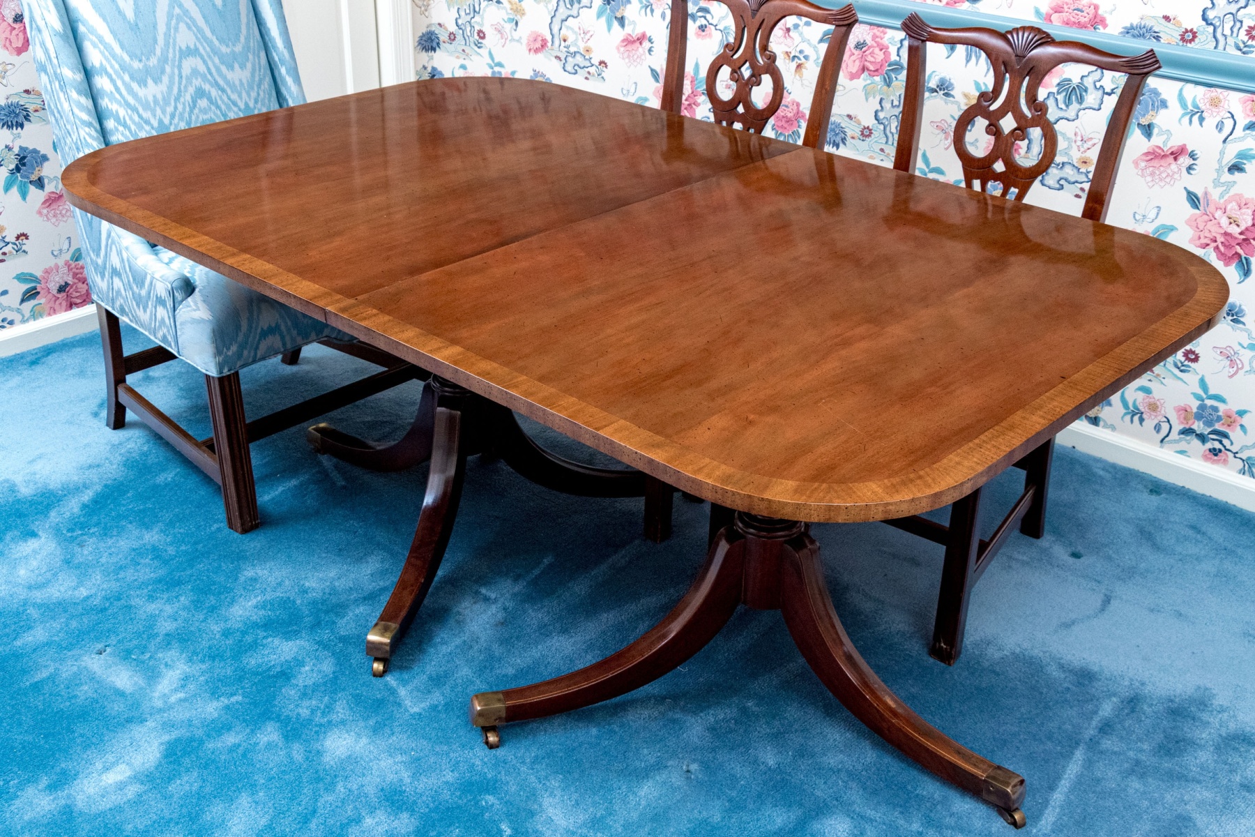 Twin Pedestal Banded Mahogany Extension Dining Table #465167. Black Rock Galleries provides high end estate liquidation services through online estate auctions and a 50,000 sq ft designer showroom. estate liquidator, estate sale, online auction, antiques, fine art, liquidation, clean outs, auction, consignment, interior design, fine jewelry, collectibles, appraisals, estate appraisals, estate services, decor, furniture, furniture consignment, antique center, consignment shop. We offer appraisal services and specialize in fine art, jewelry, antiques and decorative arts. Sell with us. Black Rock Galleries is the tri-state's largest estate liquidator serving New England and the greater New York City area. We are the trusted source for expert appraisals, auction services, estate sales, and consignments. Black Rock Galleries is the east coast's largest and most trusted estate liquidator, with locations in Connecticut, greater Boston, MA and Raleigh, NC, Fairfield, Southport, Apex, TX. We are the best source for expert appraisals, auction services, estate sales and consignments. We have served thousands of families and estates with compassion, professionalism and expertise. BRG works with attorneys, executors, realtors and families to bring the greatest return on personal and estate property in the current market. Our unique combination of services make us the easy choice to get the job done in a timely and stress-free manner. We are with you from the initial consultation to the final clean out. Our house-built online auction software platform offers clients a dynamic approach to liquidating their personal property. This venue is most successful in bringing the best return with the least amount of disruption for our clients. See our services page for a complete description of this offering. Twin Pedestal Banded Mahogany Extension Dining Table #465167