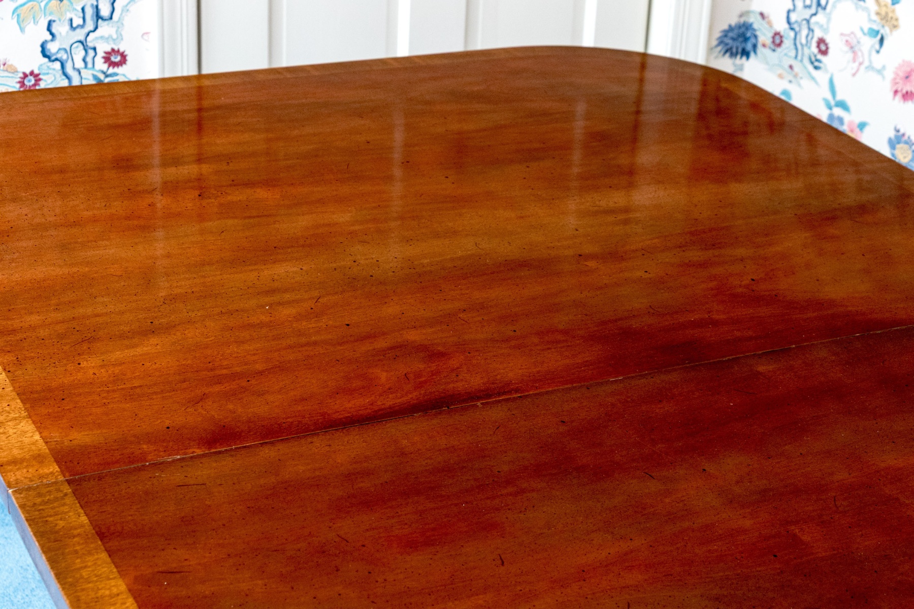 A high quality double pedestal extension dining table originally retailed by G. Fox & Co. with classic Regency appeal, showcasing a rounded rectangular top with a beautifully polished finish and banded edge supported by two nicely banded and gently tapered columns with urn form knops heralding tripods of curved legs with brass capped toes and casters. Includes two extension leaves.