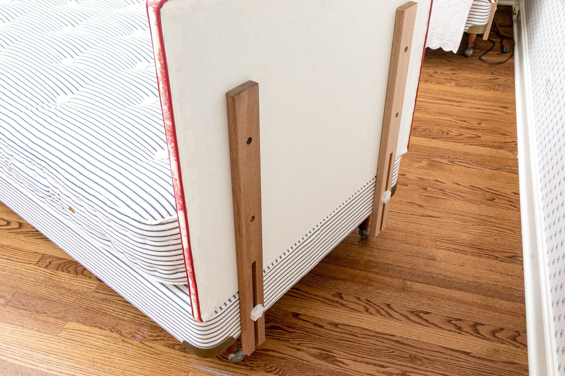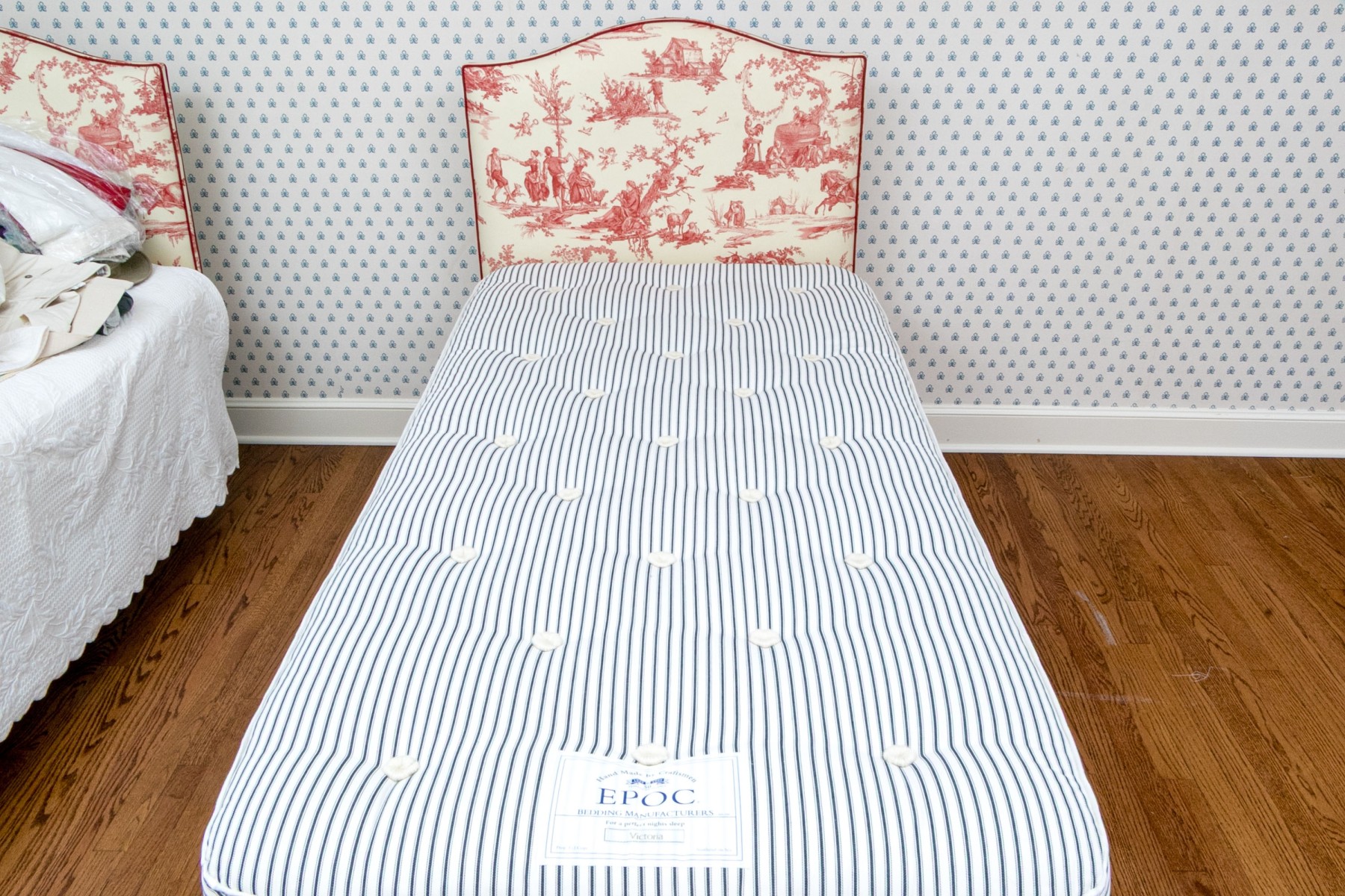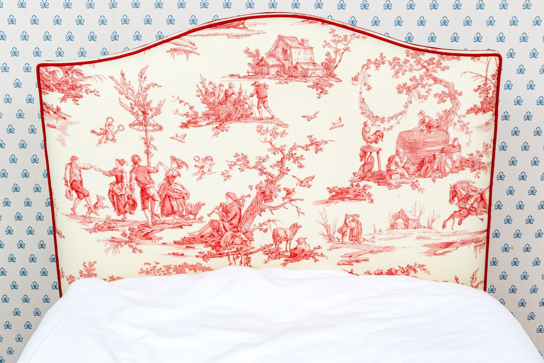 A delightful and high quality twin size bed featuring a serpentine headboard upholstered in red and cream toile with scenes of figures and nature. The platform frame supports a high quality EPOC "Victoria" button tufted mattress and matches the blue and white striped design. Raised on casters for easy mobility.