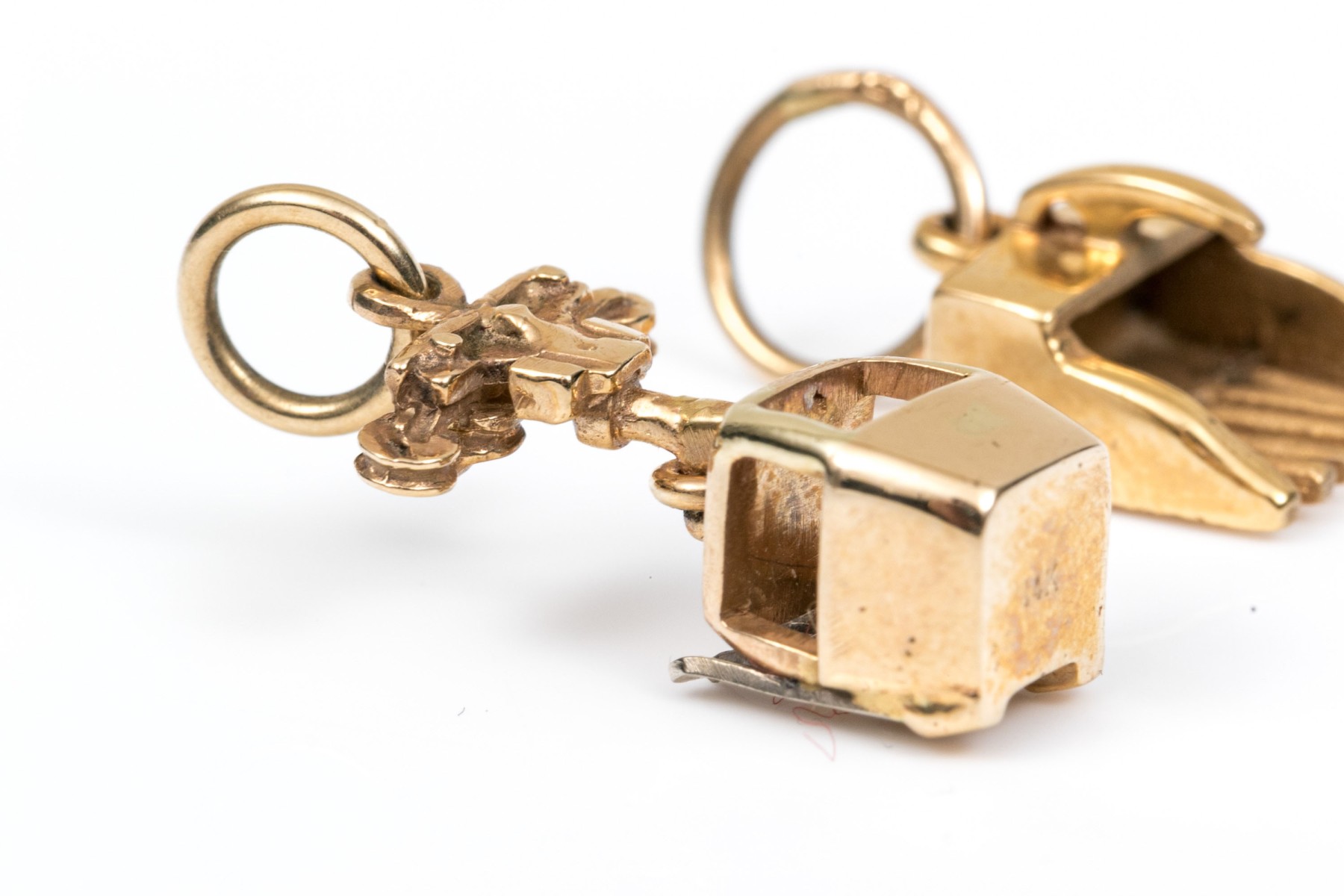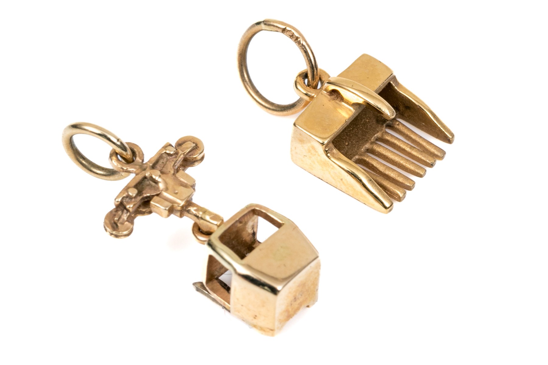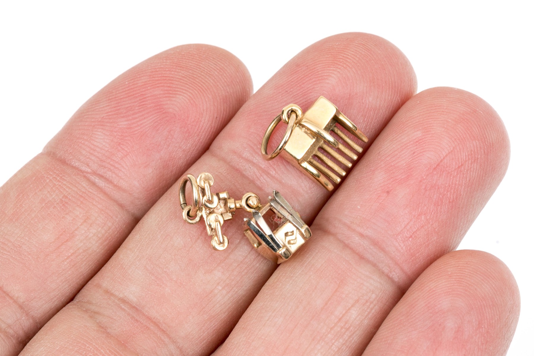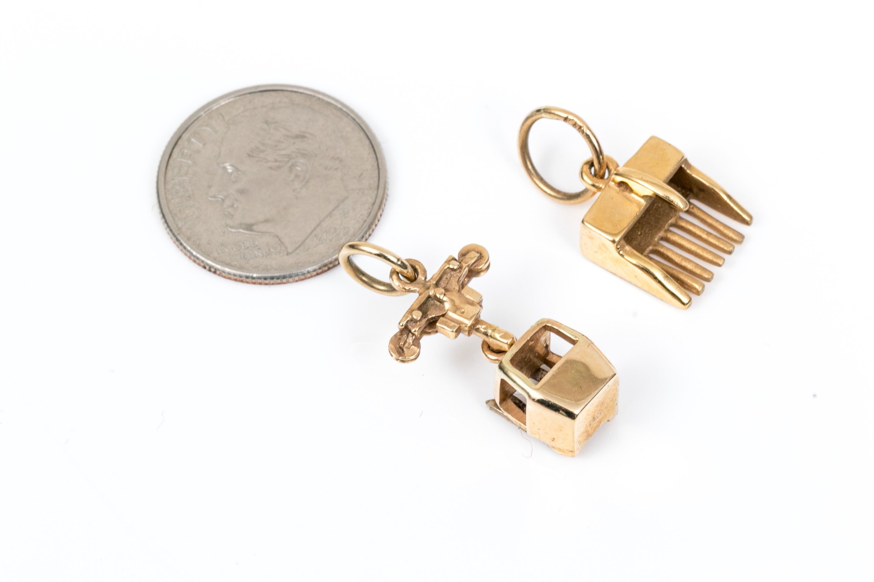 Two 14K yellow gold charms. The first is a miniature ski lift car and the second is a cranberry comb.