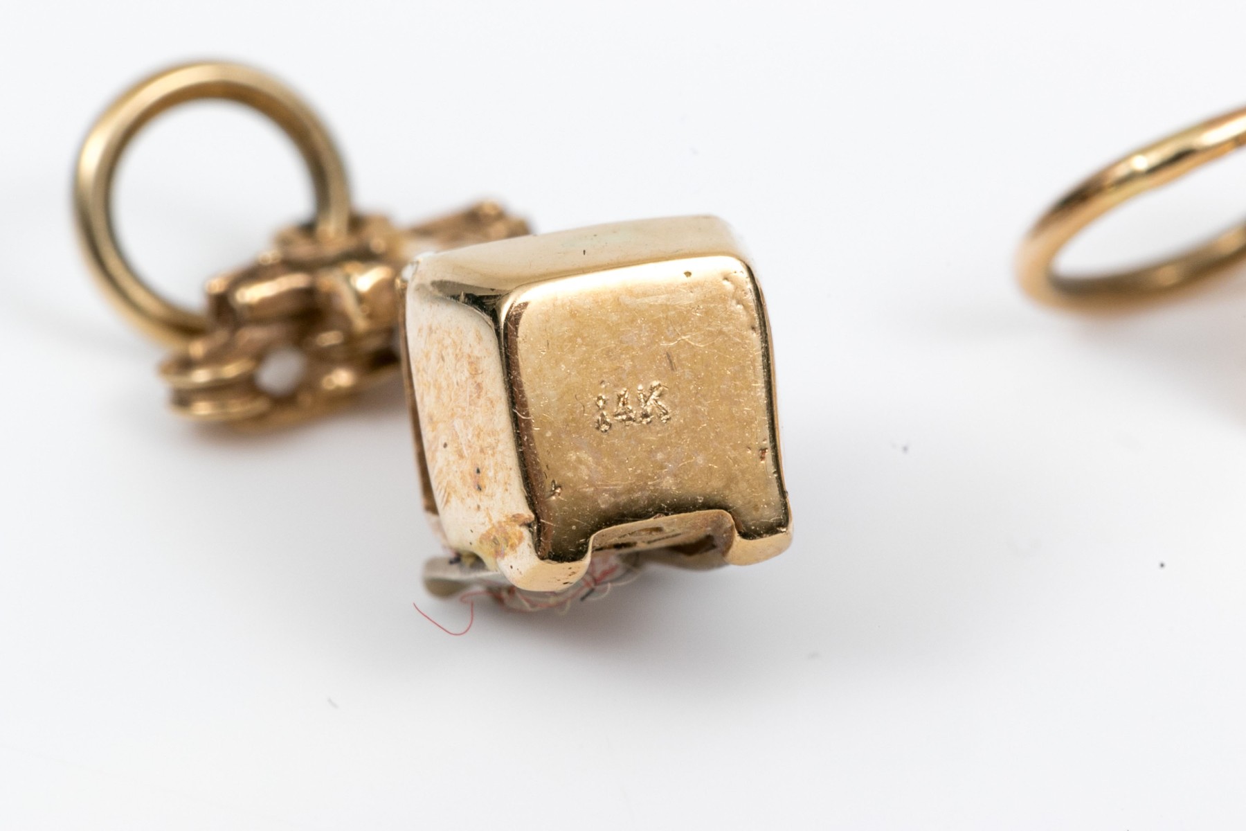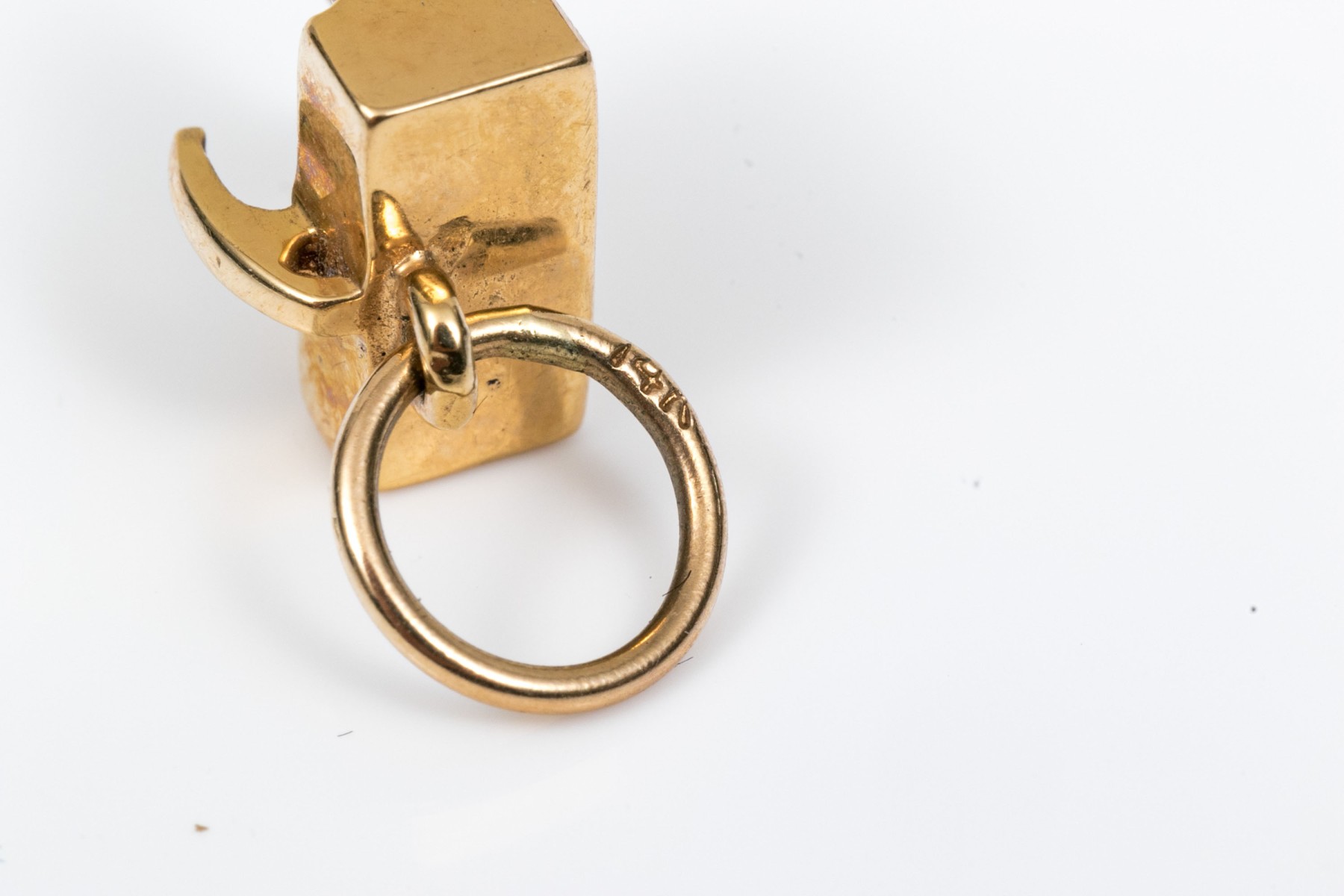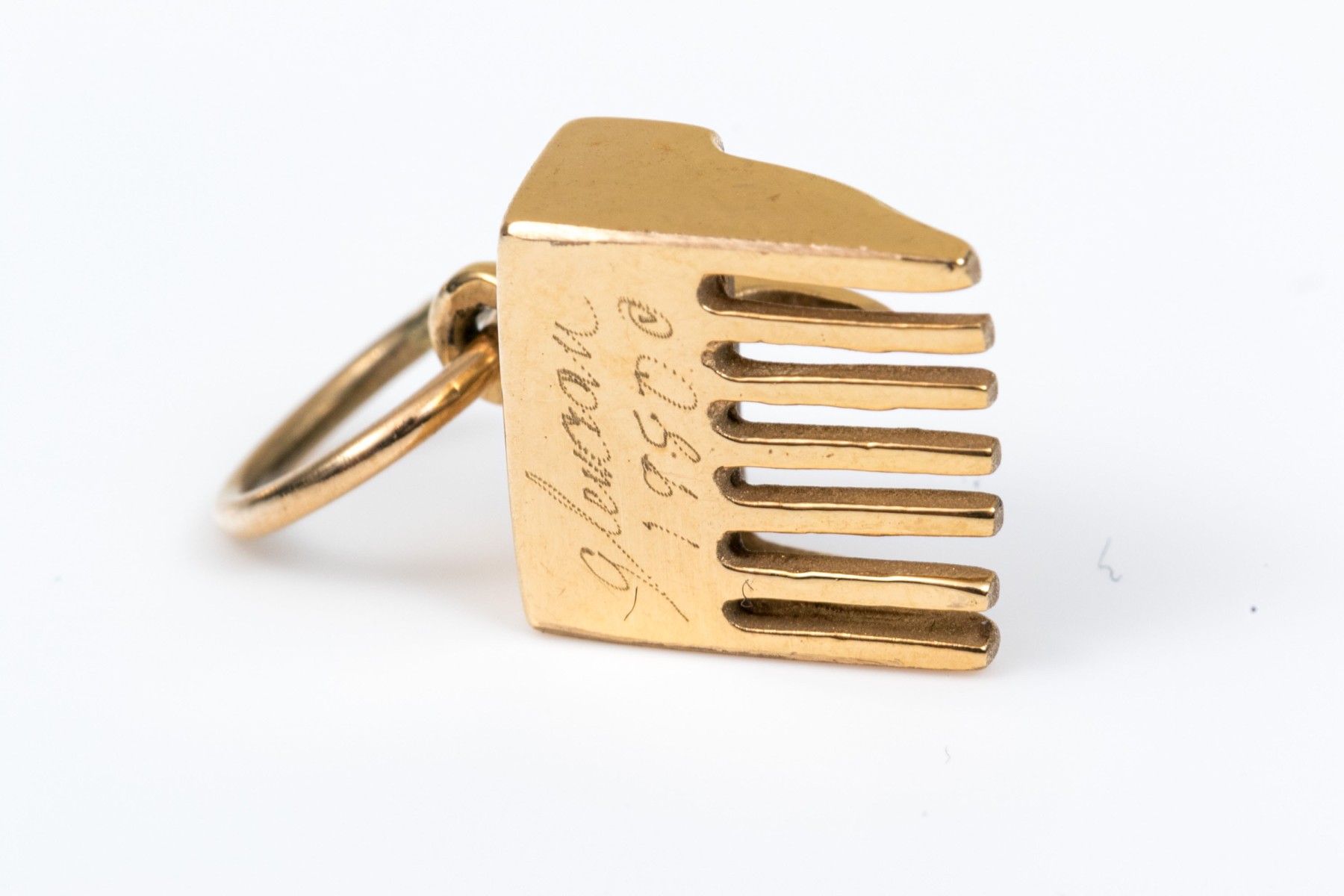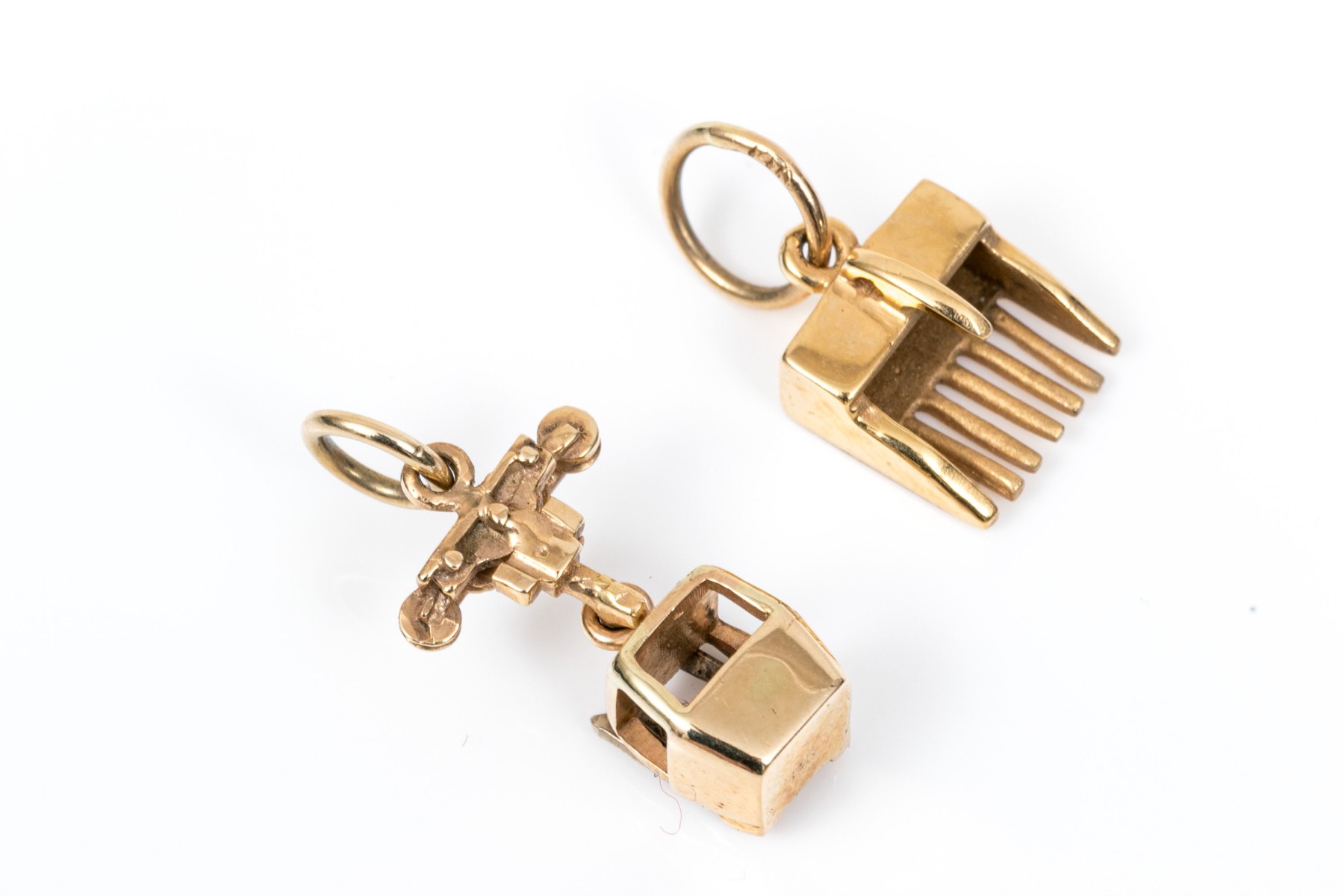 Two 14K yellow gold charms. The first is a miniature ski lift car and the second is a cranberry comb.