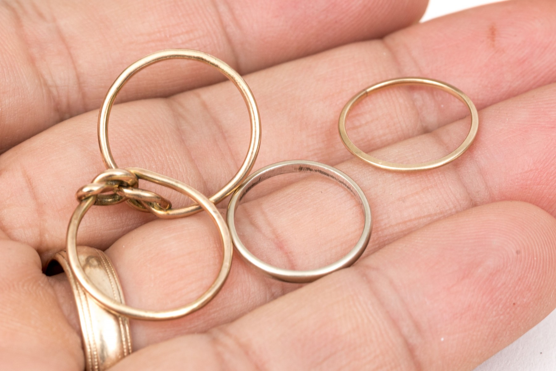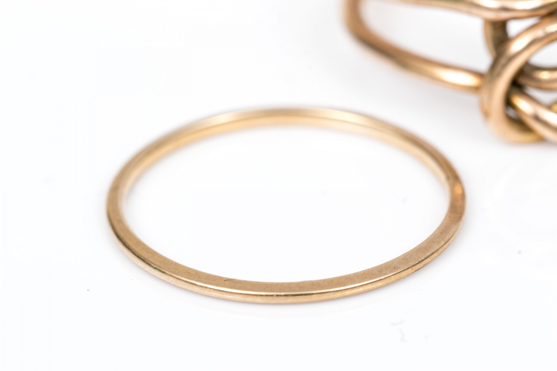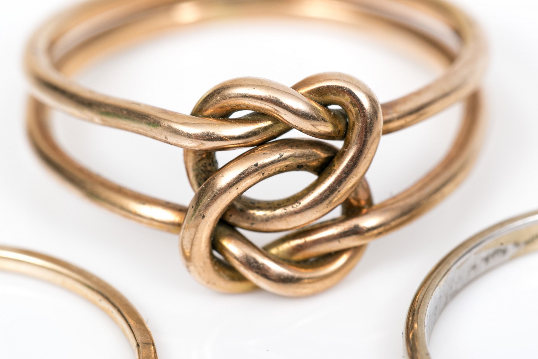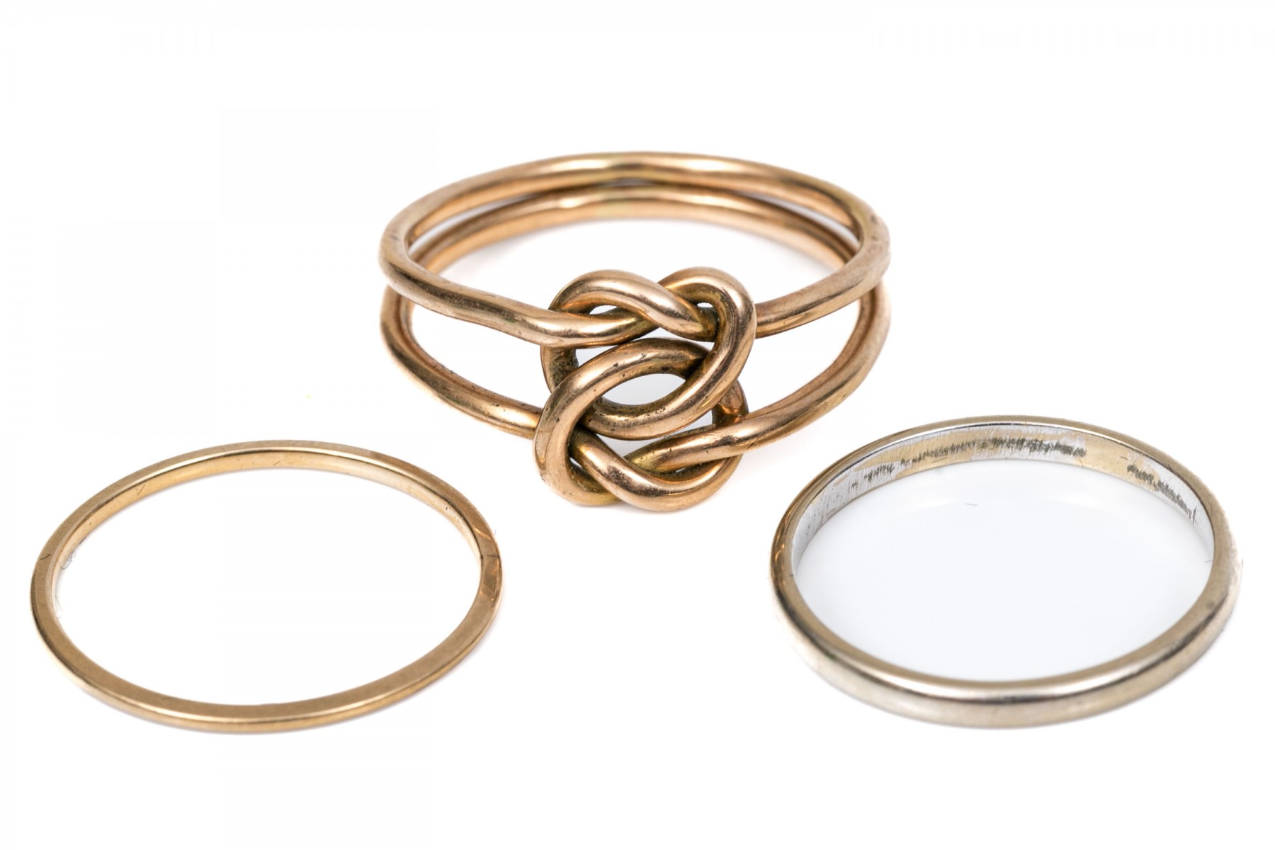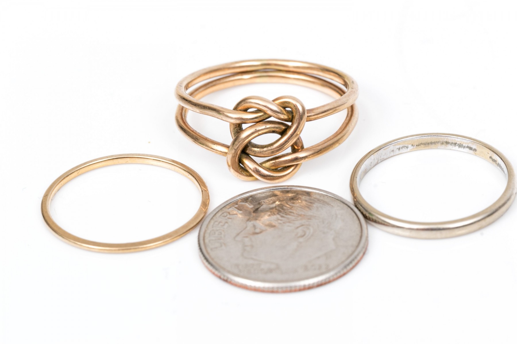 Two 14K yellow gold rings, one slim band style ring (size 5), and a unique knot ring with two bands connected at the knot (size 7.25). One 18K white gold rband style ring (size 5.25).