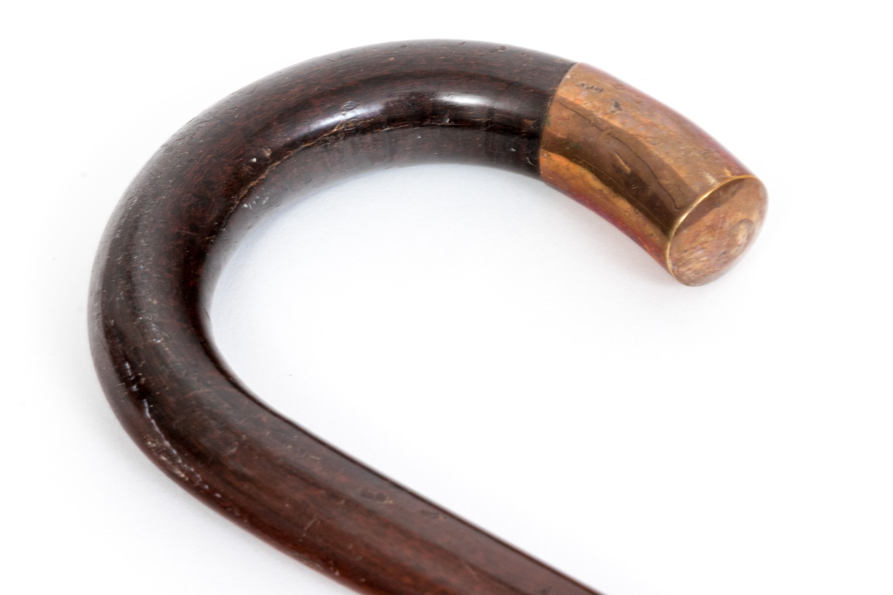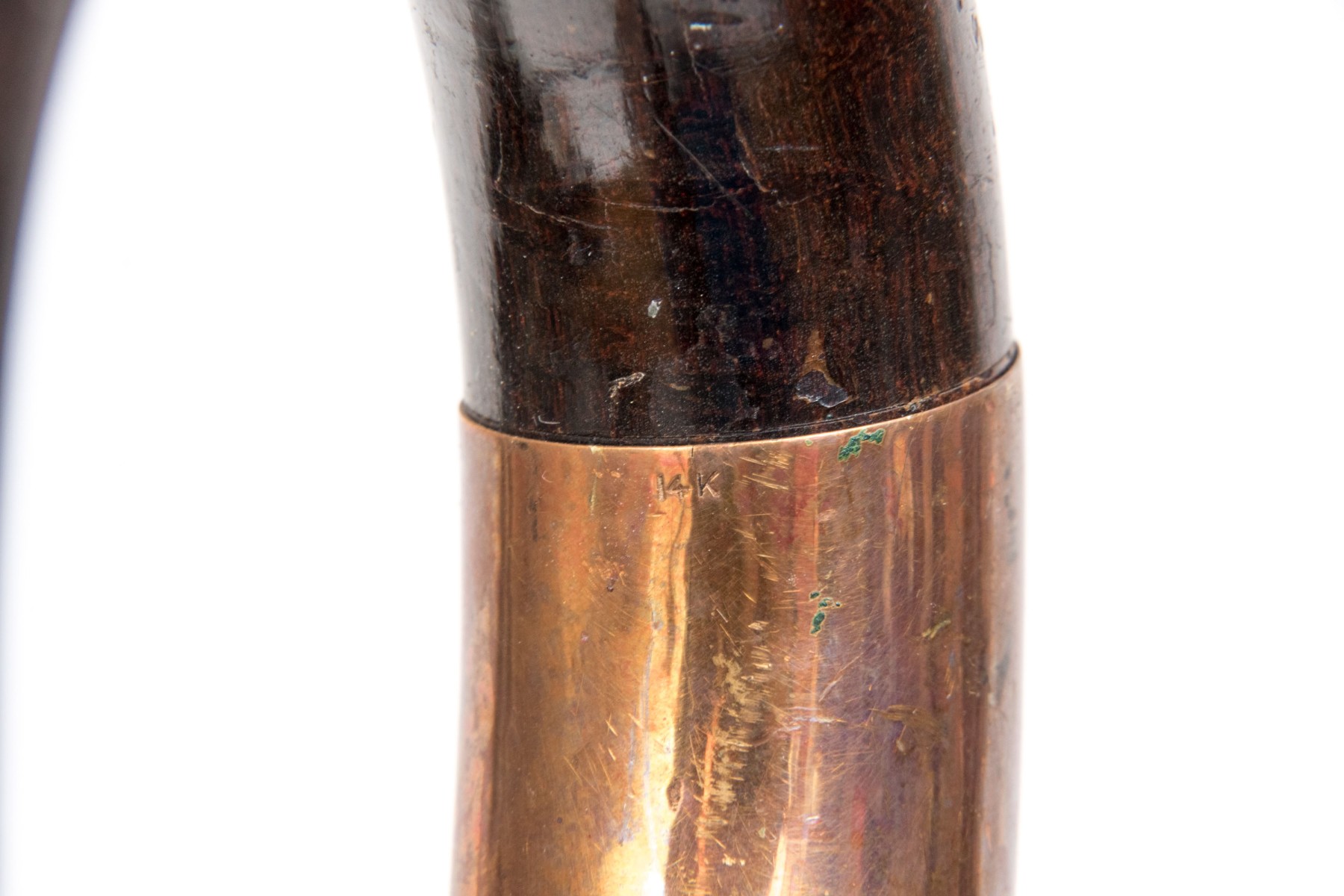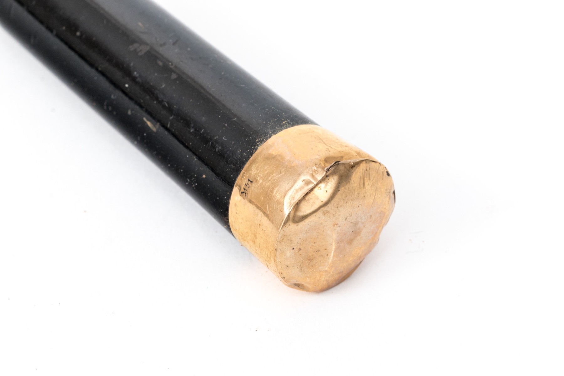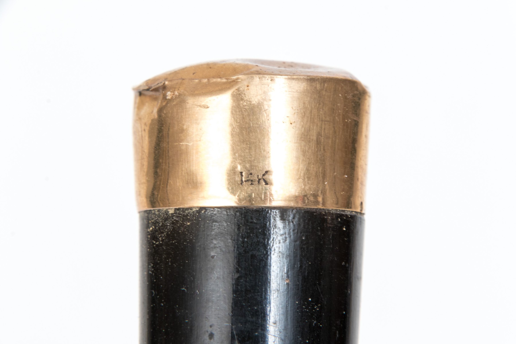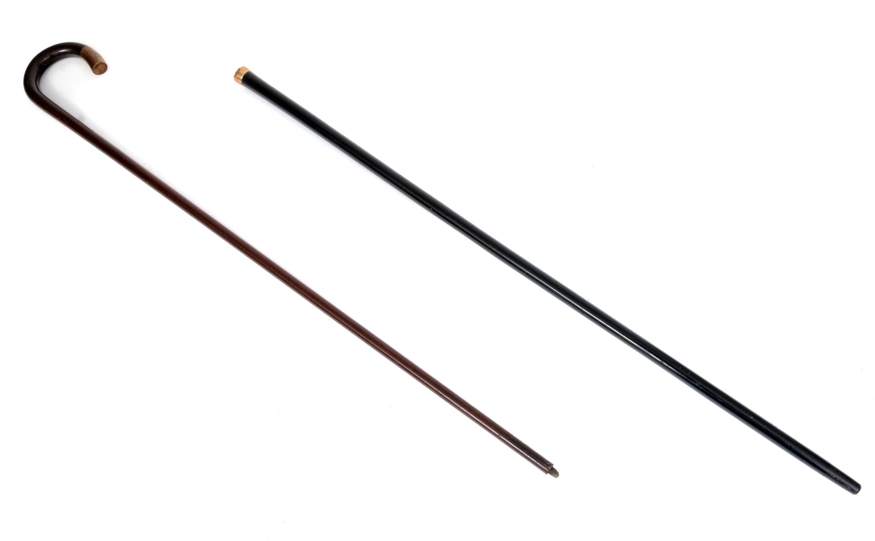 Two walking canes one black straight cane and a brown curved cane. Both of the canes are 14K yellow gold tipped.