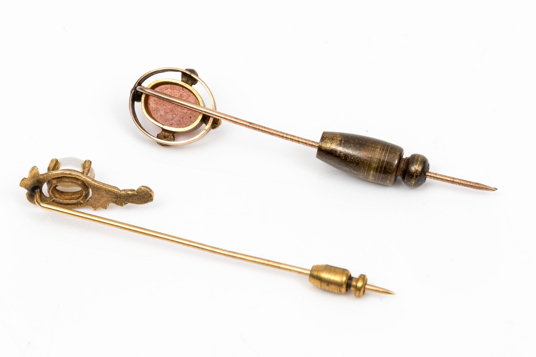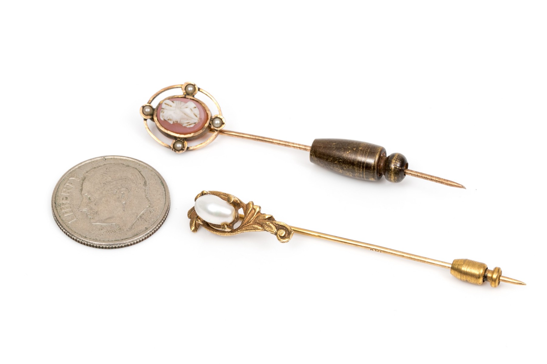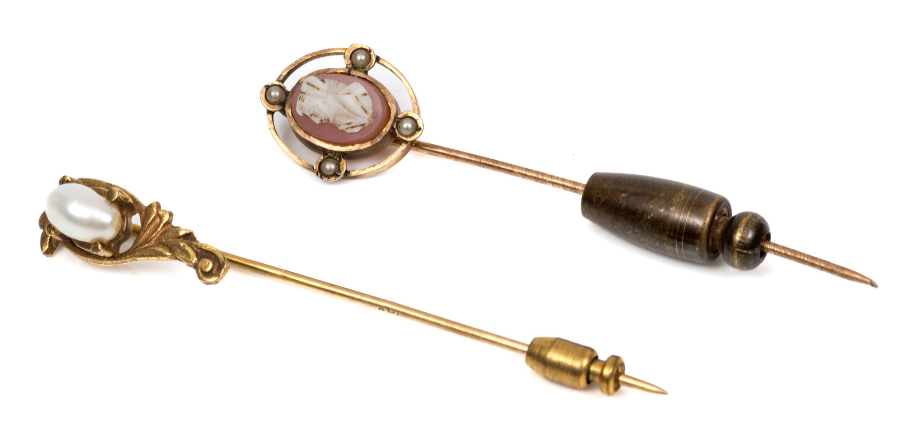 Two 14K yellow gold vintage stick pins. One is set with a cameo and the second is set with a cultured baroque pearl.