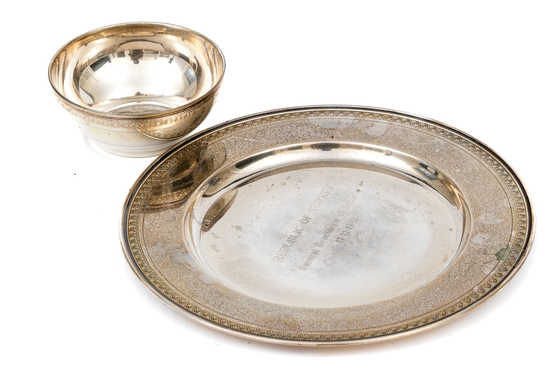 Comprised of a presentational plate, etched REPUBLIC OF TURKEY, 1990. With decorative etched motif to rim, together with a small bowl.