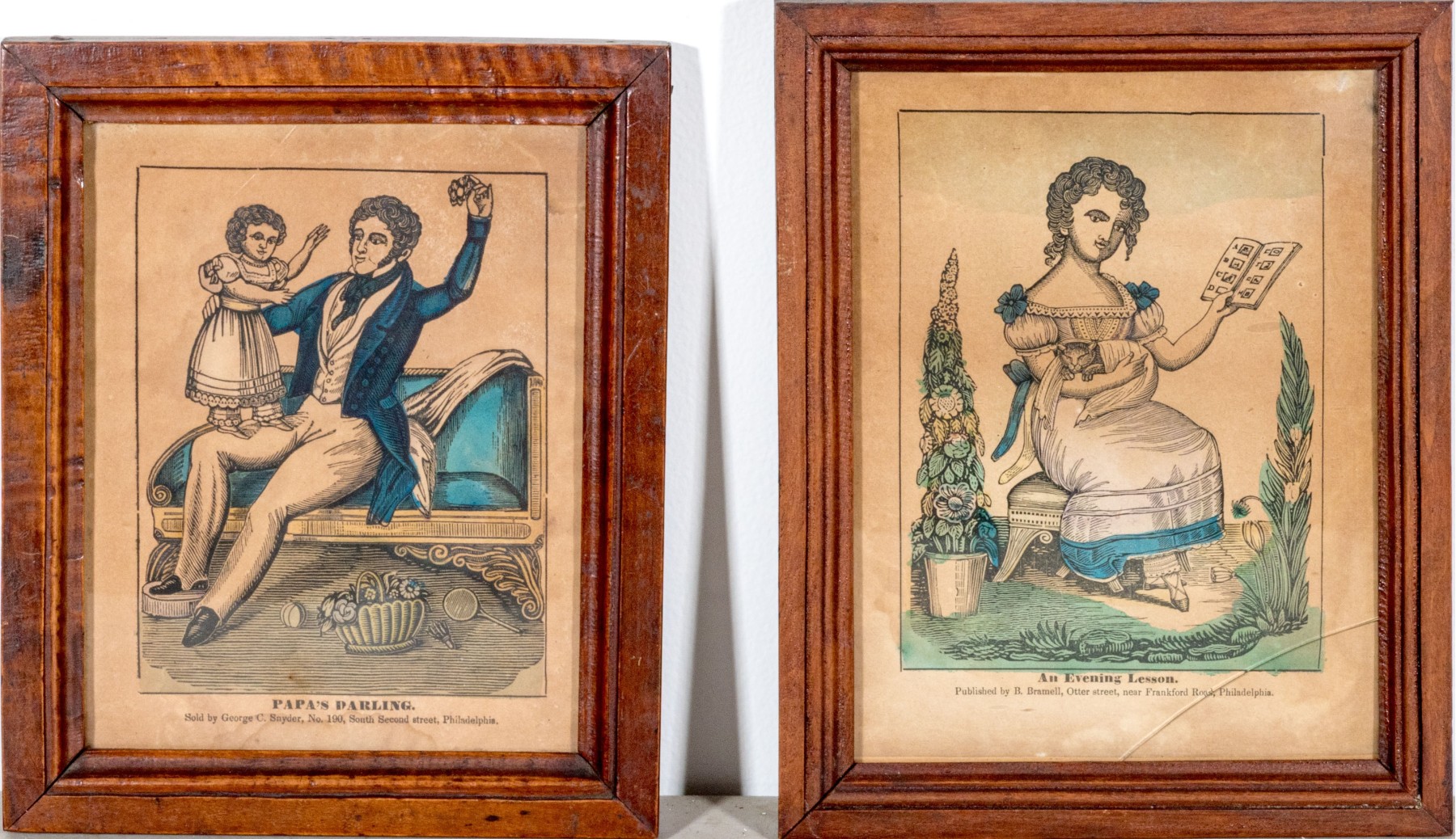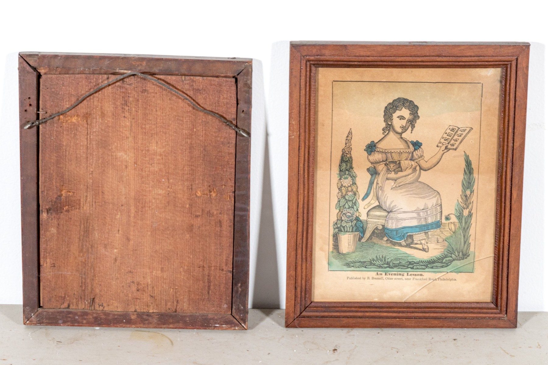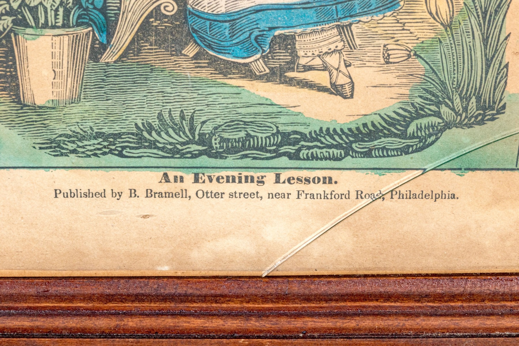A delightful duo of 19th century American hand-colored prints including "Papa's Darling" and "An Evening Lesson" depicting figures seated in Regency style attire. Both displayed glazed in wood frames.