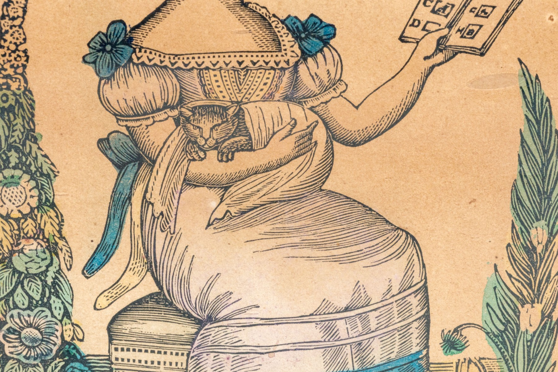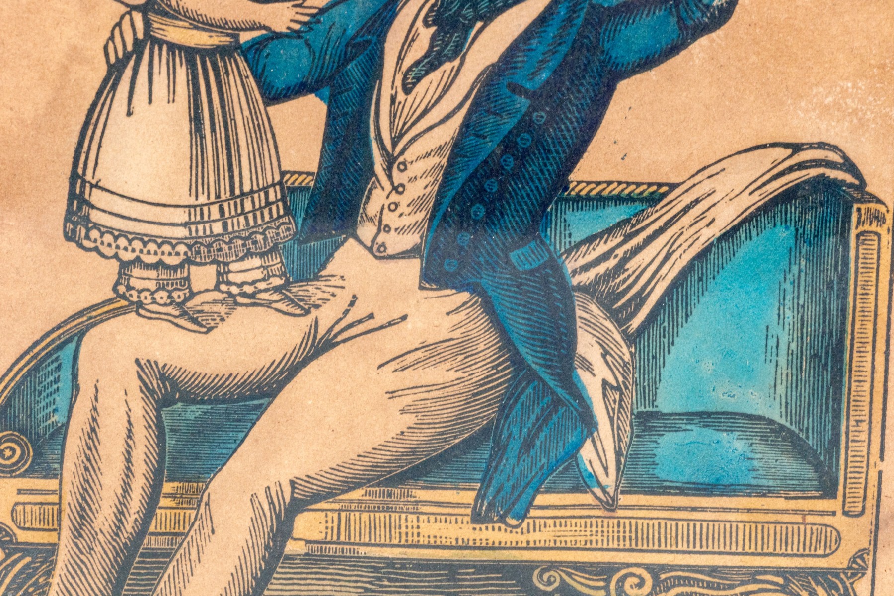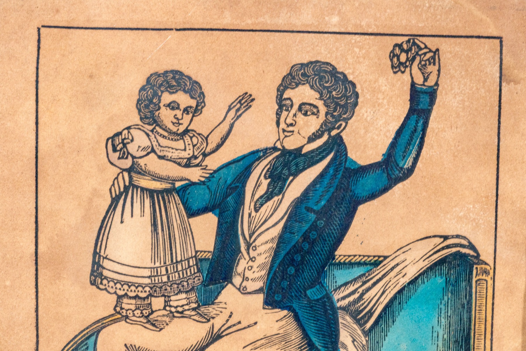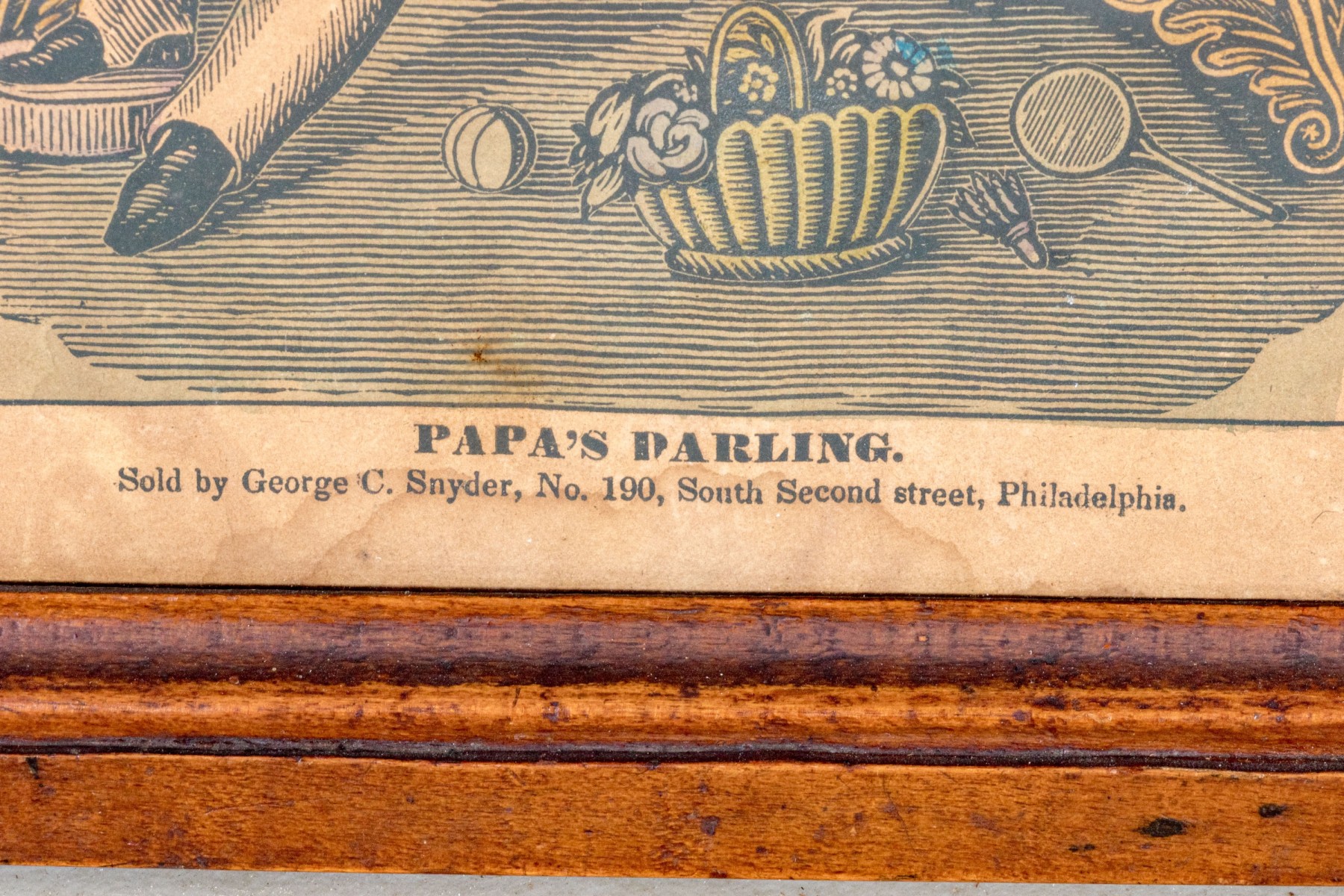 A delightful duo of 19th century American hand-colored prints including "Papa's Darling" and "An Evening Lesson" depicting figures seated in Regency style attire. Both displayed glazed in wood frames.
