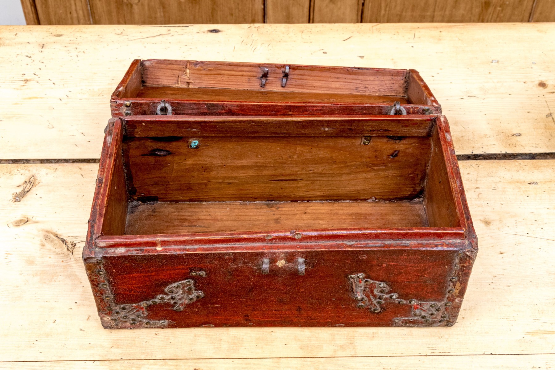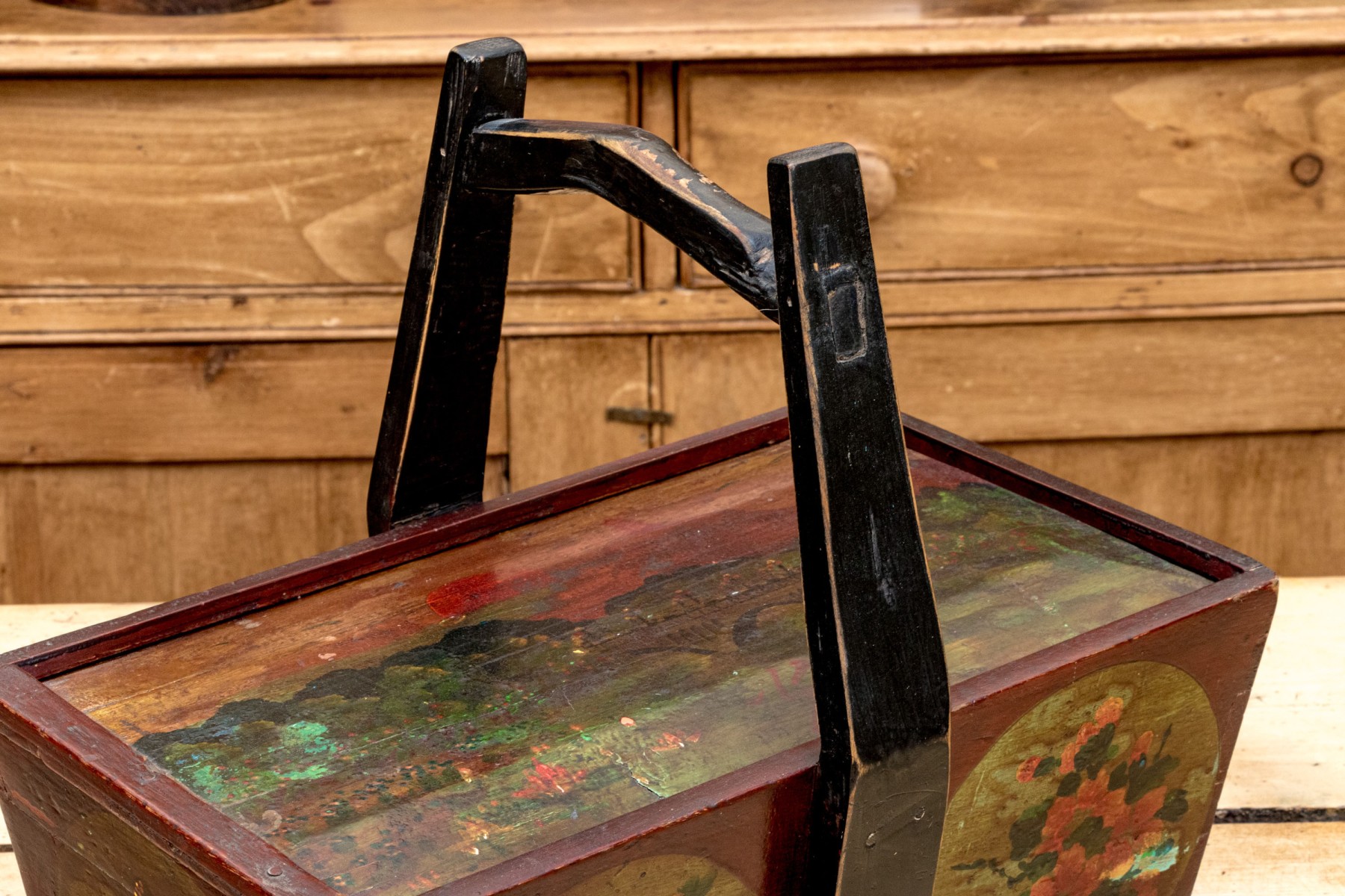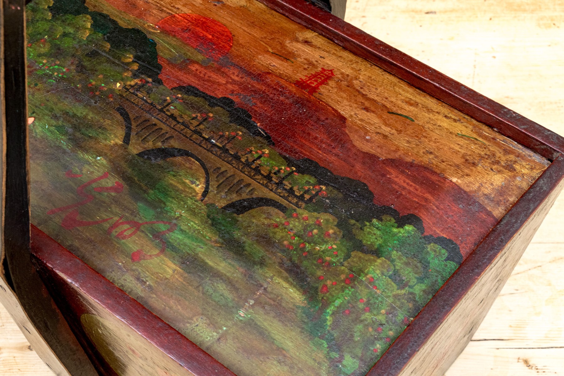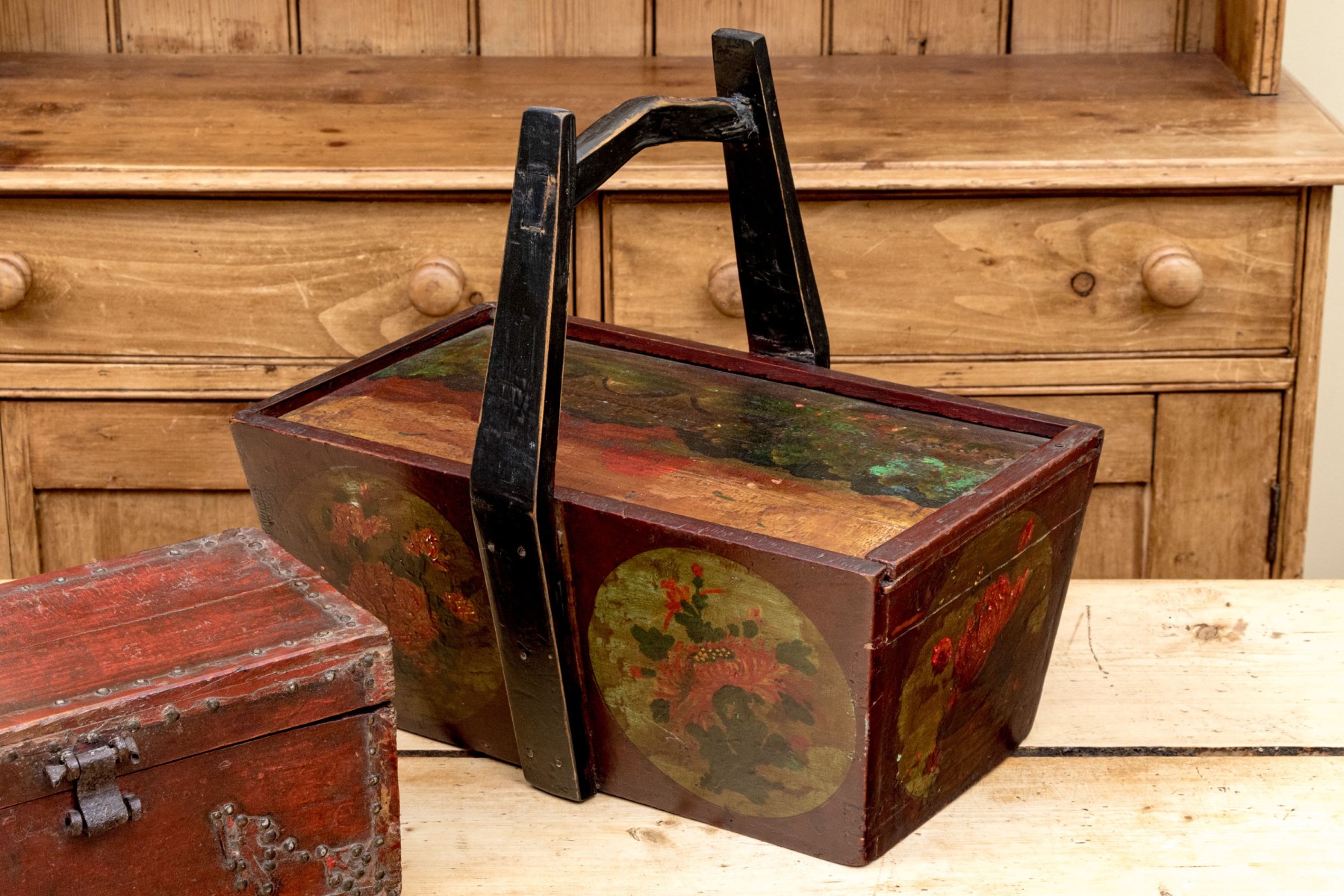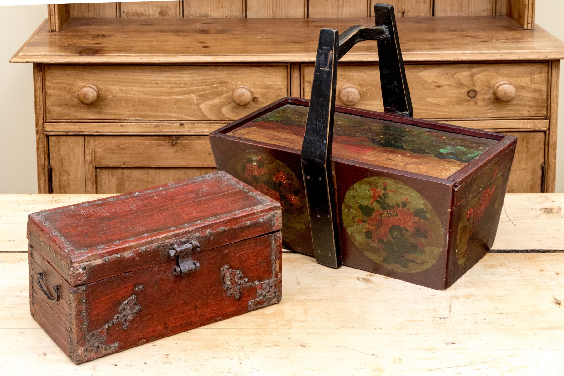 A delightful duo of antique Asian vessels. Comprised of hand painted, carved rice bucket with sliding painted top and carved handle. Together with a rectangular storage box with hinged lid.