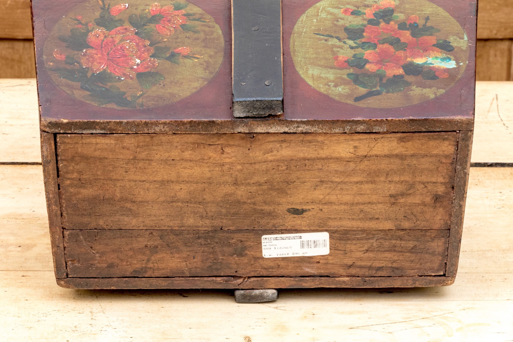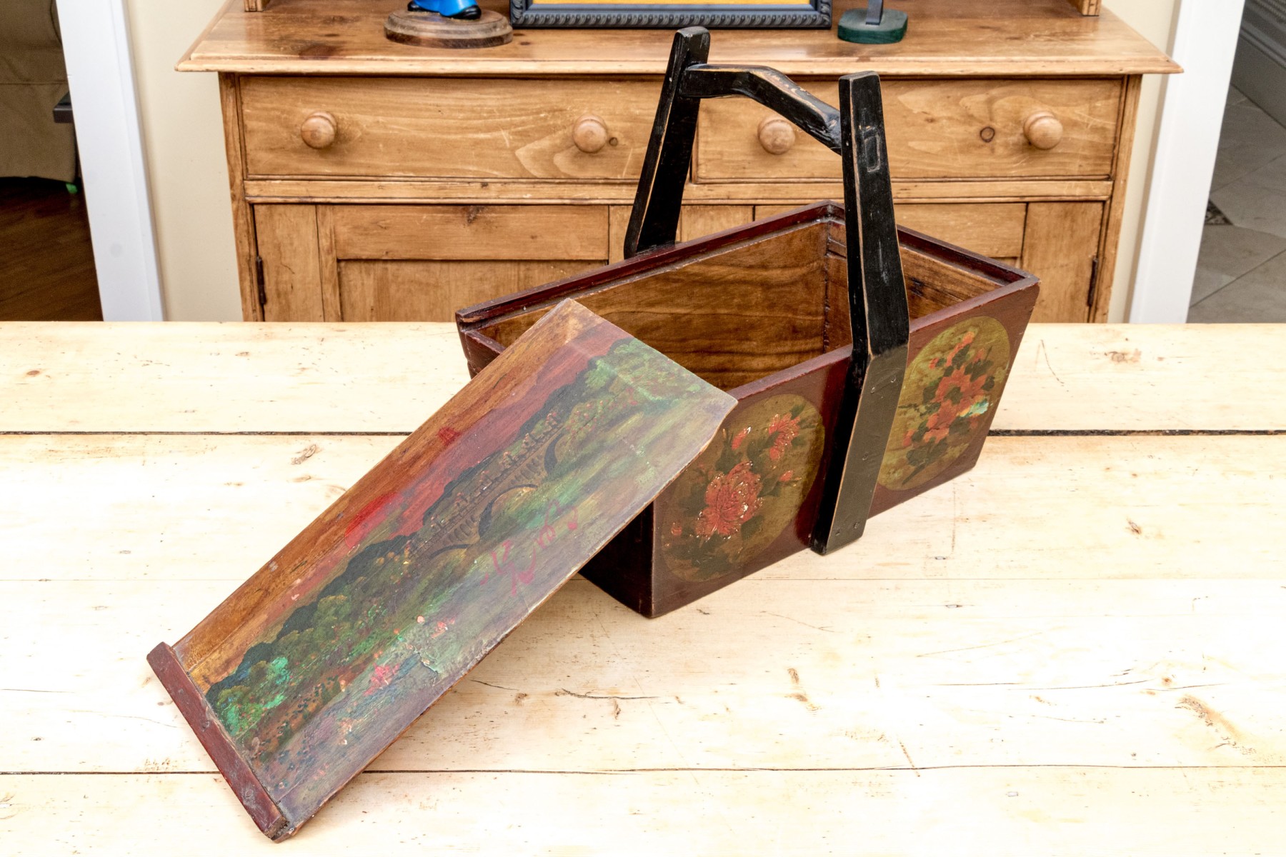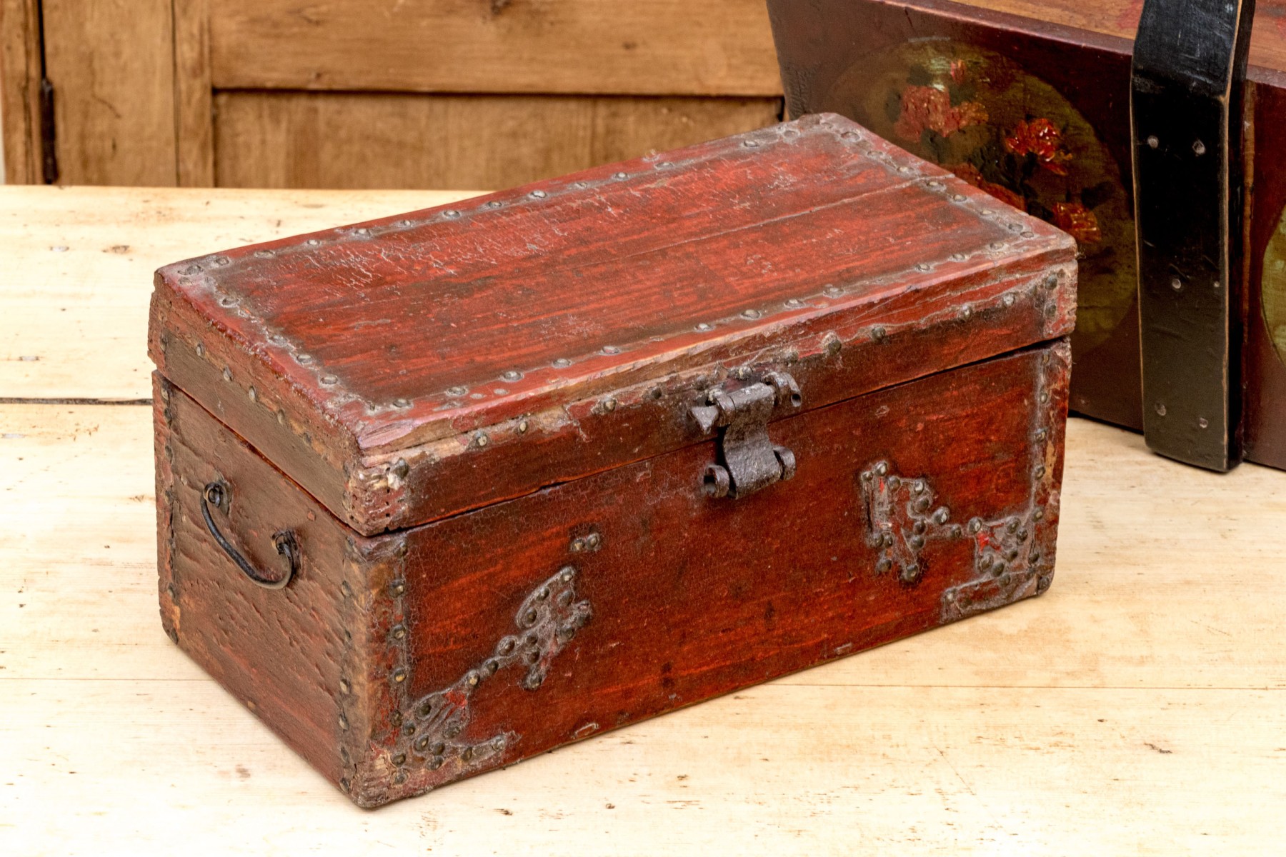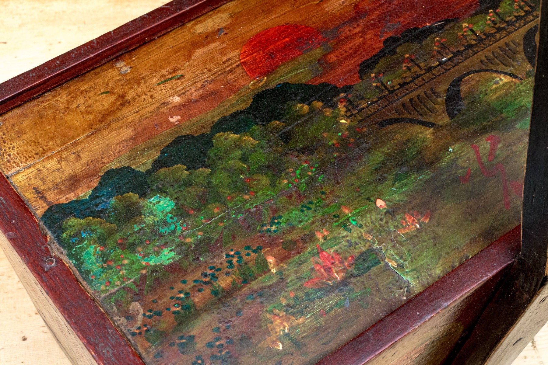 A delightful duo of antique Asian vessels. Comprised of hand painted, carved rice bucket with sliding painted top and carved handle. Together with a rectangular storage box with hinged lid.