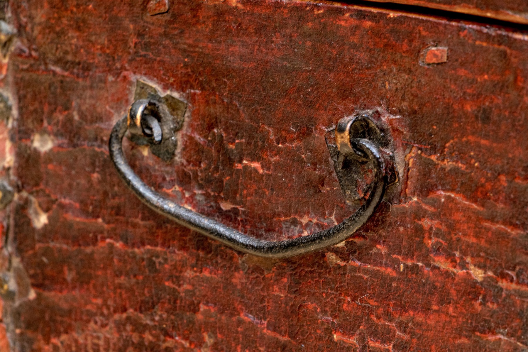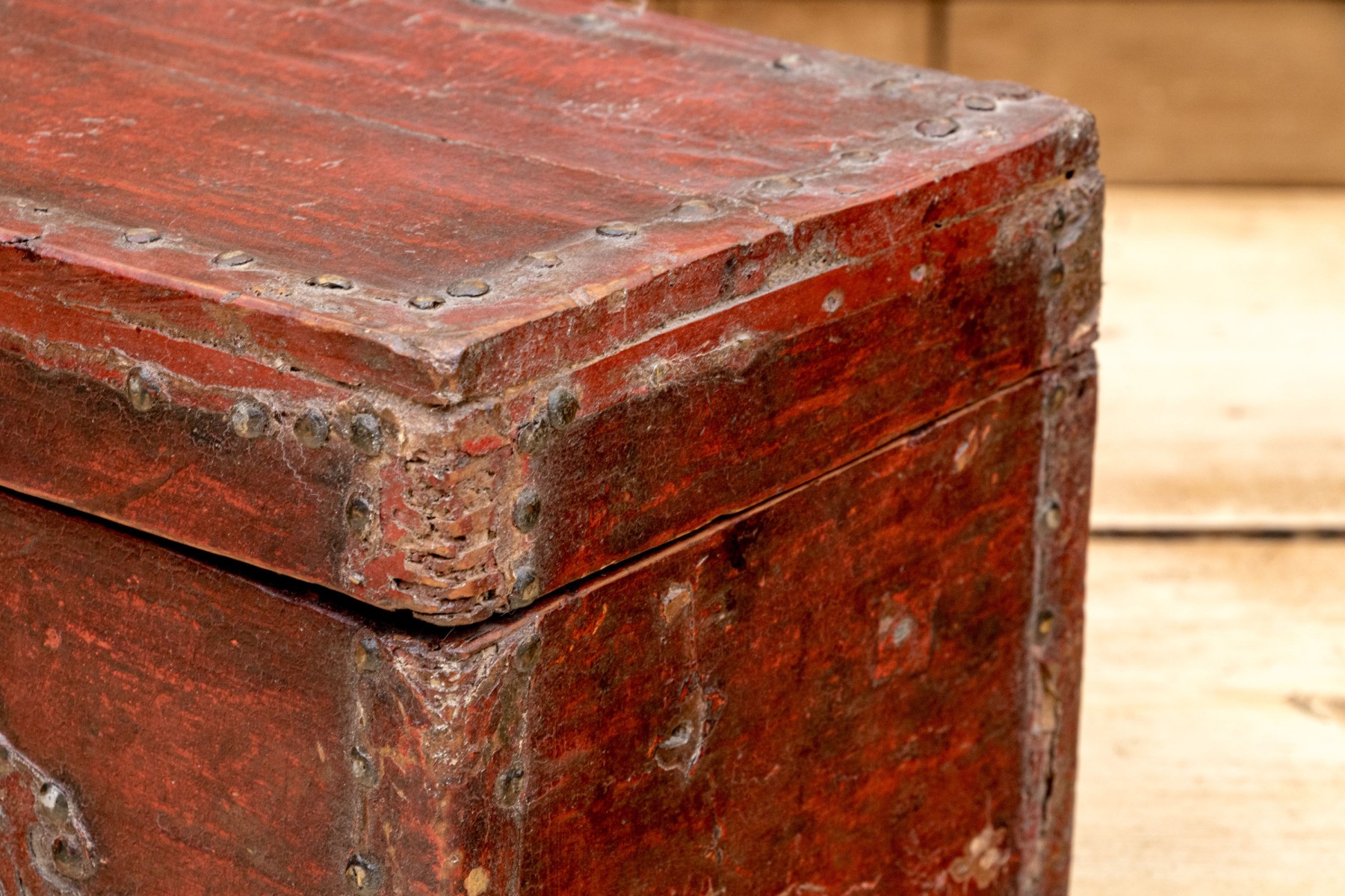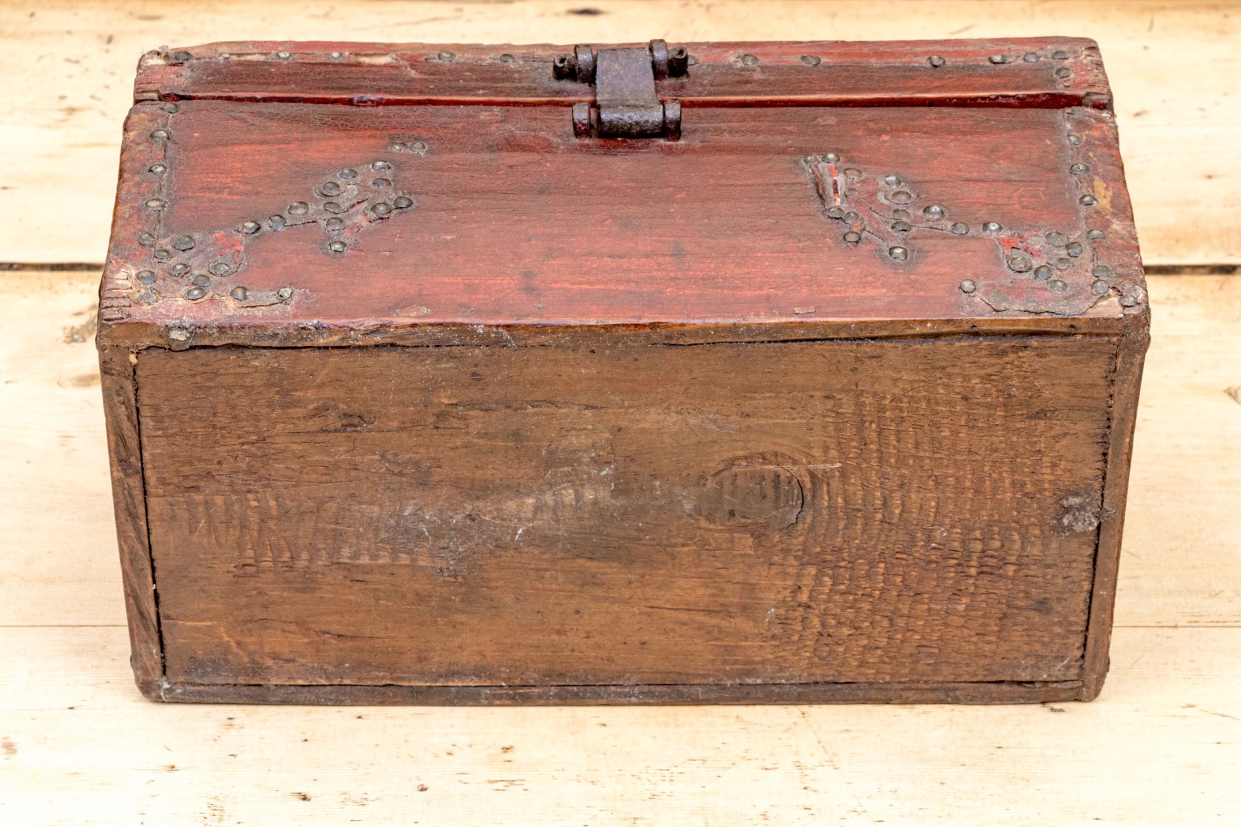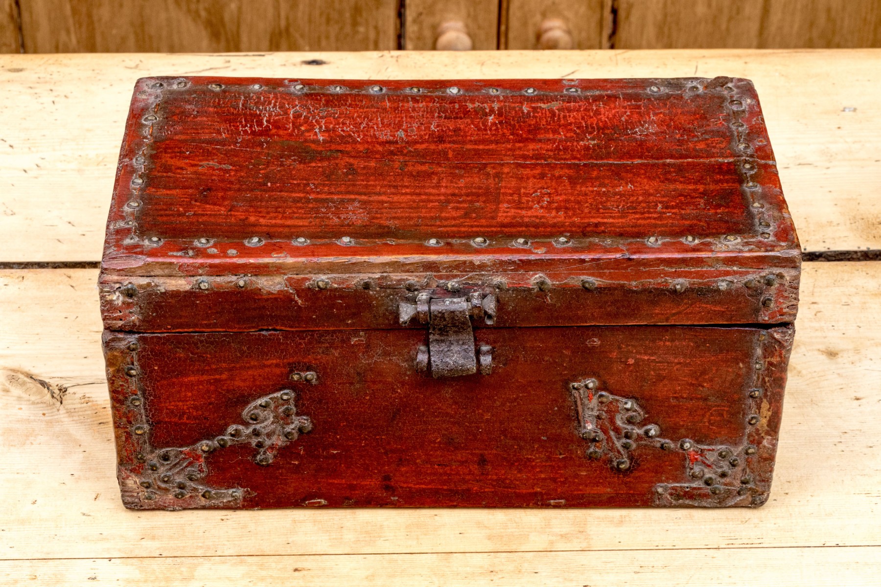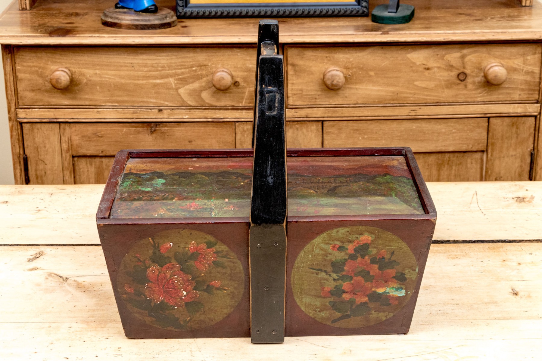 A delightful duo of antique Asian vessels. Comprised of hand painted, carved rice bucket with sliding painted top and carved handle. Together with a rectangular storage box with hinged lid.