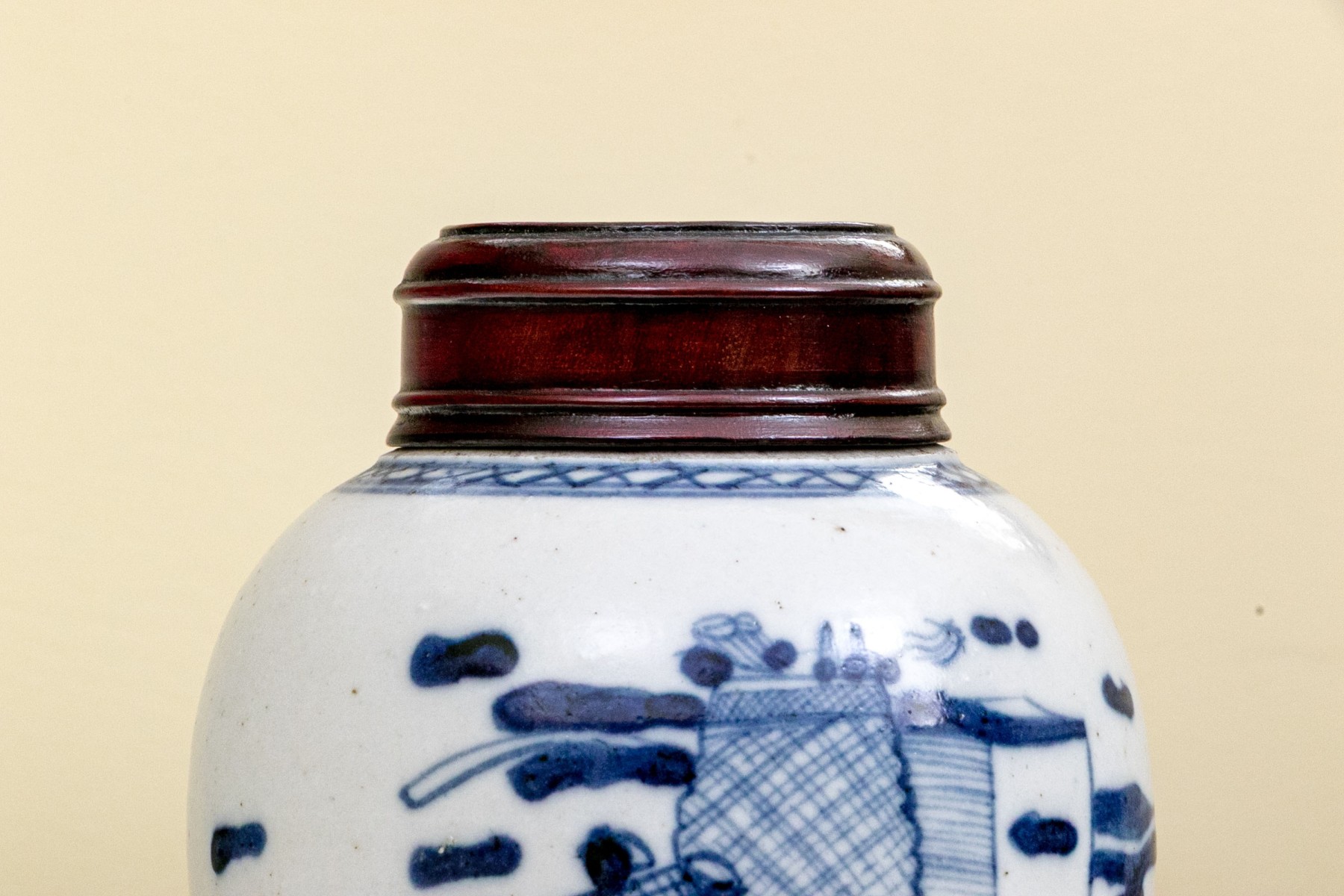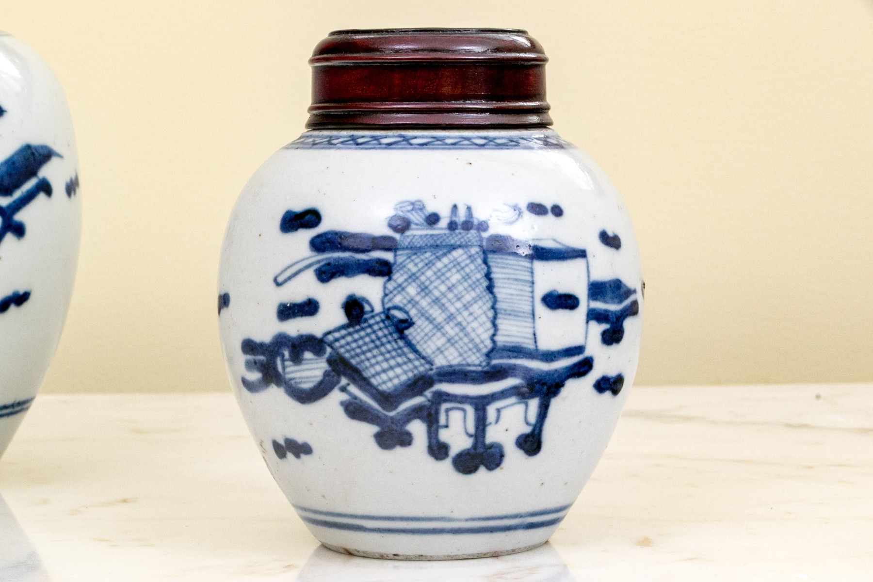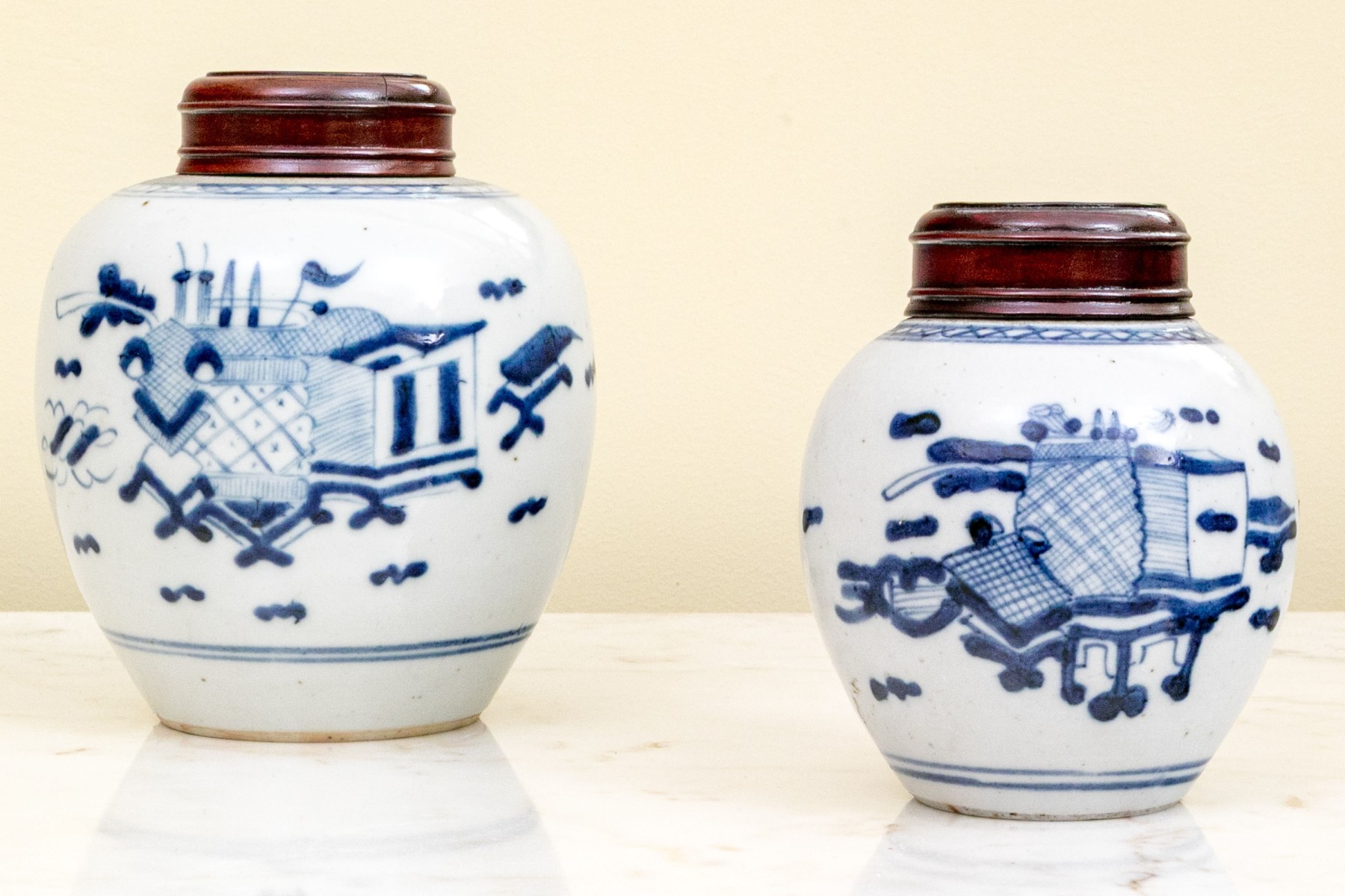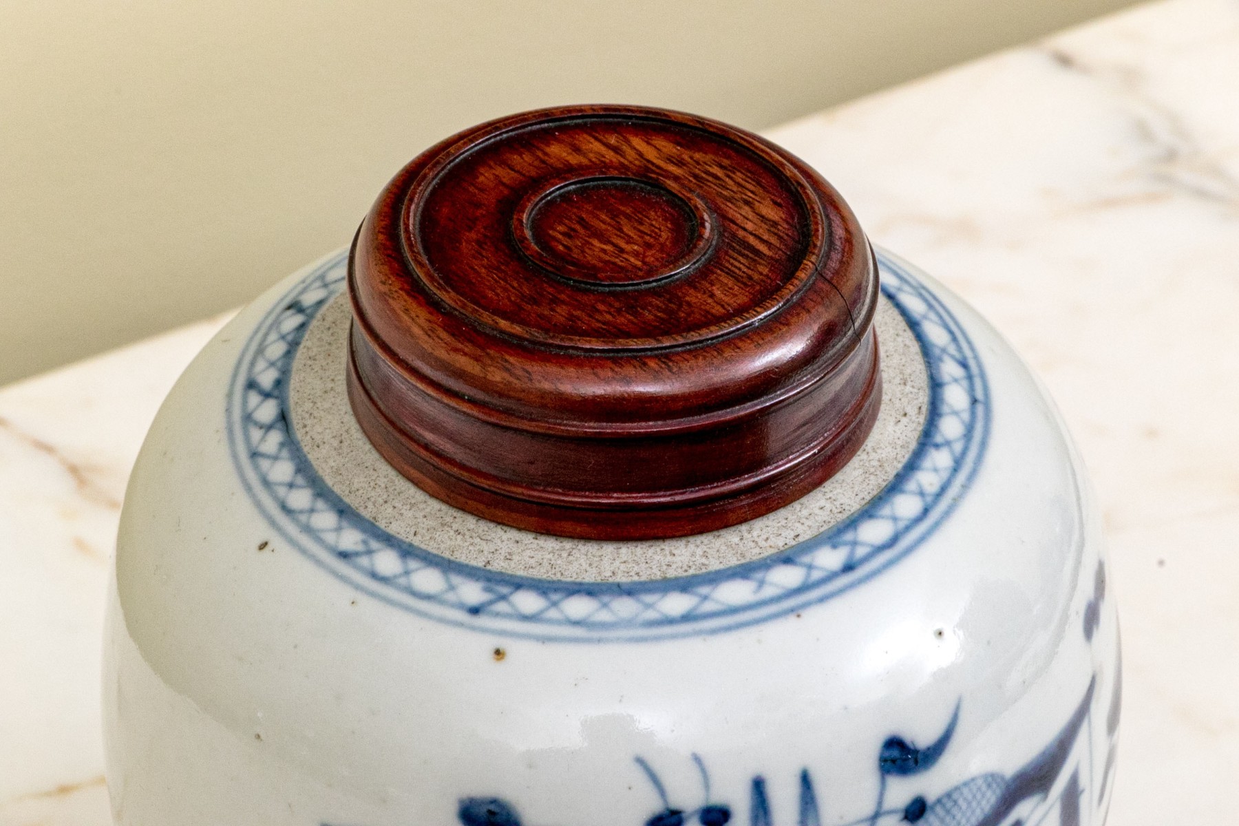 together with two blue and white ginger jars with wooden lids, one of which is larger than the other. Dimensions: 6 3/8 x 5" Dia. Larger with wooden top // 5" H x 4" Dia, smaller with wooden lid