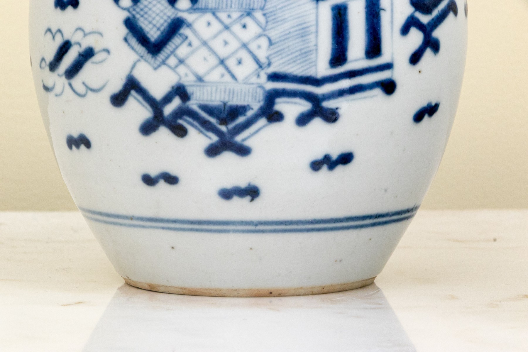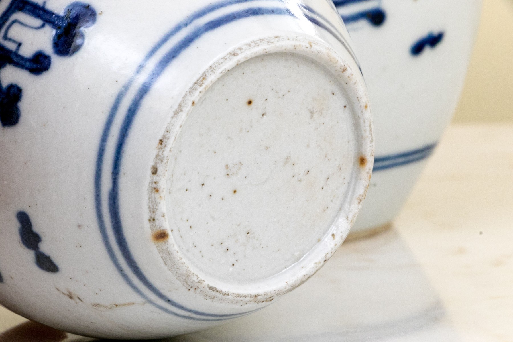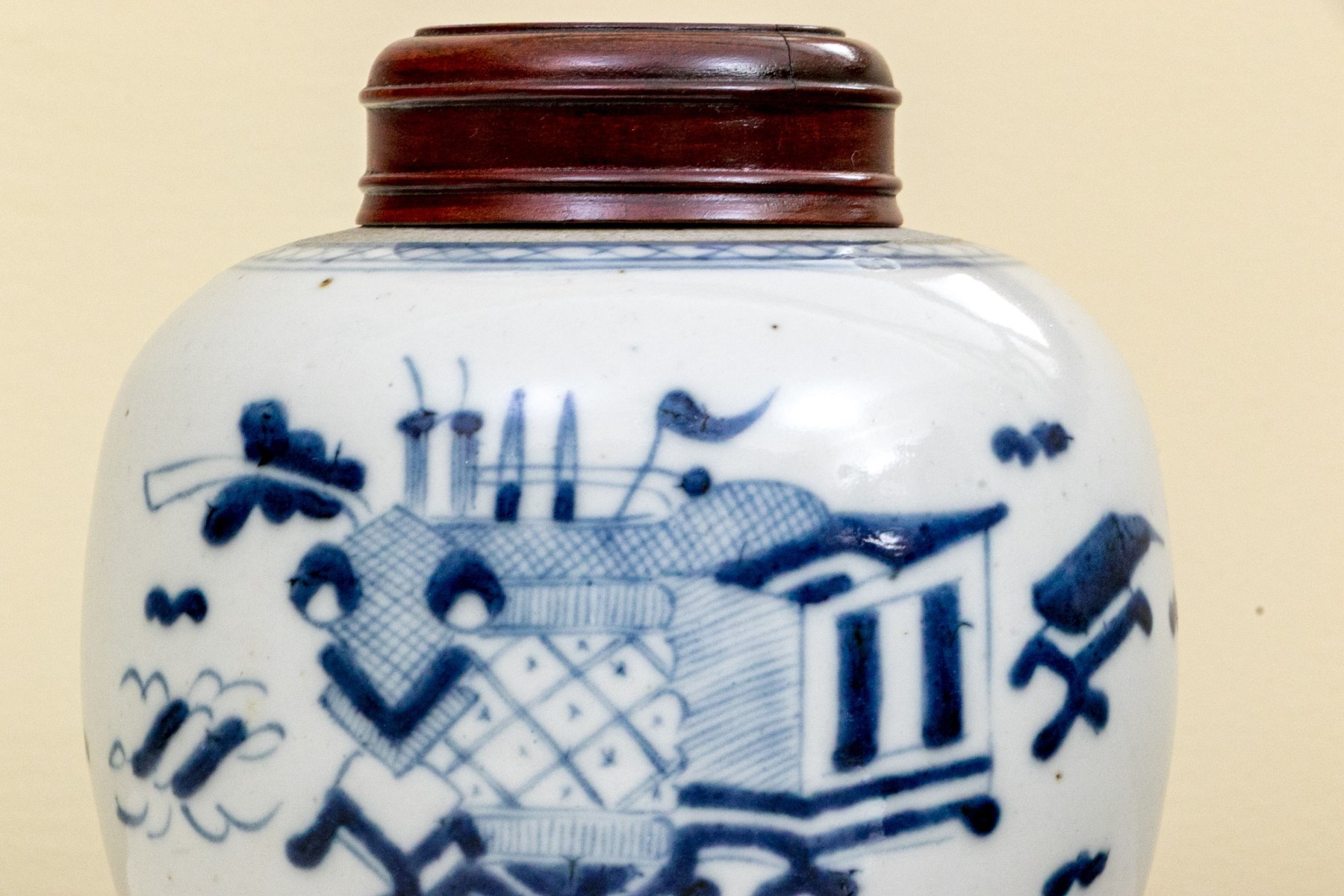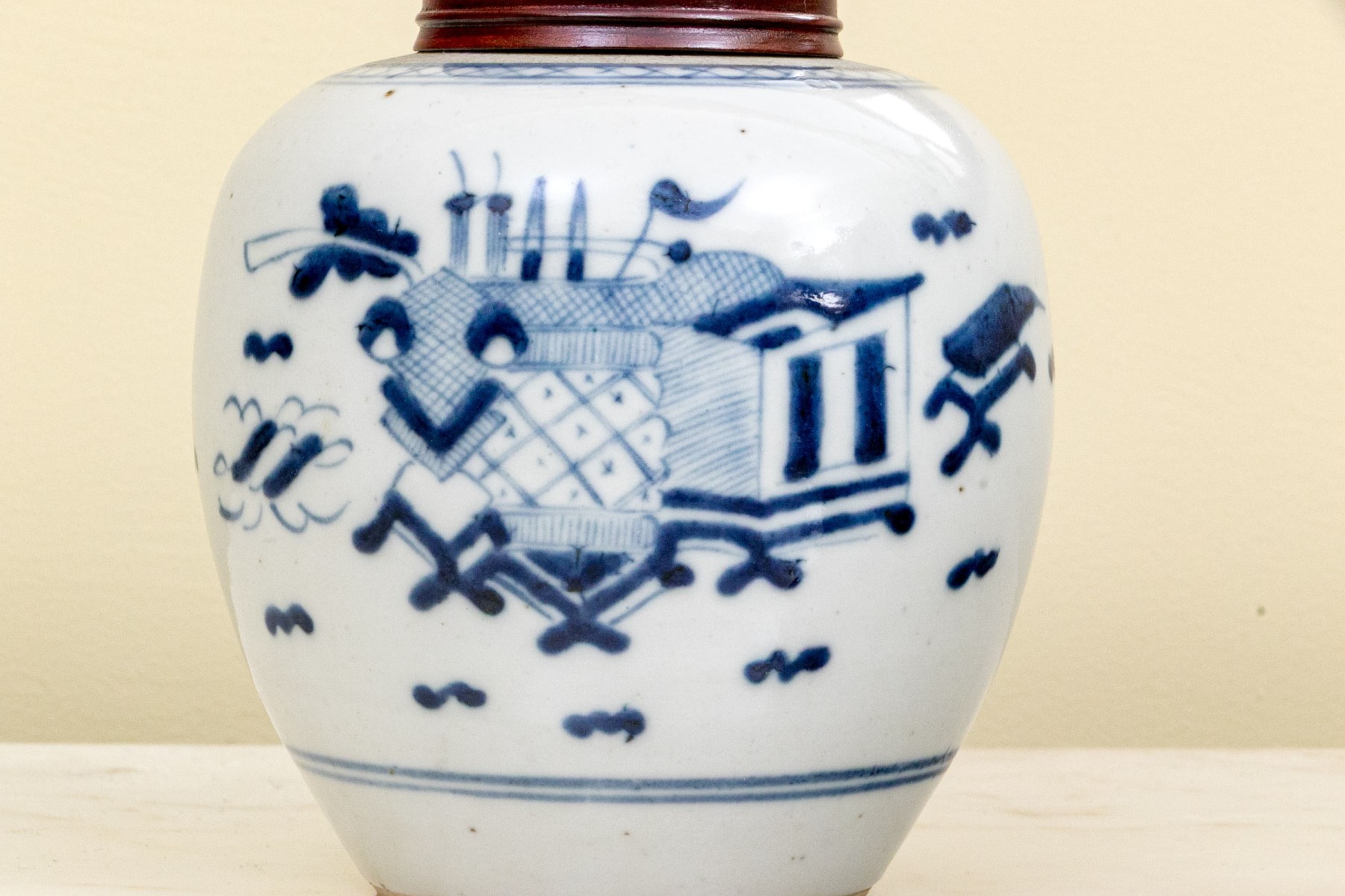 together with two blue and white ginger jars with wooden lids, one of which is larger than the other. Dimensions: 6 3/8 x 5" Dia. Larger with wooden top // 5" H x 4" Dia, smaller with wooden lid