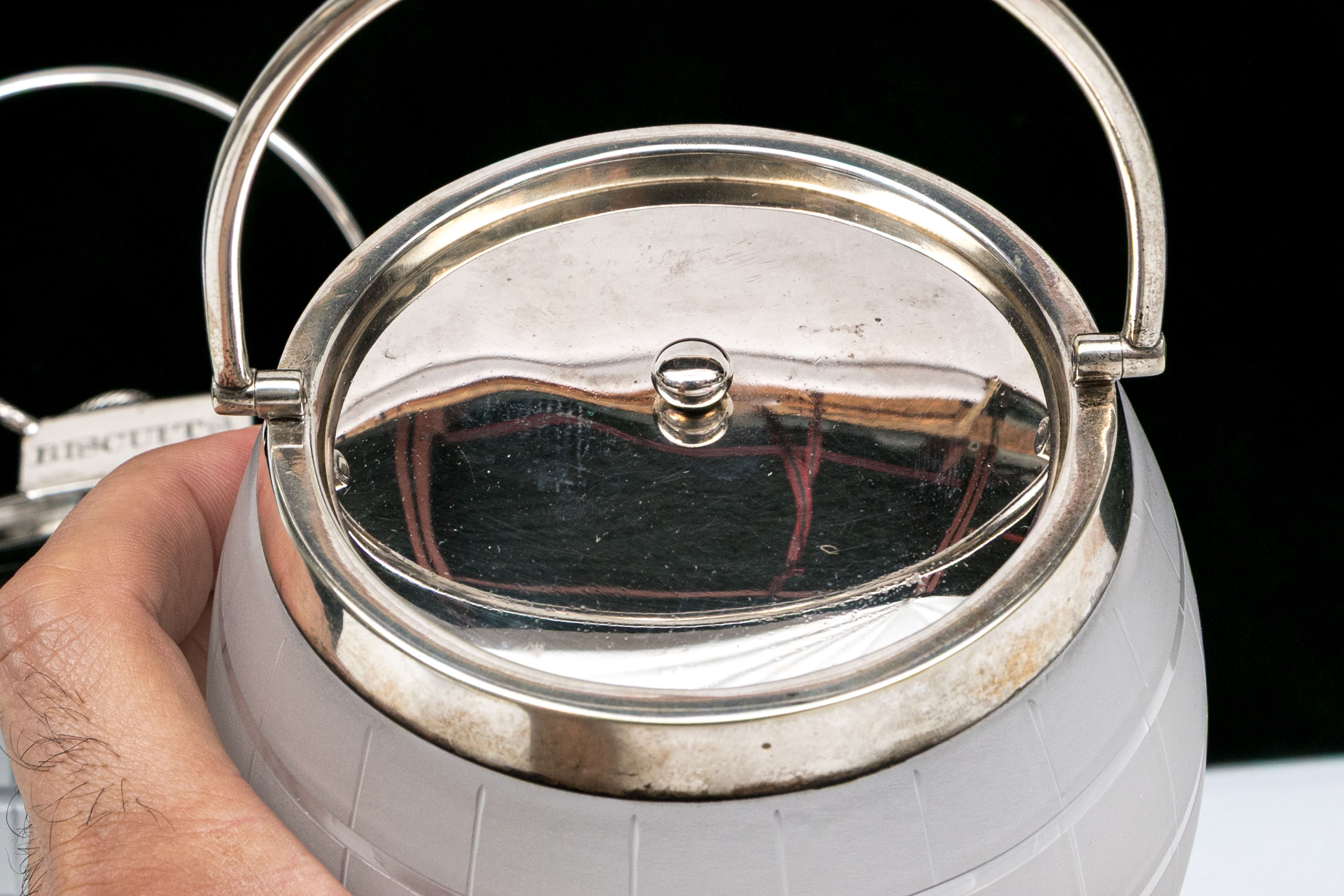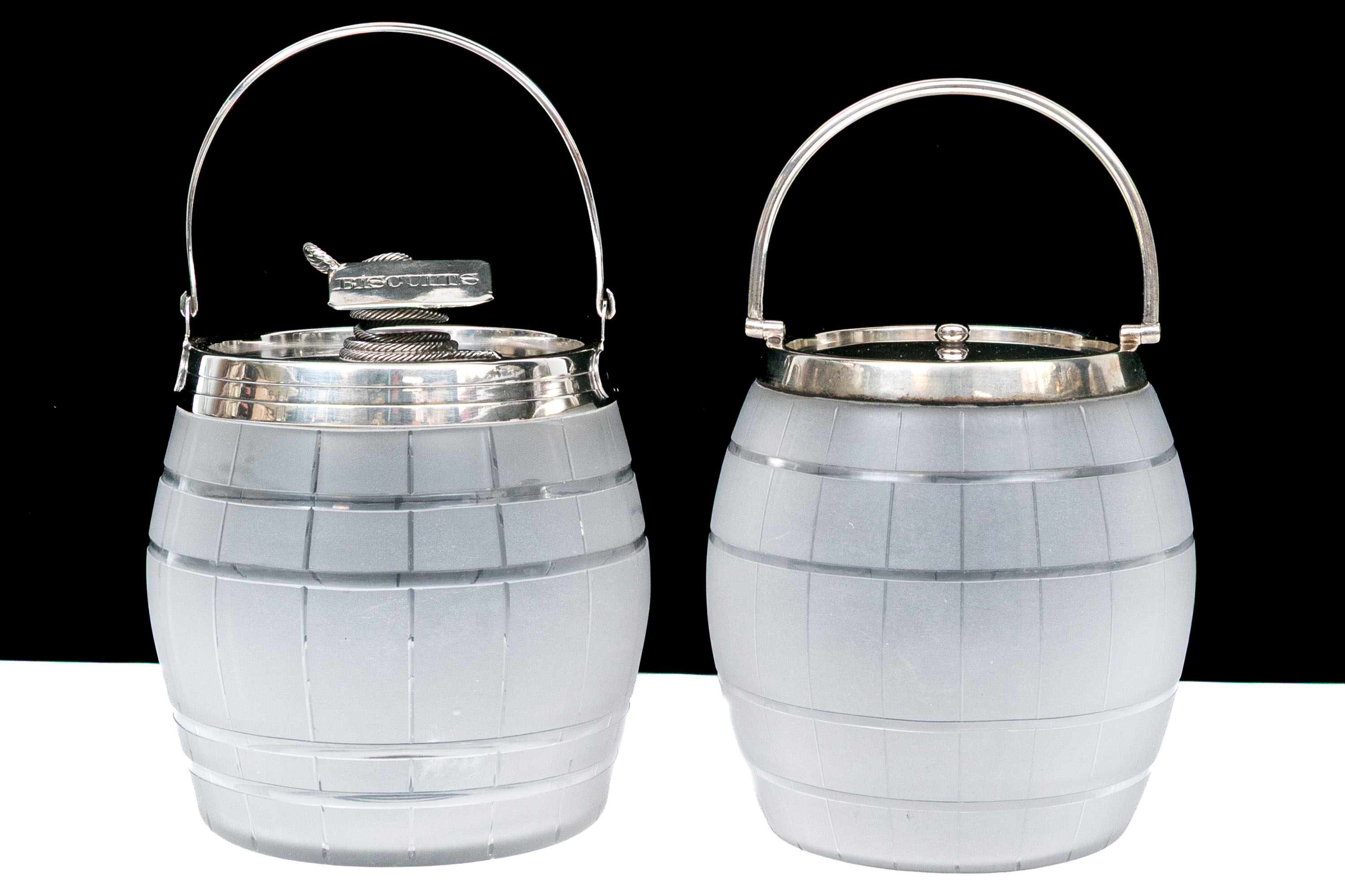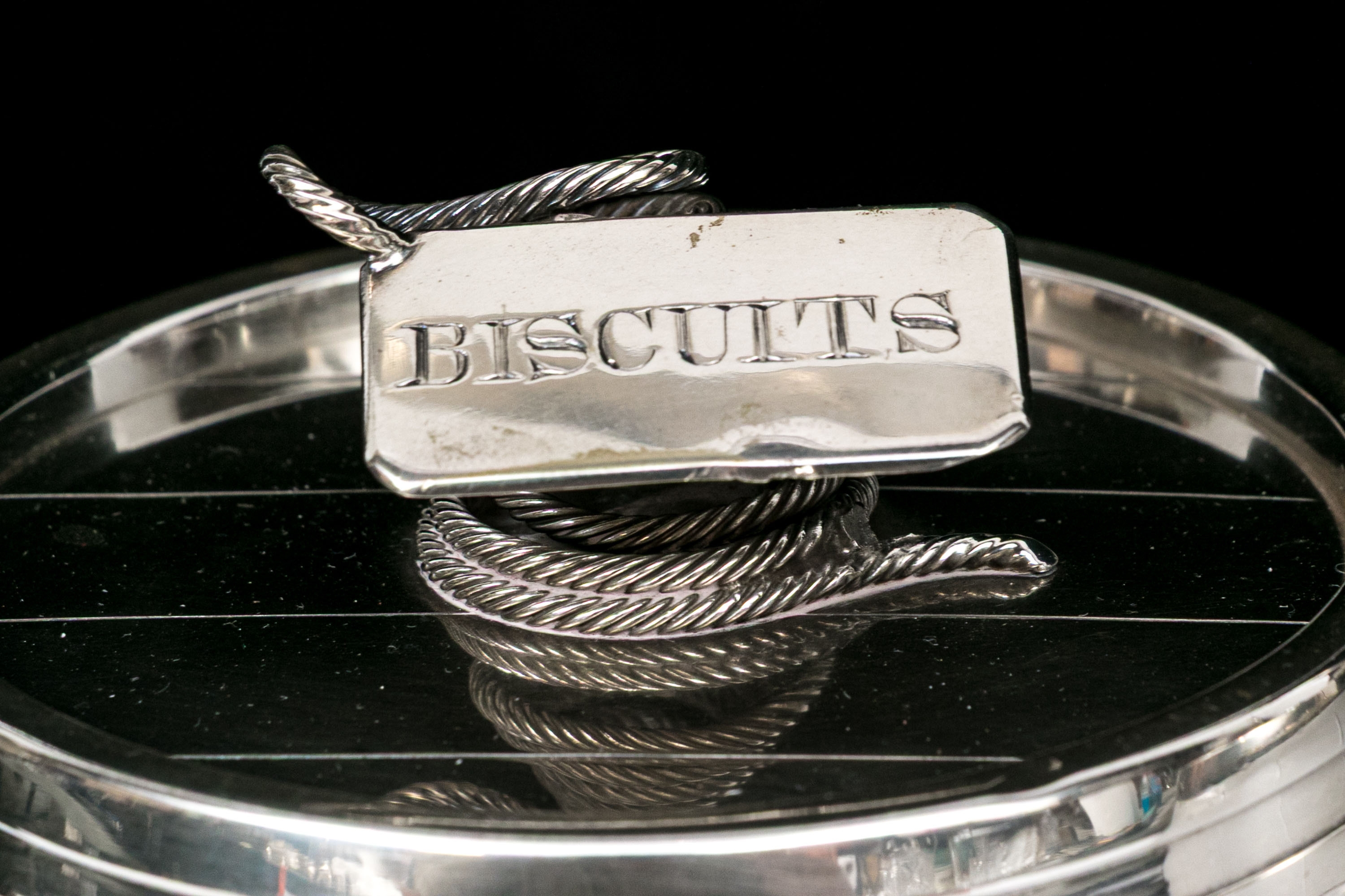 Both jars in the same it lattice pattern and fine silverplate mounts, swivel handles and lids. One lid is embellished with a rope like finial with a label Biscuits. All mounts have been restored and replated to a fine finish.