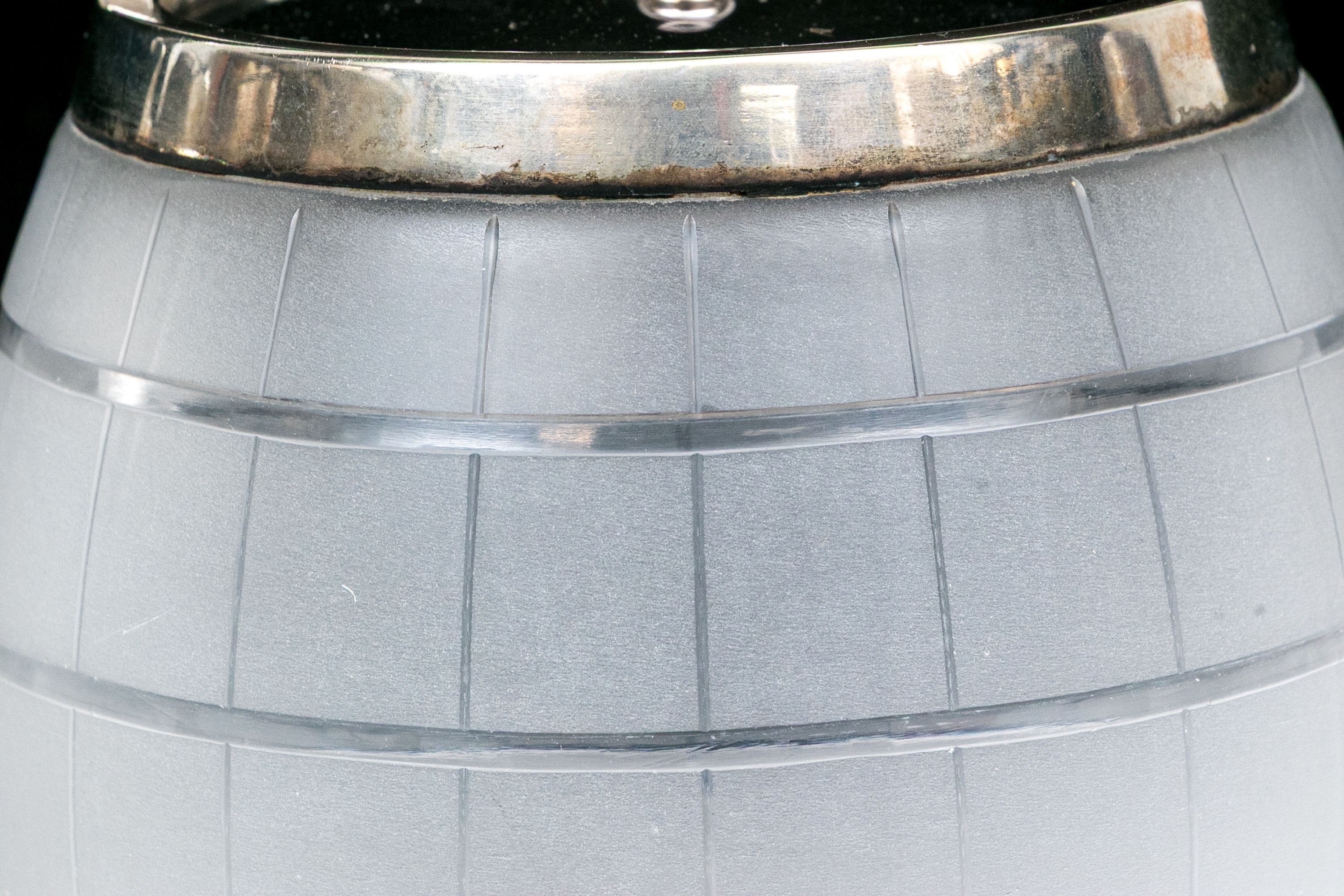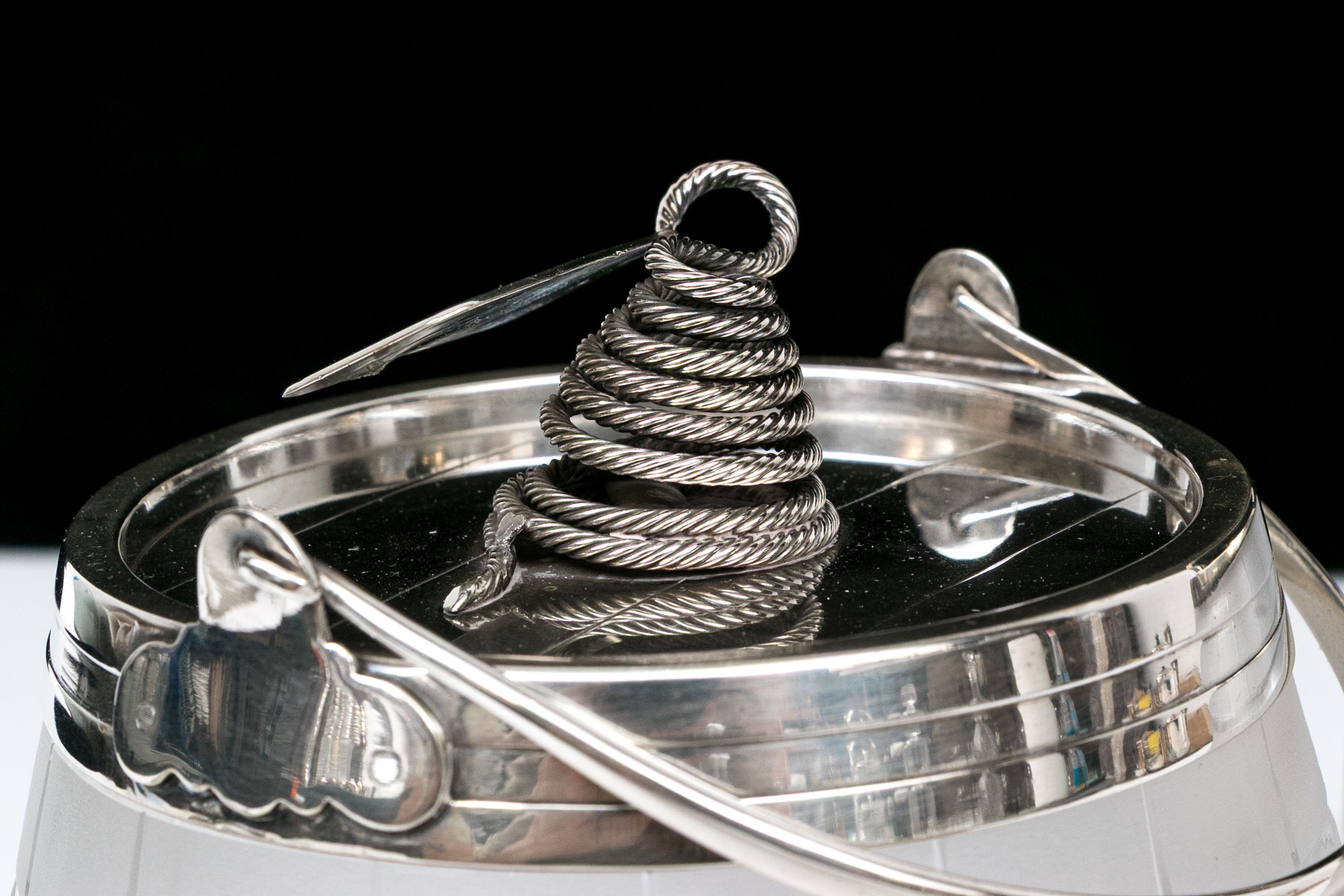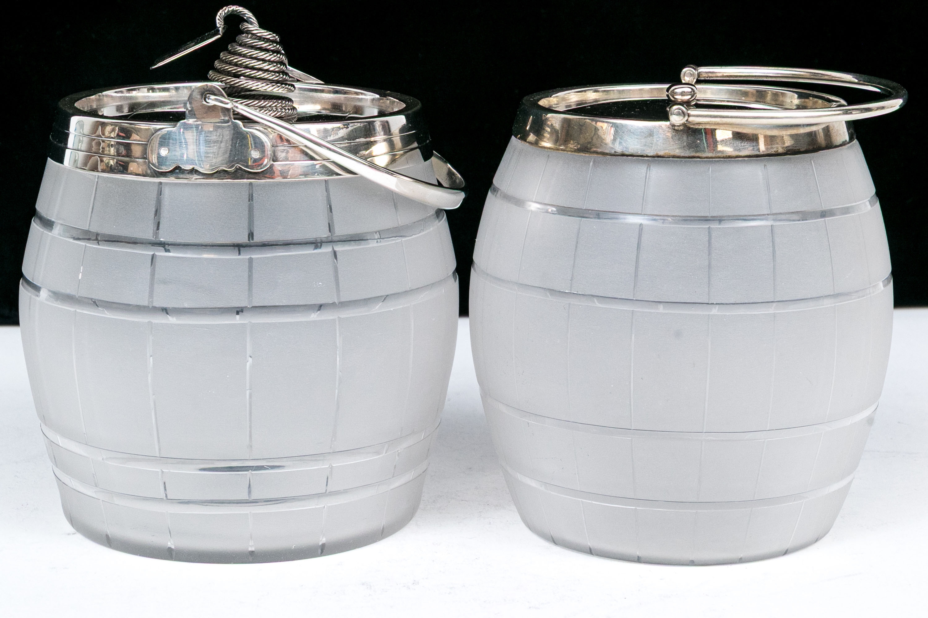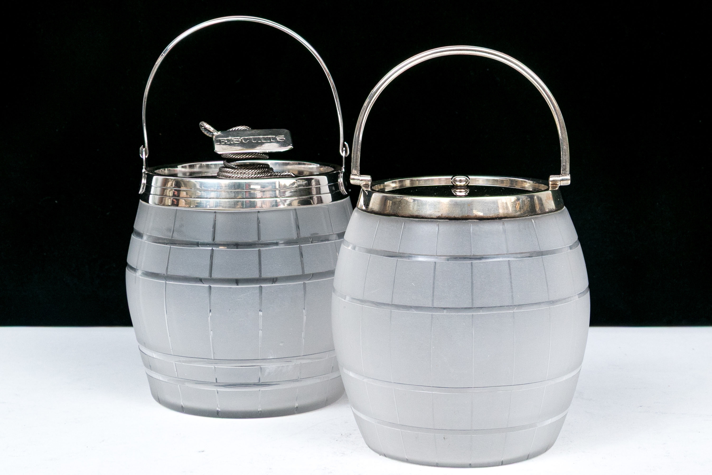 Both jars in the same it lattice pattern and fine silverplate mounts, swivel handles and lids. One lid is embellished with a rope like finial with a label Biscuits. All mounts have been restored and replated to a fine finish.