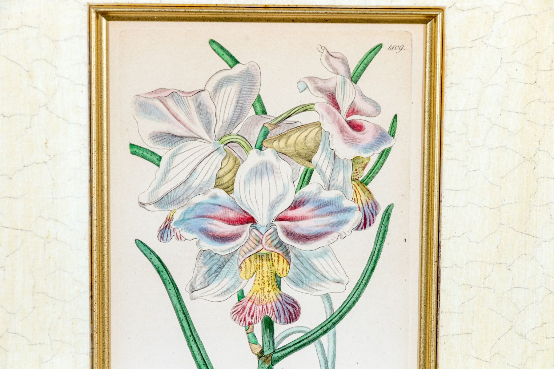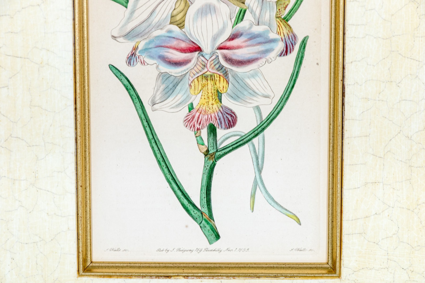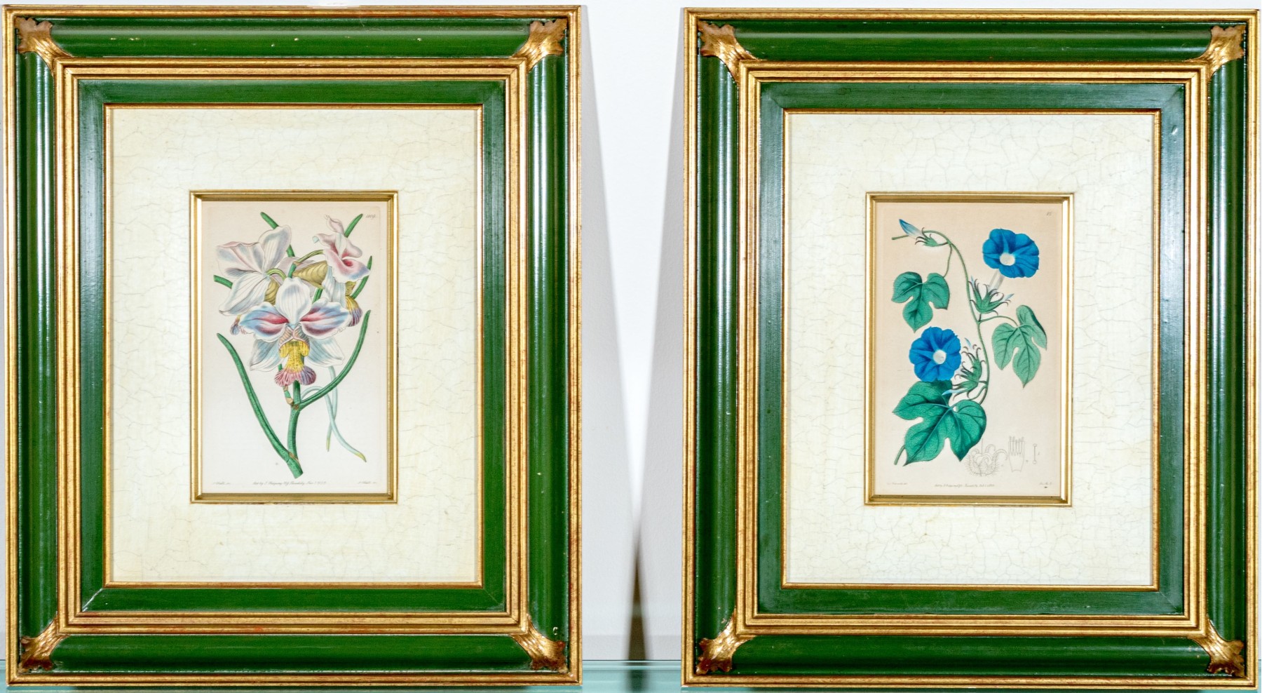 A lovely duo of antique hand-colored engravings as seen in the Botanical Register of Sydenham Edwards (English, 1768-1819). including a depiction of beautiful white, pink, and yellow orchids and a vining morning glory in vibrant blue with large trefoil green leaves.