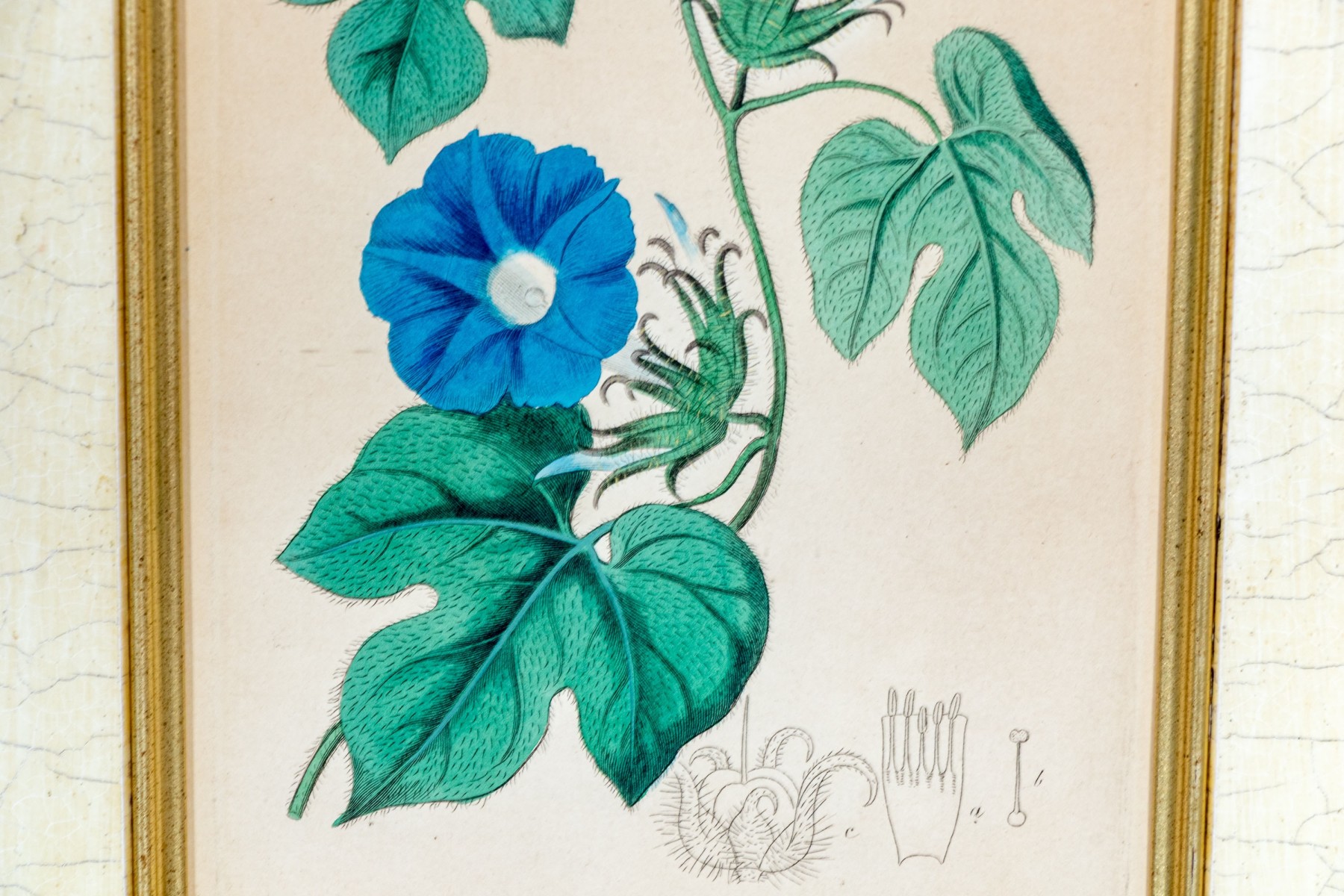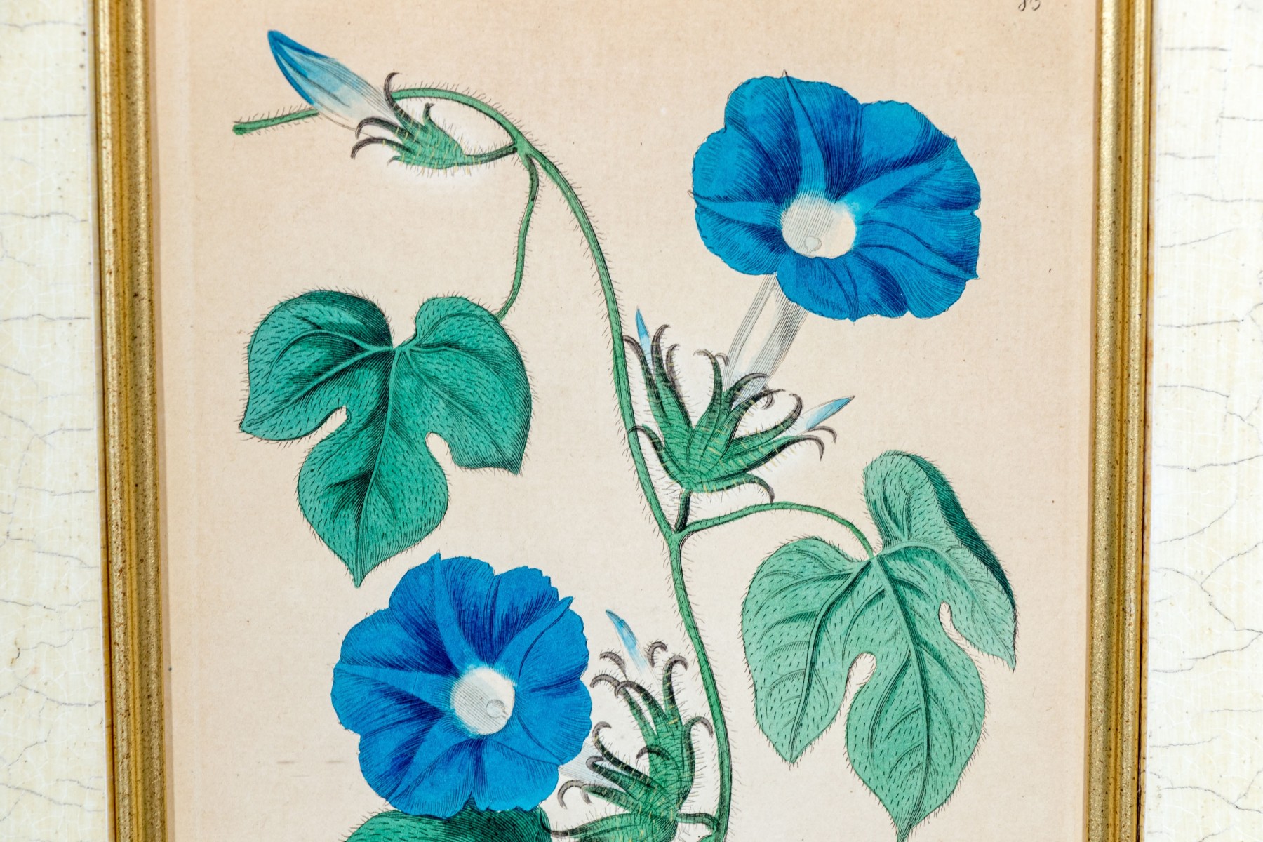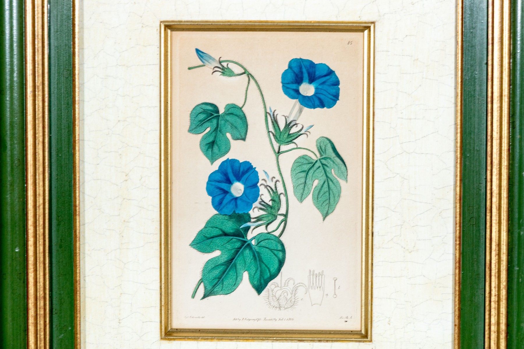 A lovely duo of antique hand-colored engravings as seen in the Botanical Register of Sydenham Edwards (English, 1768-1819). including a depiction of beautiful white, pink, and yellow orchids and a vining morning glory in vibrant blue with large trefoil green leaves.