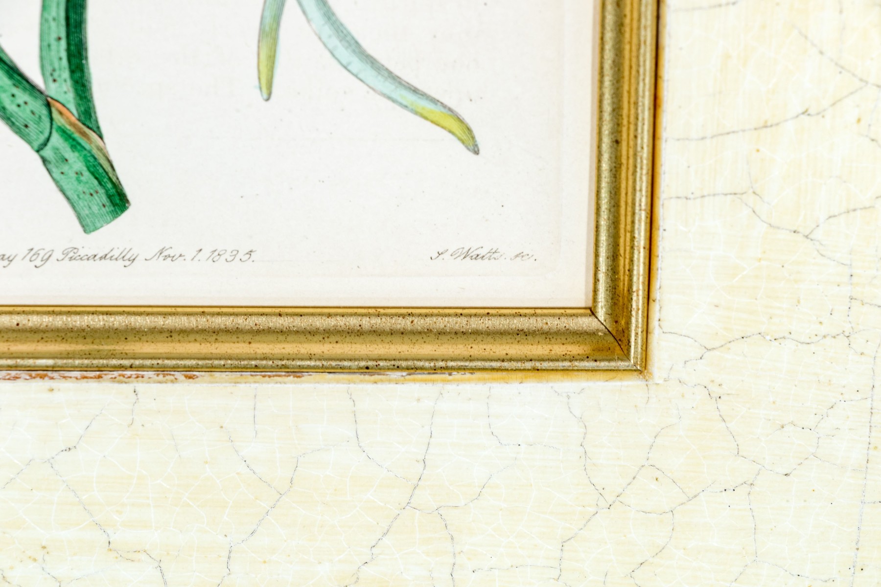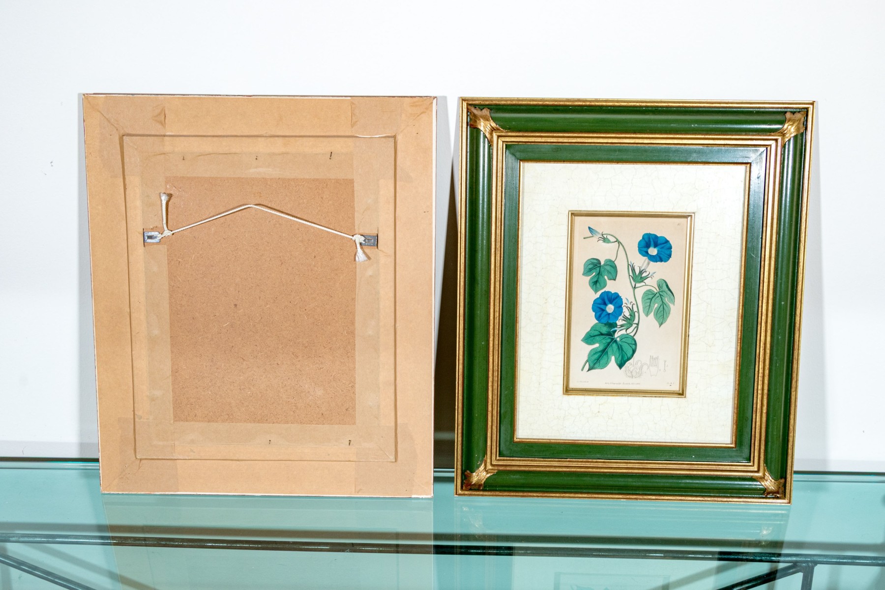 Both displayed with white crackle mats and gilt fillets in verdant green frames with gilt borders and flourished corner details.