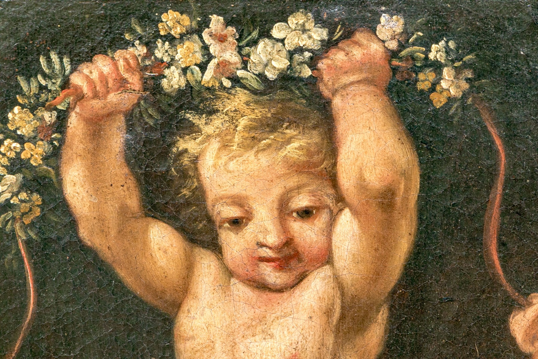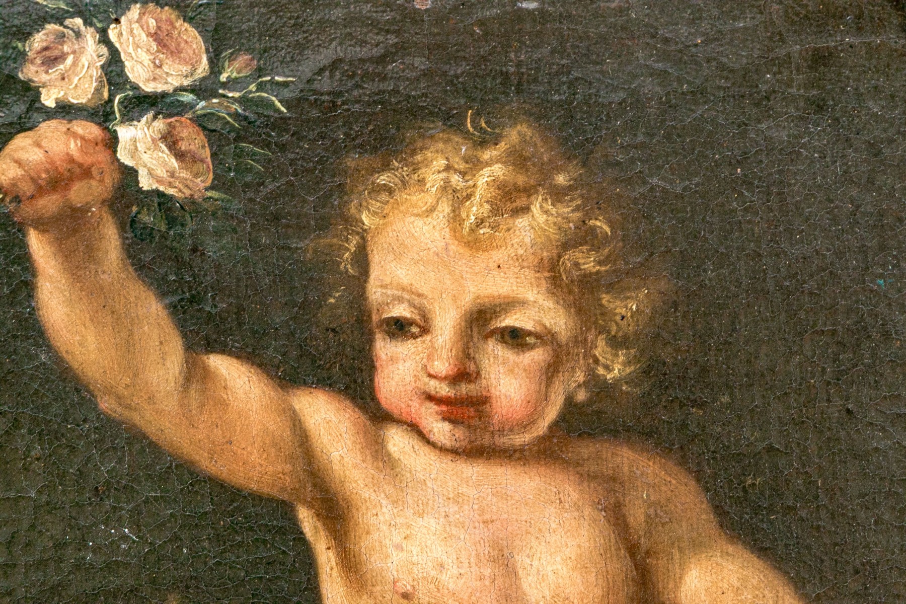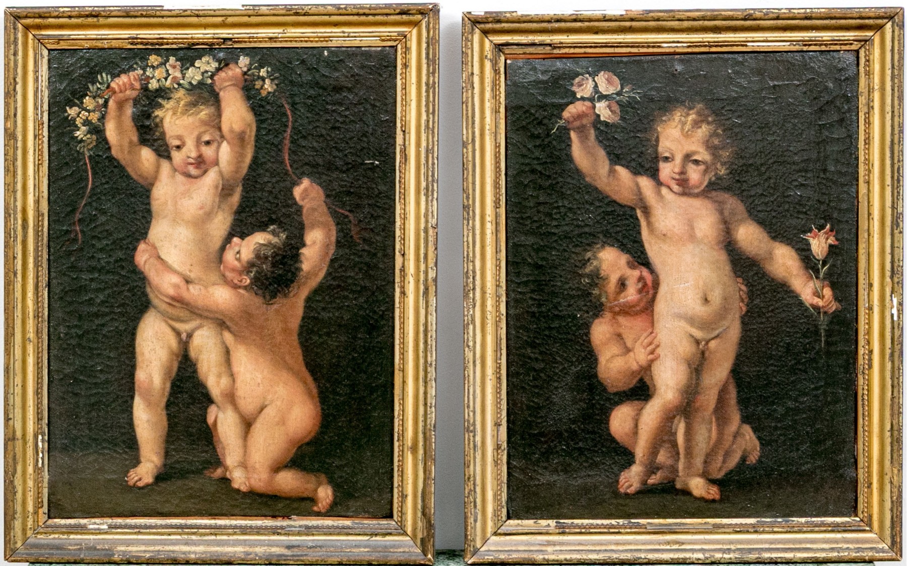 A charming duo of antique oil paintings on canvas depicting similar scenes of two putti. One blonde putto poses standing with flowers in his hands, while another with dark hair kneels around him against dark backgrounds. Appears to be unsigned.