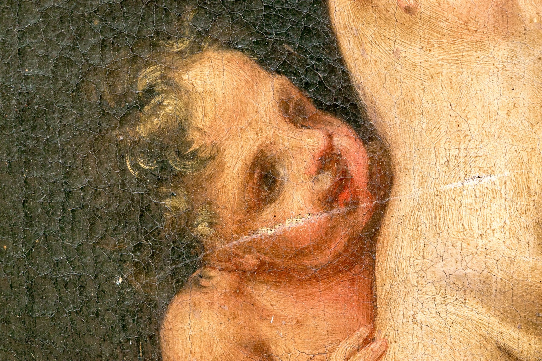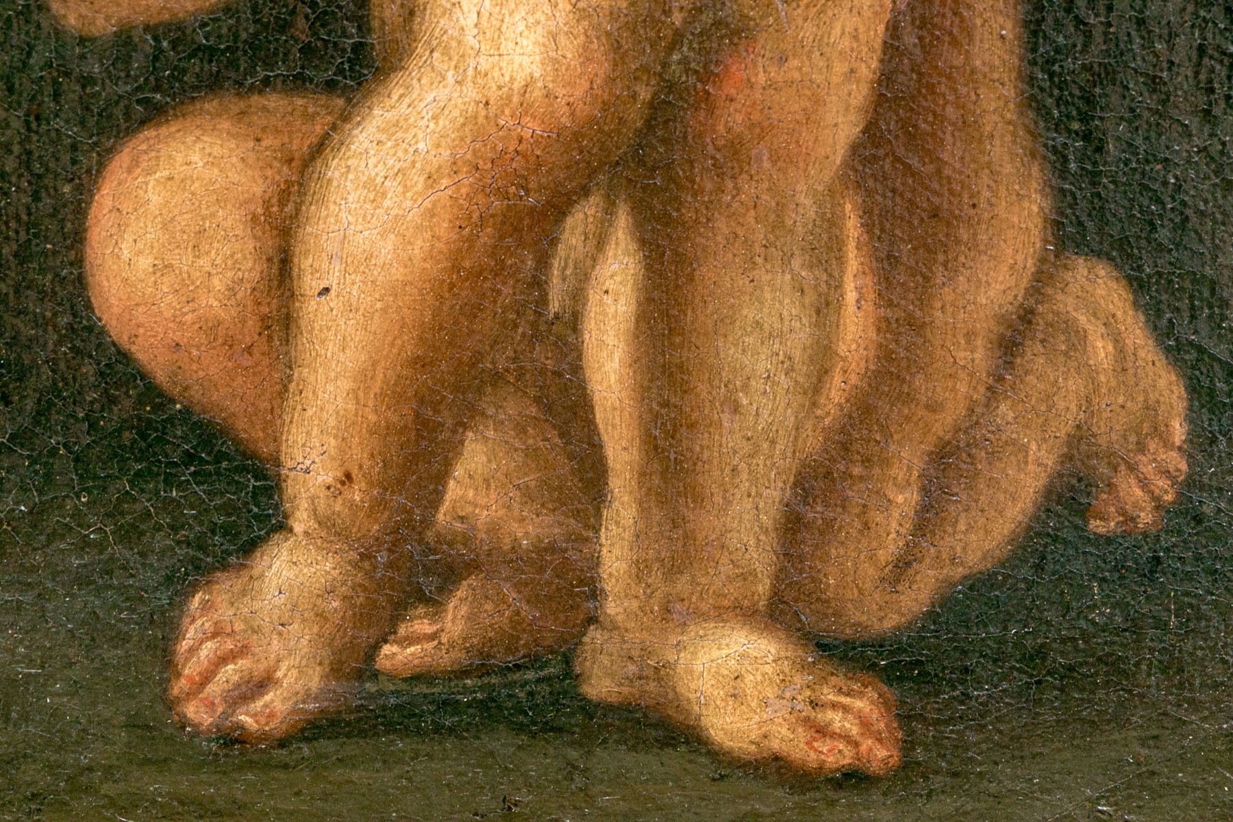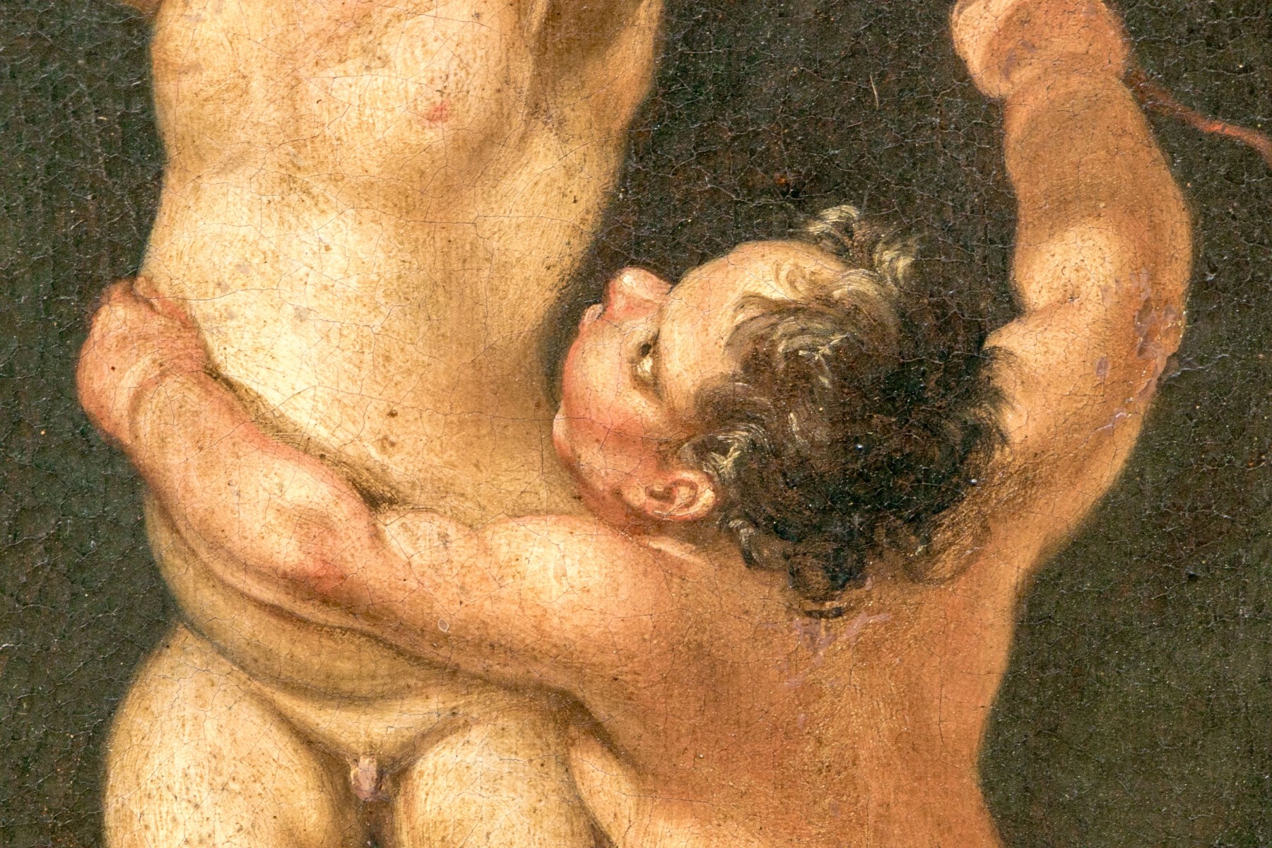 A charming duo of antique oil paintings on canvas depicting similar scenes of two putti. One blonde putto poses standing with flowers in his hands, while another with dark hair kneels around him against dark backgrounds. Appears to be unsigned.