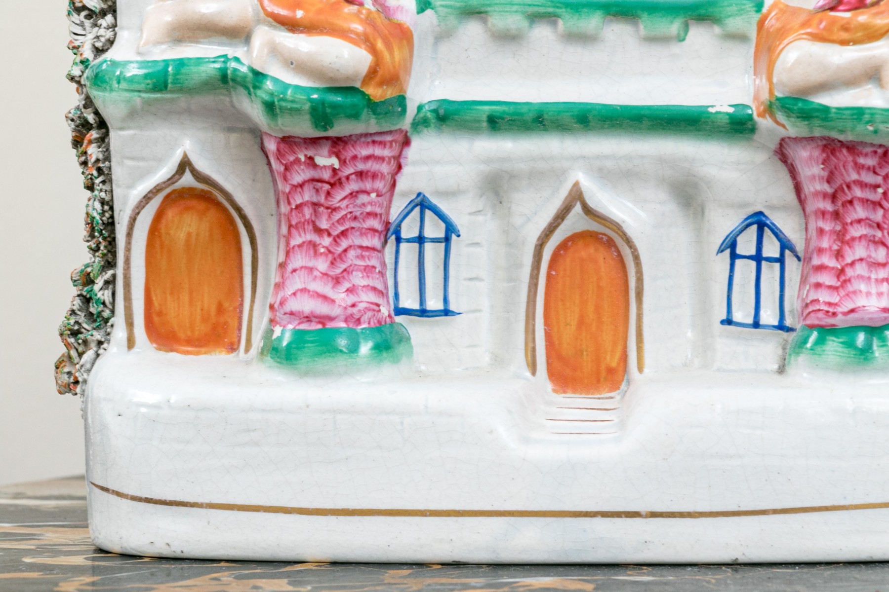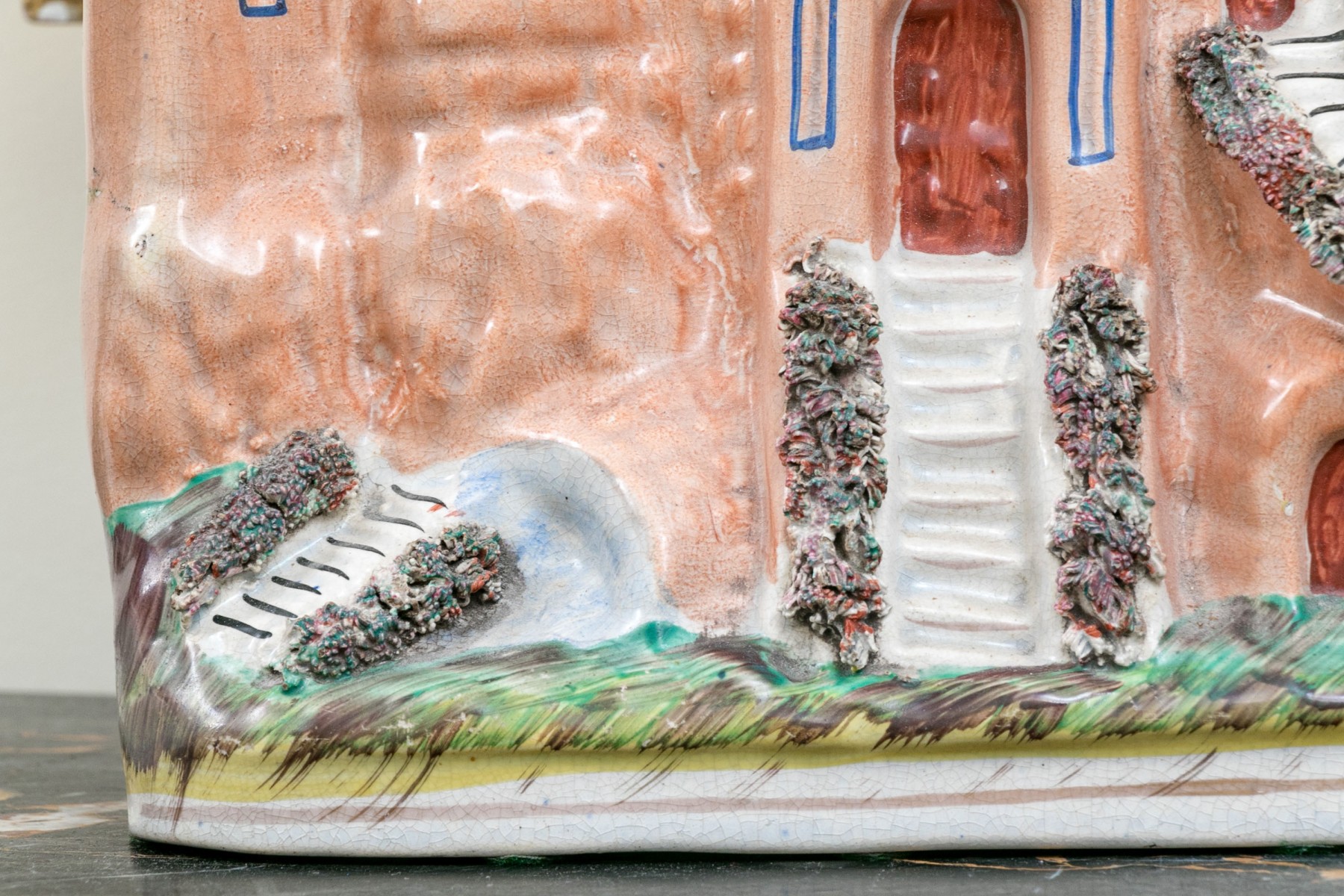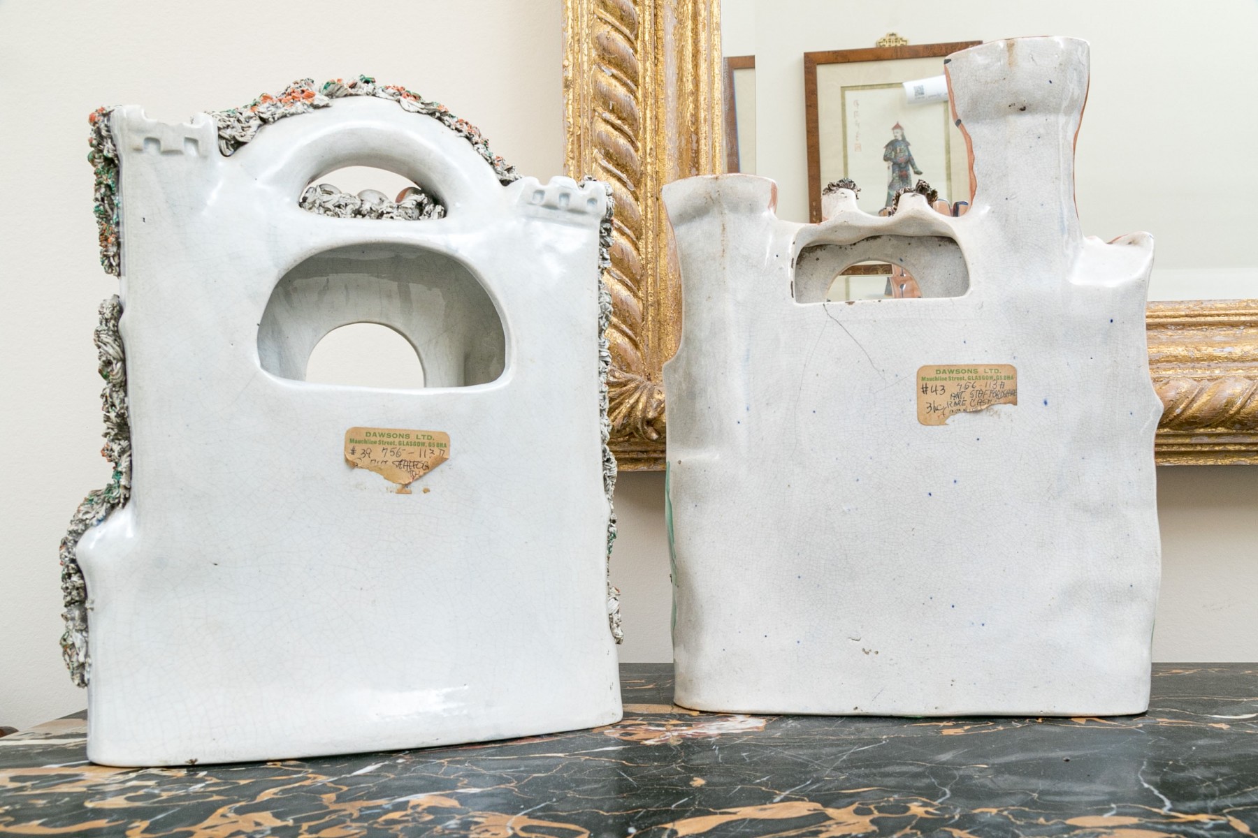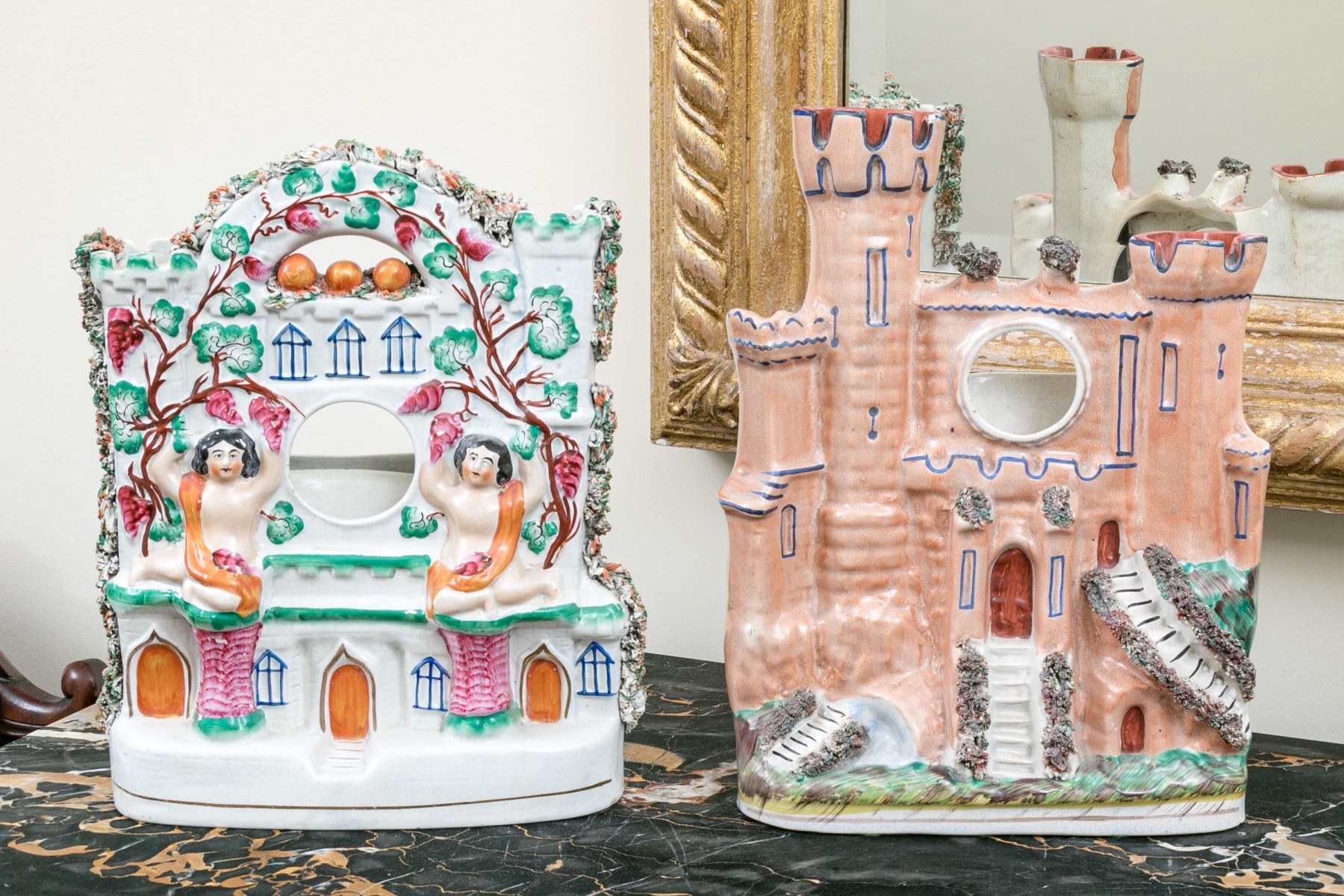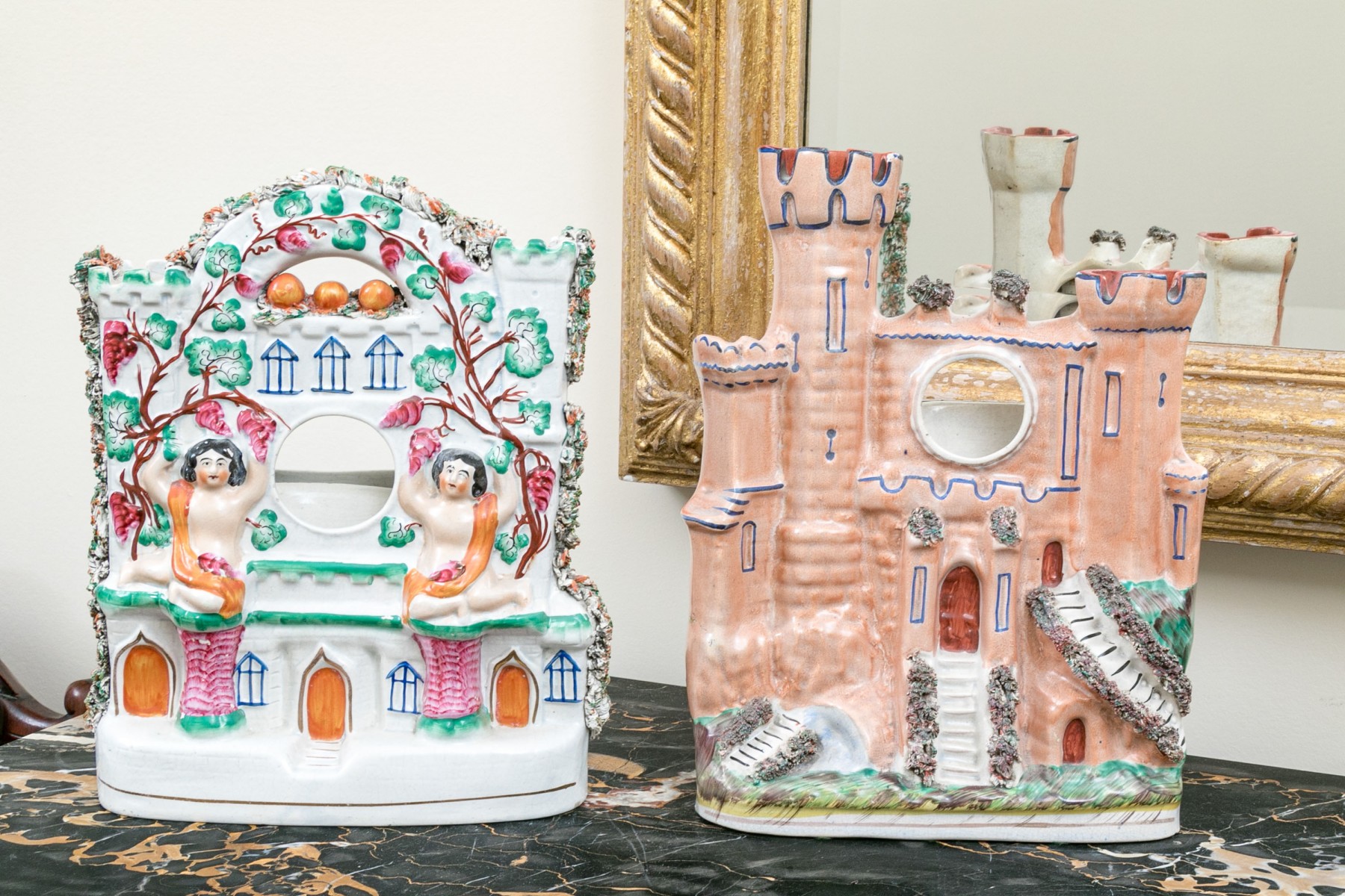 A pair of antique Staffordshire Castle pocket watch holders, each thoughtfully designed with integrated spill vases.
