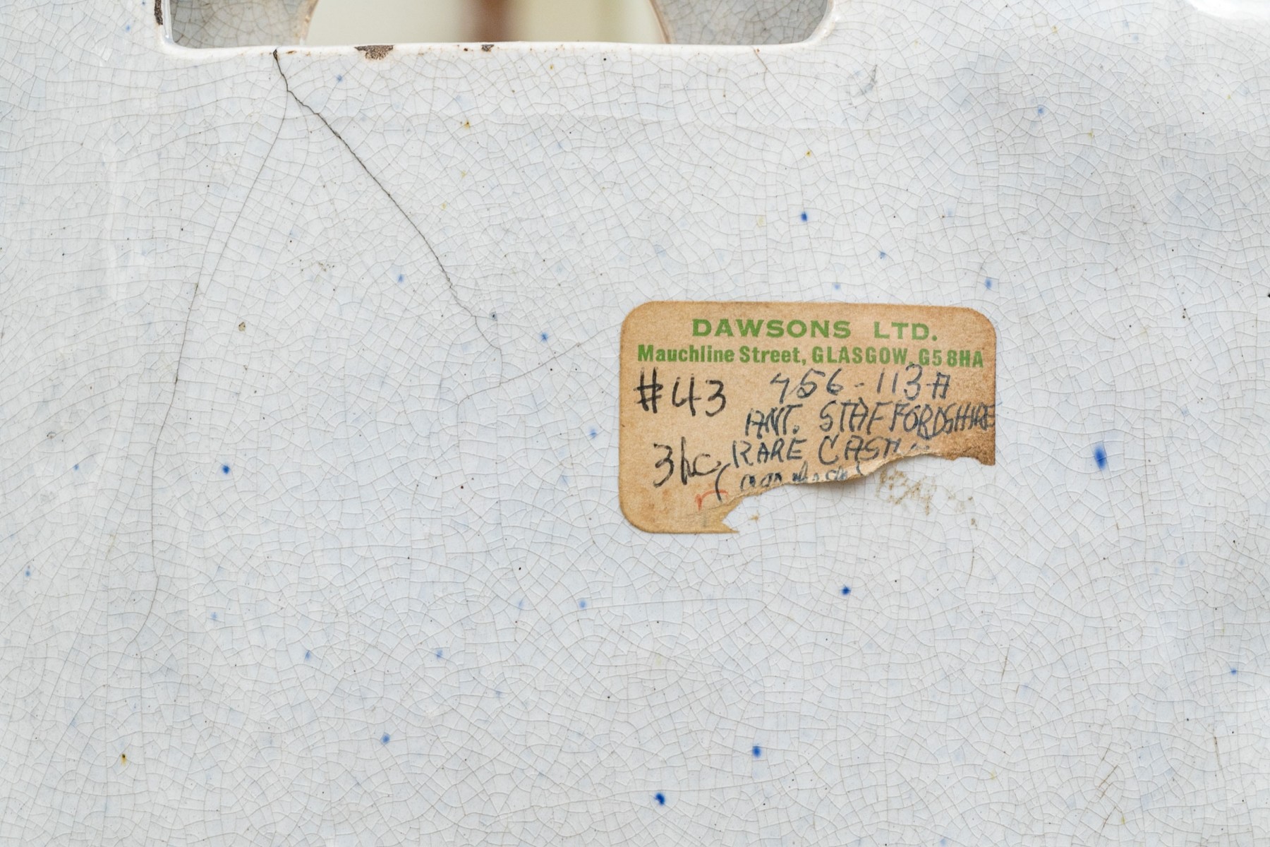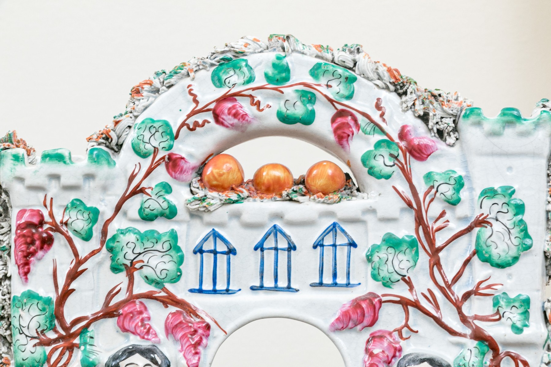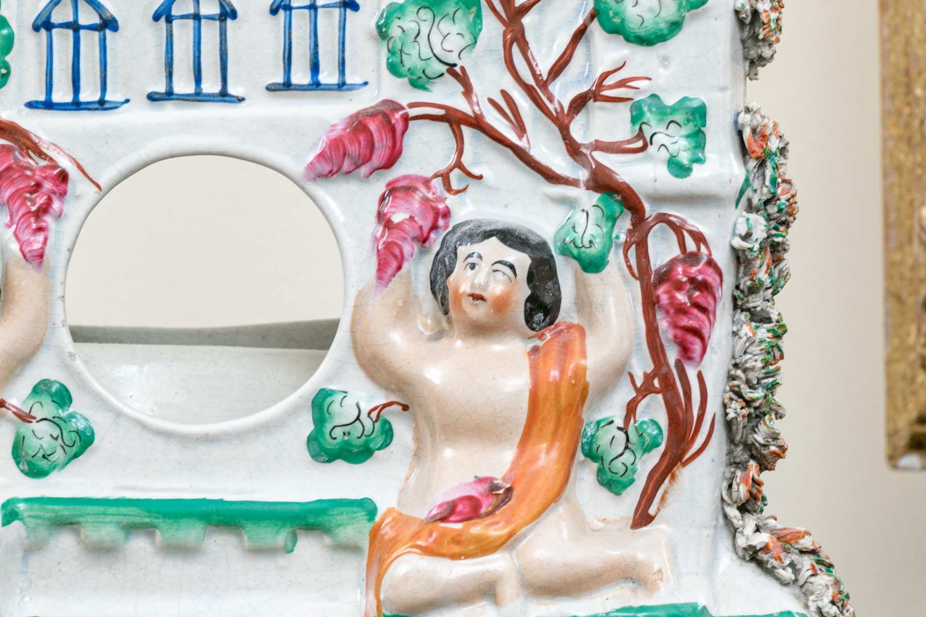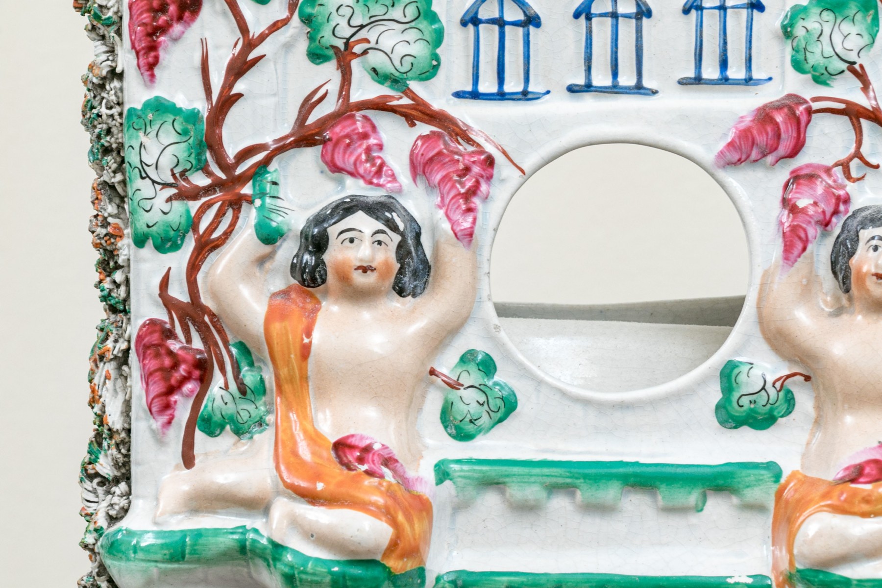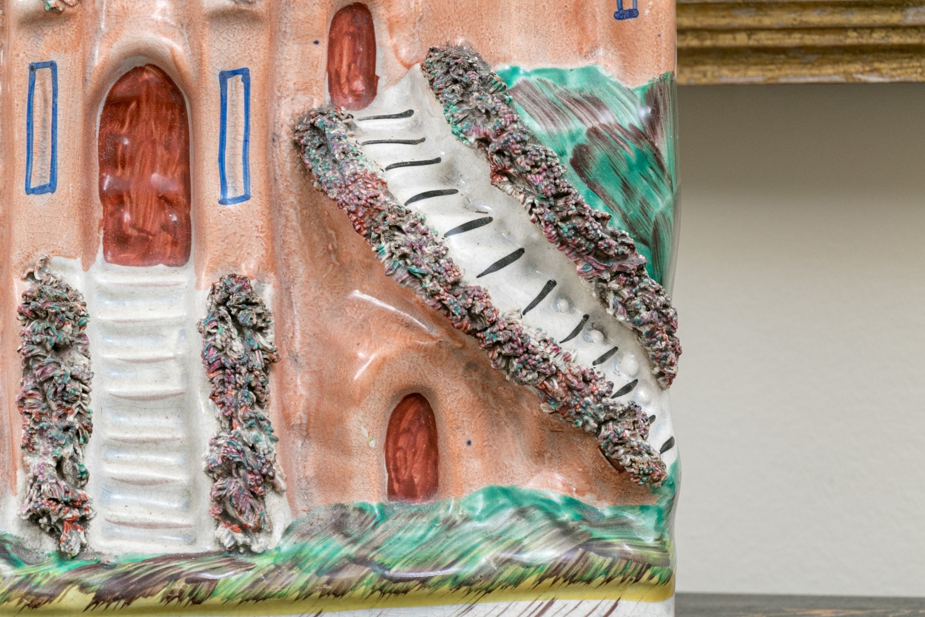 A pair of antique Staffordshire Castle pocket watch holders, each thoughtfully designed with integrated spill vases.