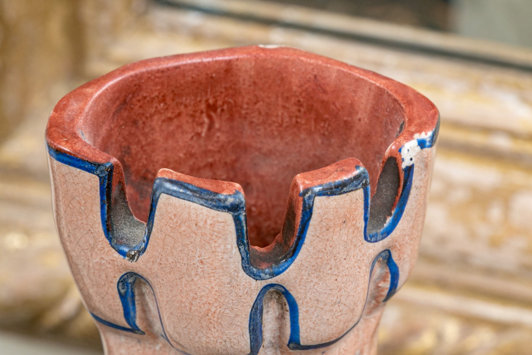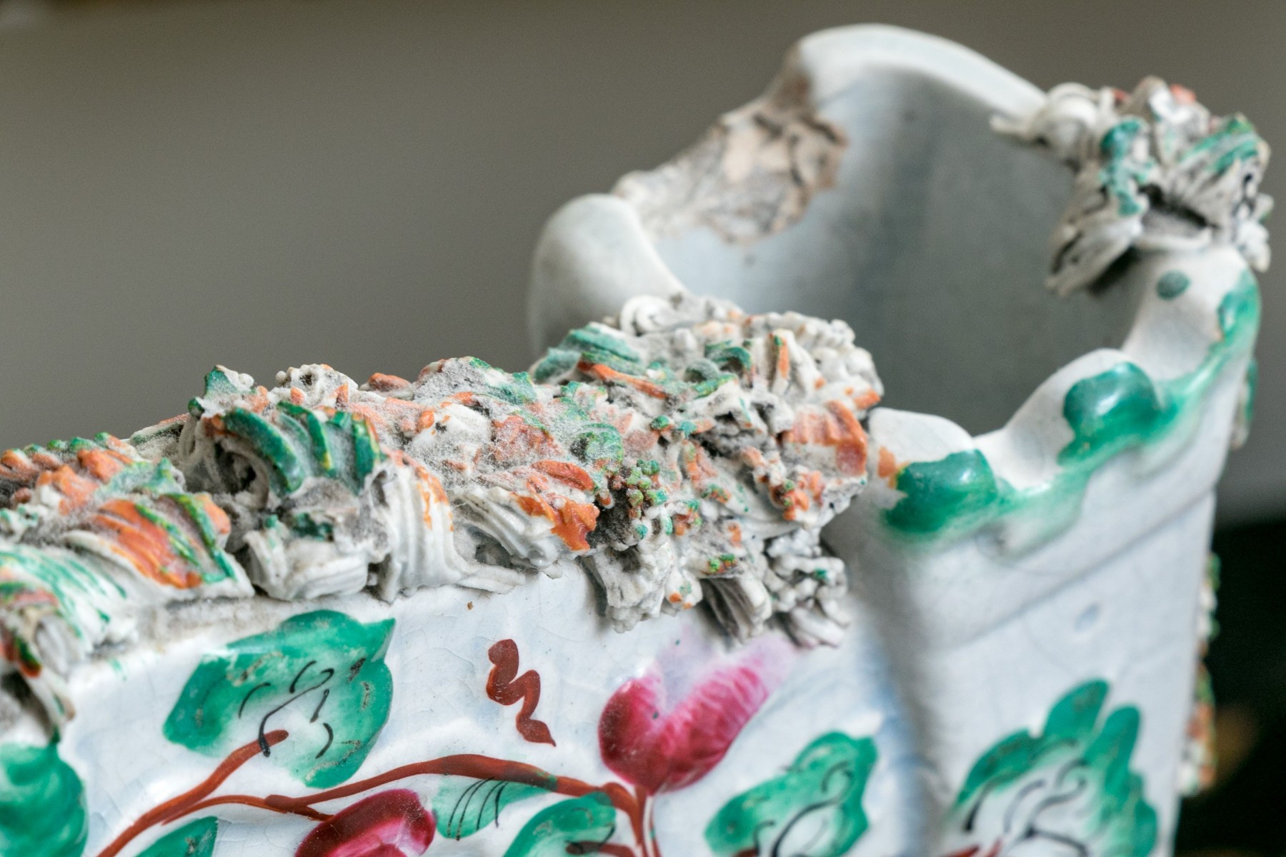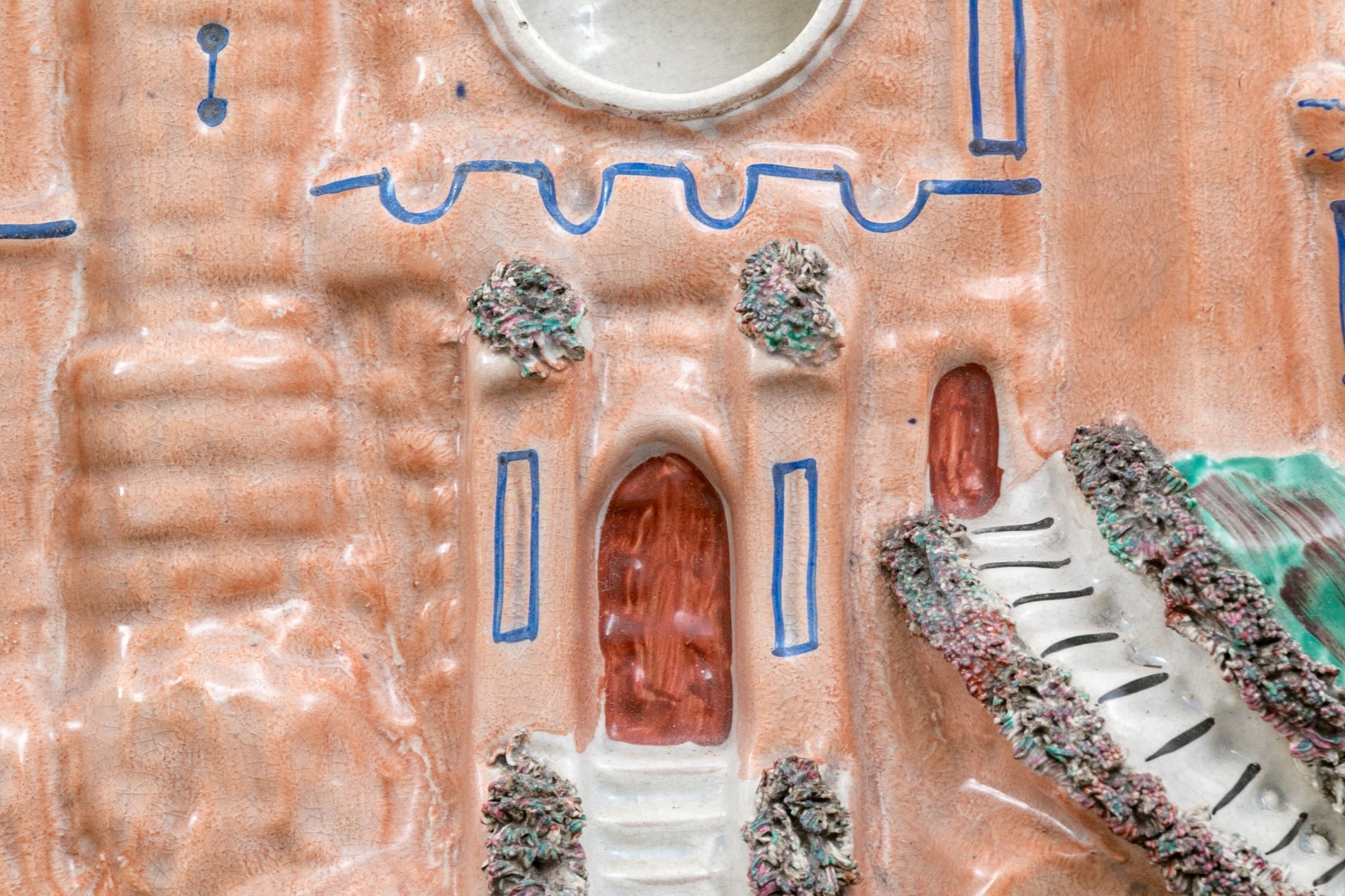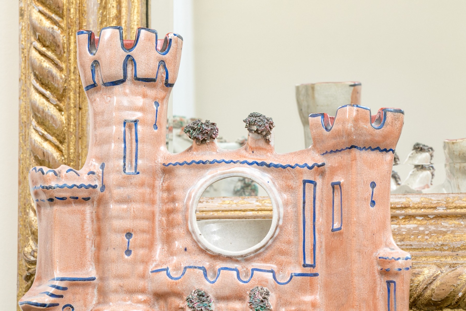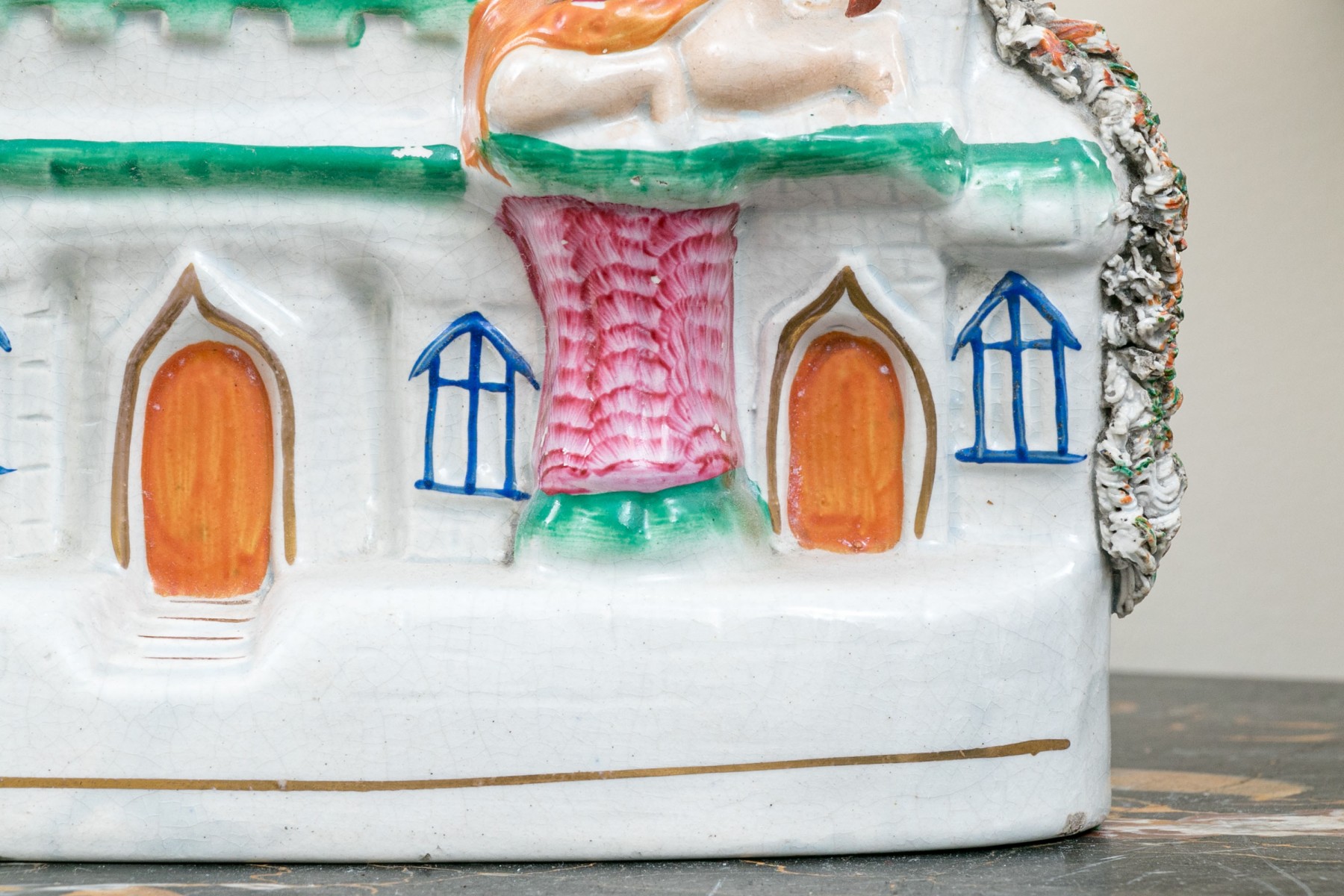 A pair of antique Staffordshire Castle pocket watch holders, each thoughtfully designed with integrated spill vases.