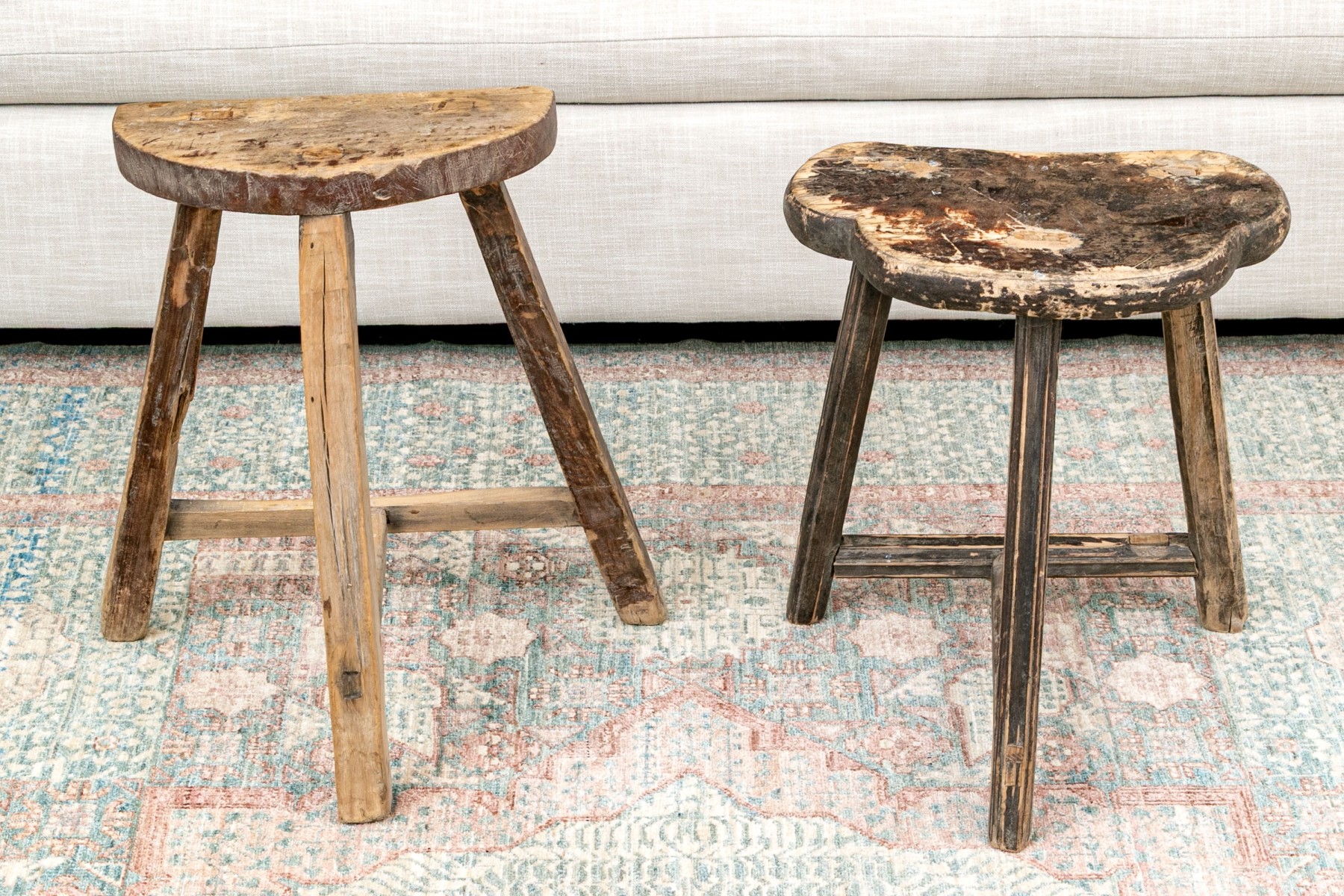 A delightful duo of antique primitive wood stools with great rustic farmhouse appeal. The stools feature demilune seats each over three rectangular legs with T-stretchers connecting by tenon and mortise joinery.